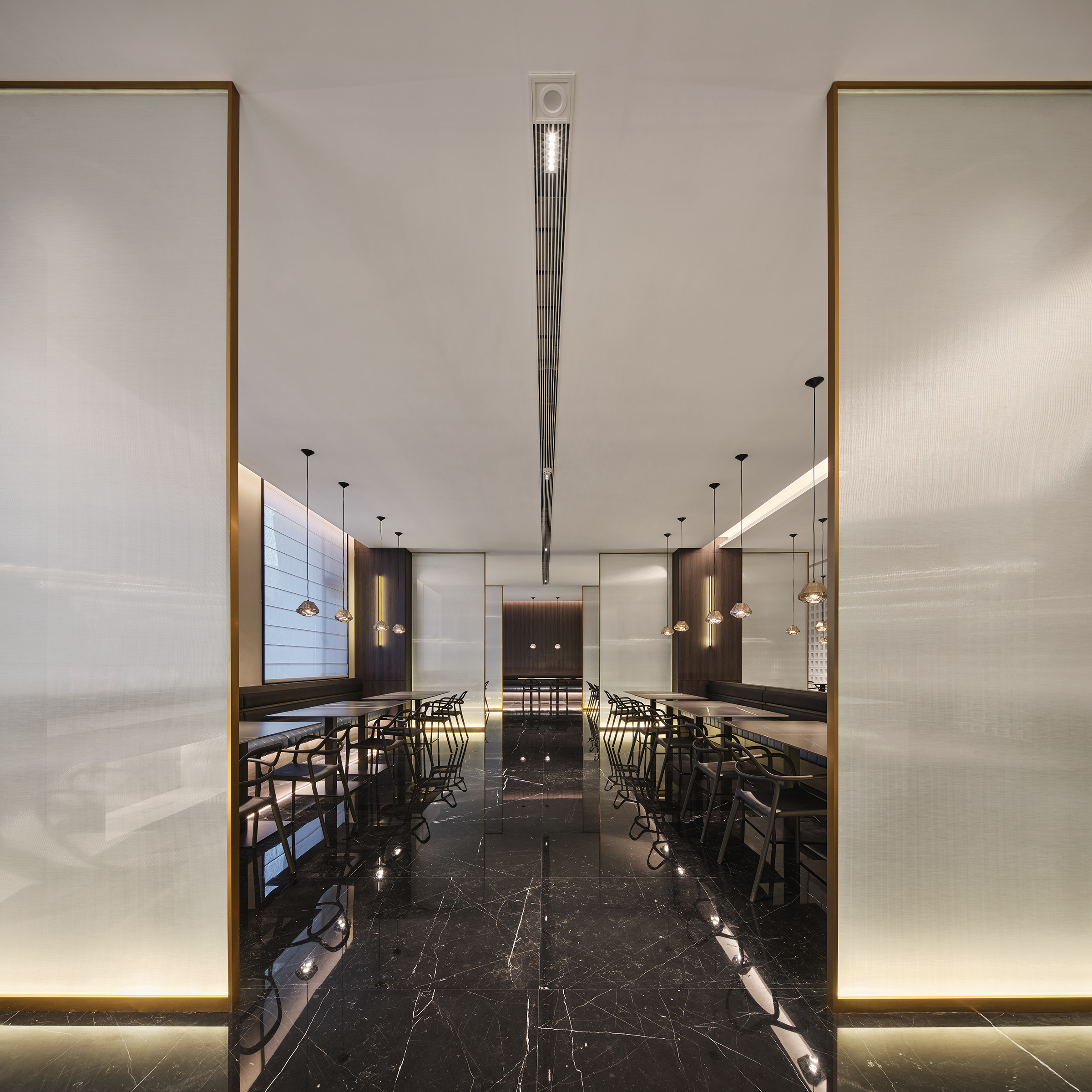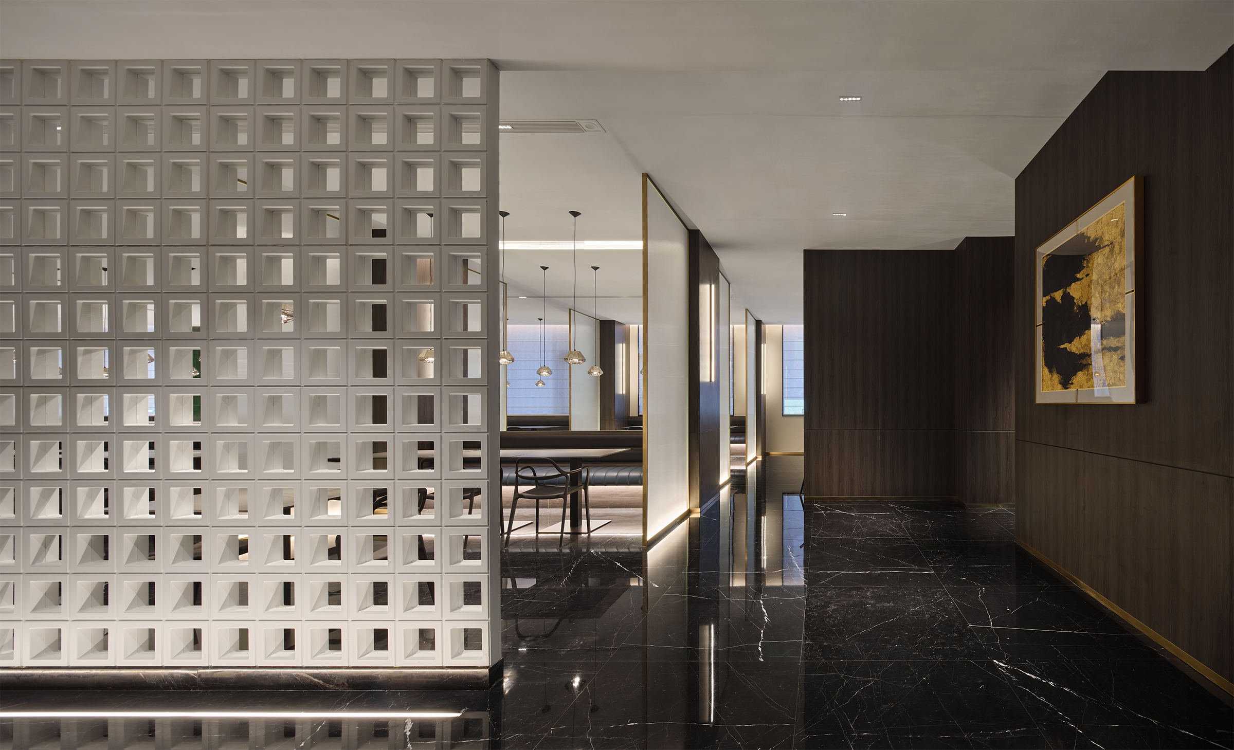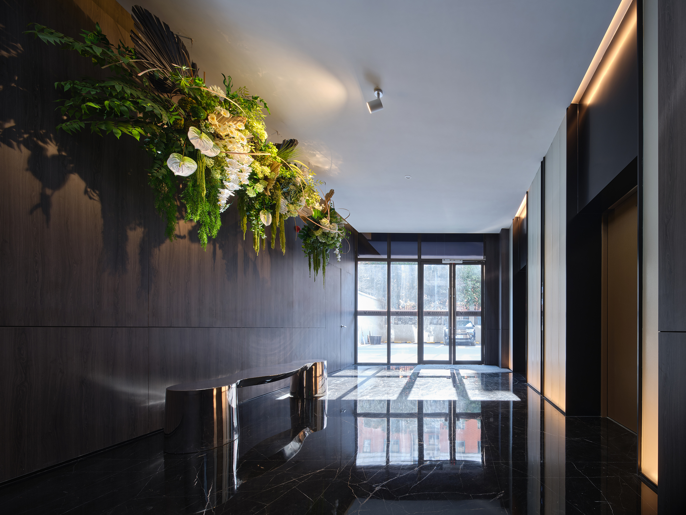 空间布局:环绕式的落地窗将内景与外景的水域与竹林相连接,打破空间的边界。酒店前台与竹墙对立安置、顺道延展,竹墙上倒映着林间余晖,宁静而温柔,述说着自然之美。现代化与自然感的雅致,是人类文明与大自然对话的体现。踏入相对较低的空间,转弯即刻进入狭长的空间。我们捕捉着空间的独有特征,试图赋予它更深层次的意义。于是,我们用镜面不锈钢的材质对空间顶部进行处理,使其呈现出如同峡谷般的窄长感。走进这一空间,个体的渺小与狭长空间形成显著对比,将真实体验转化为对空间本质的感知。