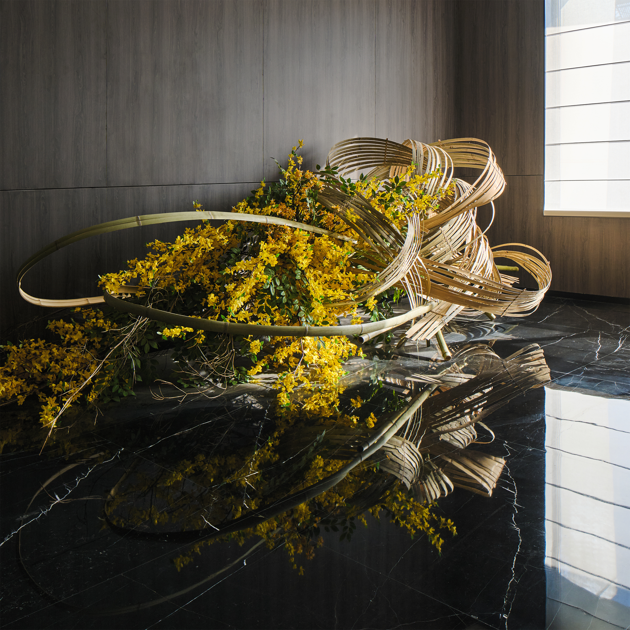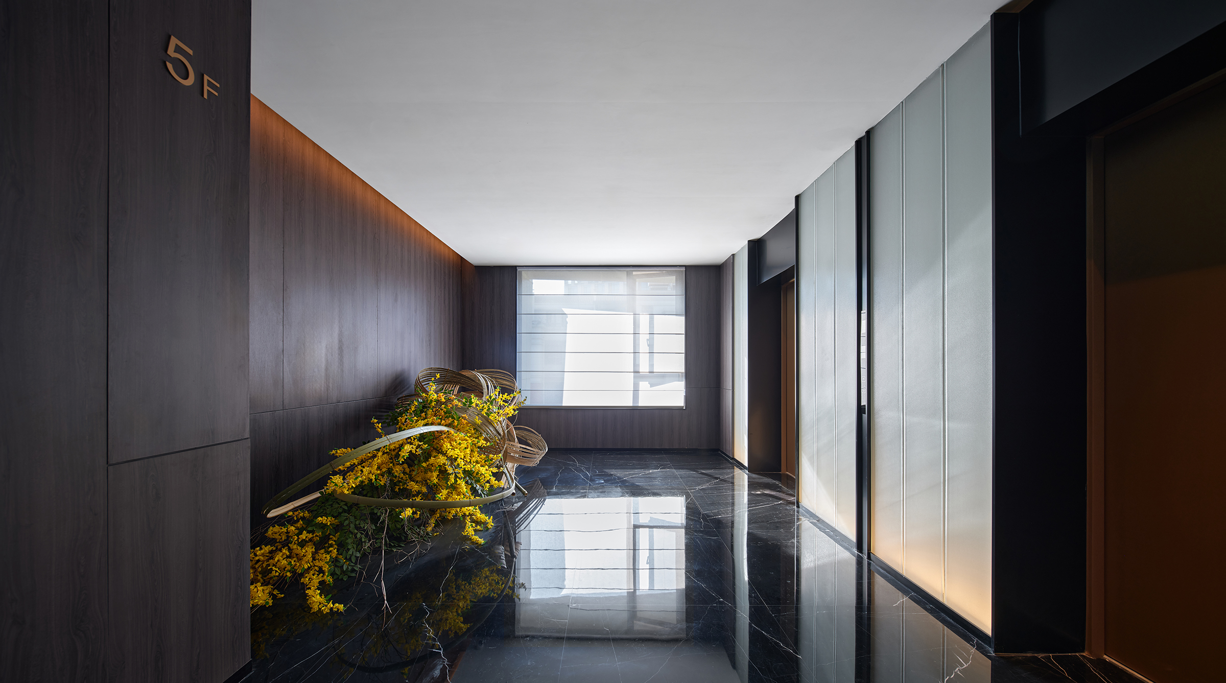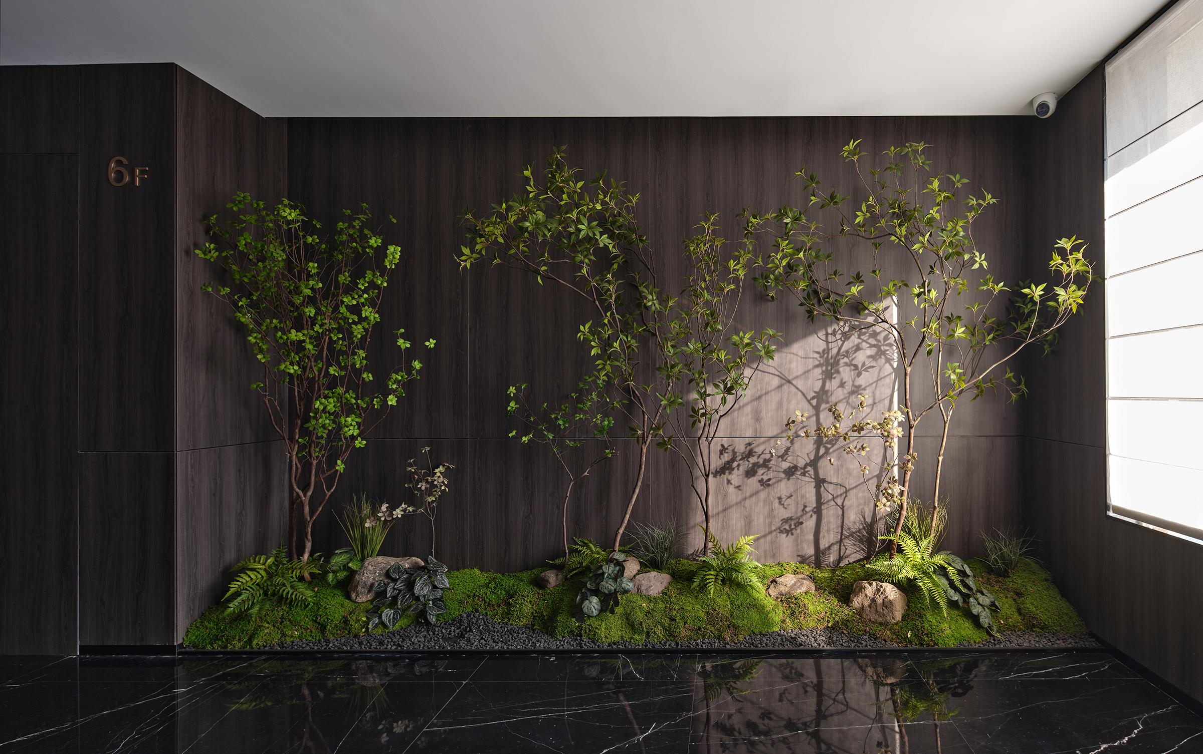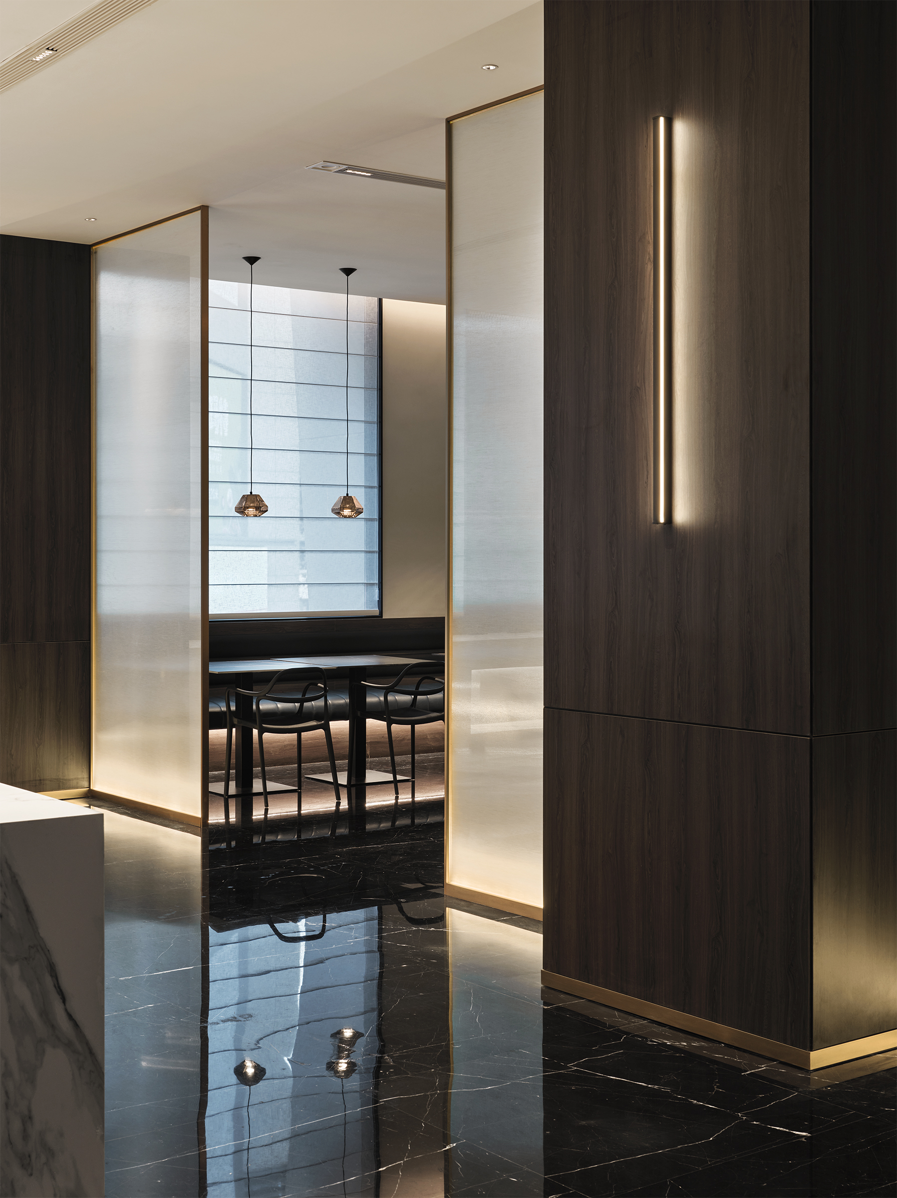 空间布局:环绕式的落地窗将内景与外景的水域与竹林相连接,打破空间的边界。酒店前台与竹墙对立安置、顺道延展,竹墙上倒映着林间余晖,宁静而温柔,述说着自然之美。现代化与自然感的雅致,是人类文明与大自然对话的体现。踏入相对较低的空间,转弯即刻进入狭长的空间。我们捕捉着空间的独有特征,试图赋予它更深层次的意义。于是,我们用镜面不锈钢的材质对空间顶部进行处理,使其呈现出如同峡谷般的窄长感。走进这一空间,个体的渺小与狭长空间形成显著对比,将真实体验转化为对空间本质的感知。