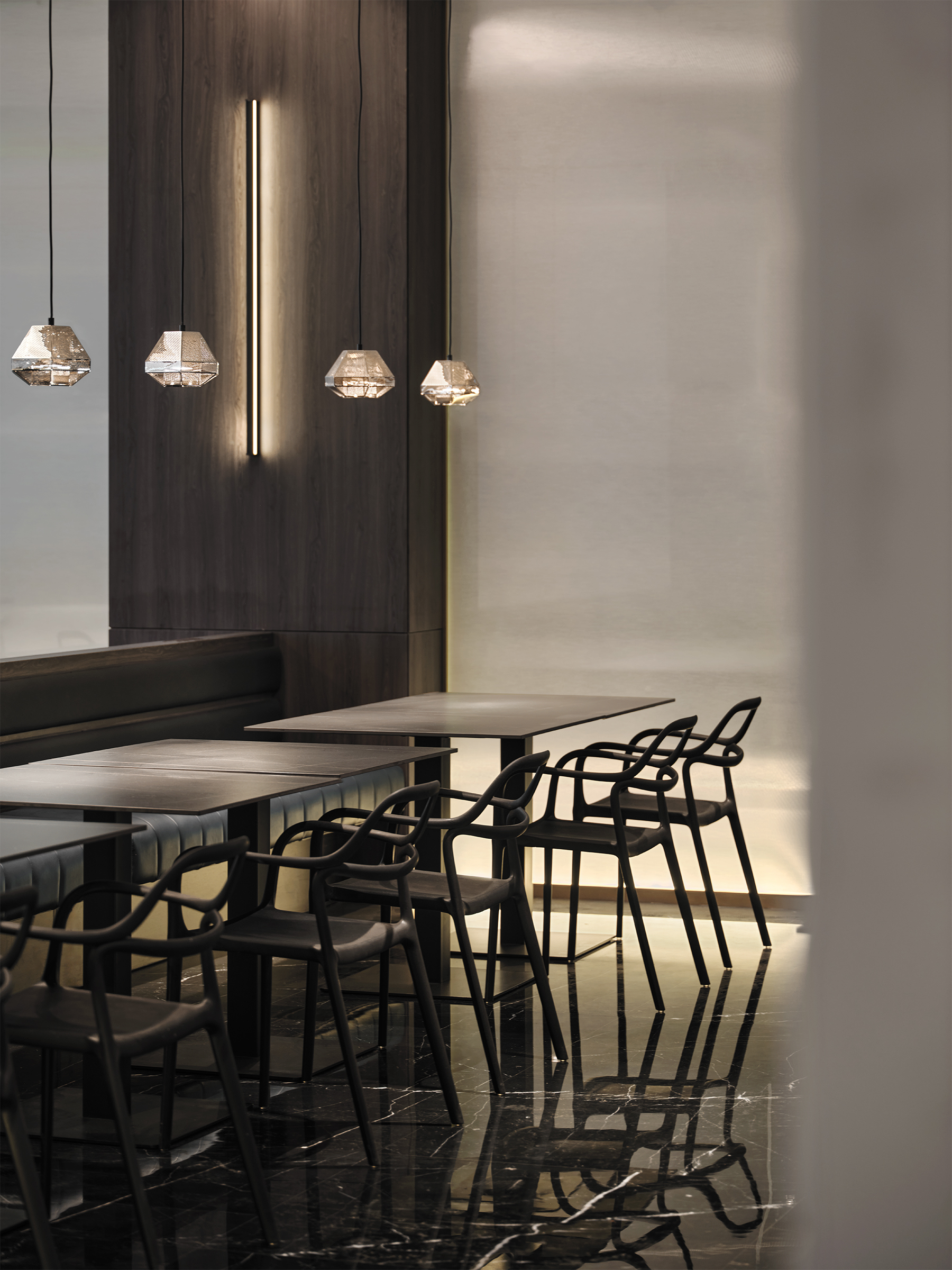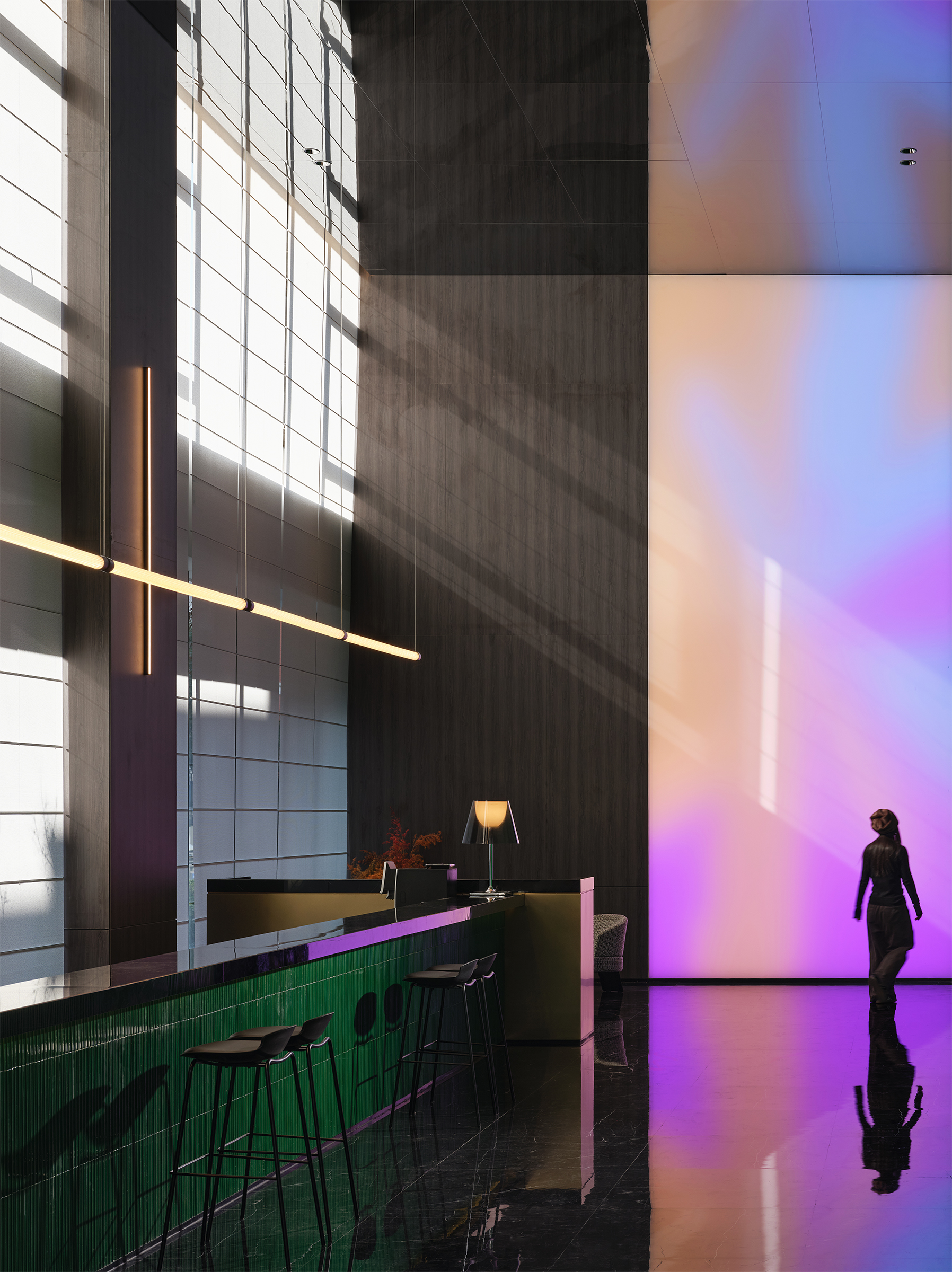 项目定位:在设计V+这家酒店时,我们希望进入酒店的第一感觉是存在一张持续变换的面孔,用艺术灯光装置的表达手法,用灯光演绎二维与三维之间的模糊关系,并且给到到访入住的客人一种态度,一个画面,也是一场欢迎仪式。
