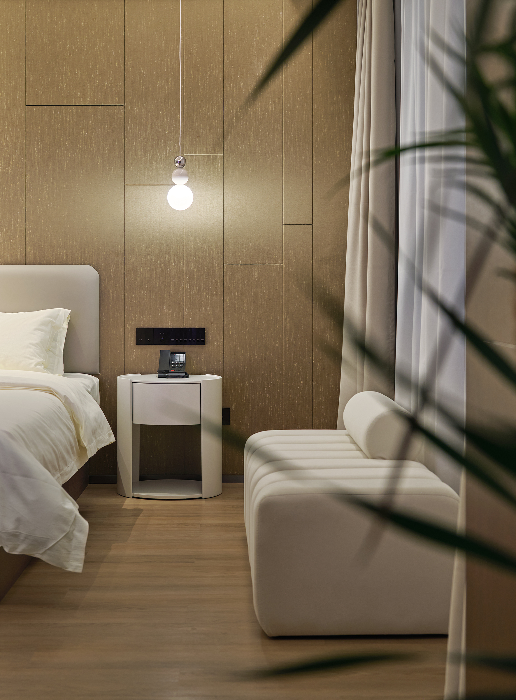 设计选材:空间主材:绿色釉面砖 大理石 灯光膜 金属 U形玻璃 艺术涂料。顶部发光的盒子从入口一直延伸到内部,穿透整个空间。雕塑“竹”的介入,是仪式感的加持,也是盒子的重要结构支撑。以代表性的安吉竹为灵感,把外景引入室内,勾勒出地域特色和酒店氛围。电梯厅延续了大堂的设计风格,通过落地窗把外界的景致带入室内,天然的背景板似一幅动态画卷。客房的墙壁与背板源于竹,清新生机,把竹林风光揽进室内,化为己有。窗口眺望,远处的茶园、弥散的岚雾和朦胧的山峦轮廓若隐若现。
