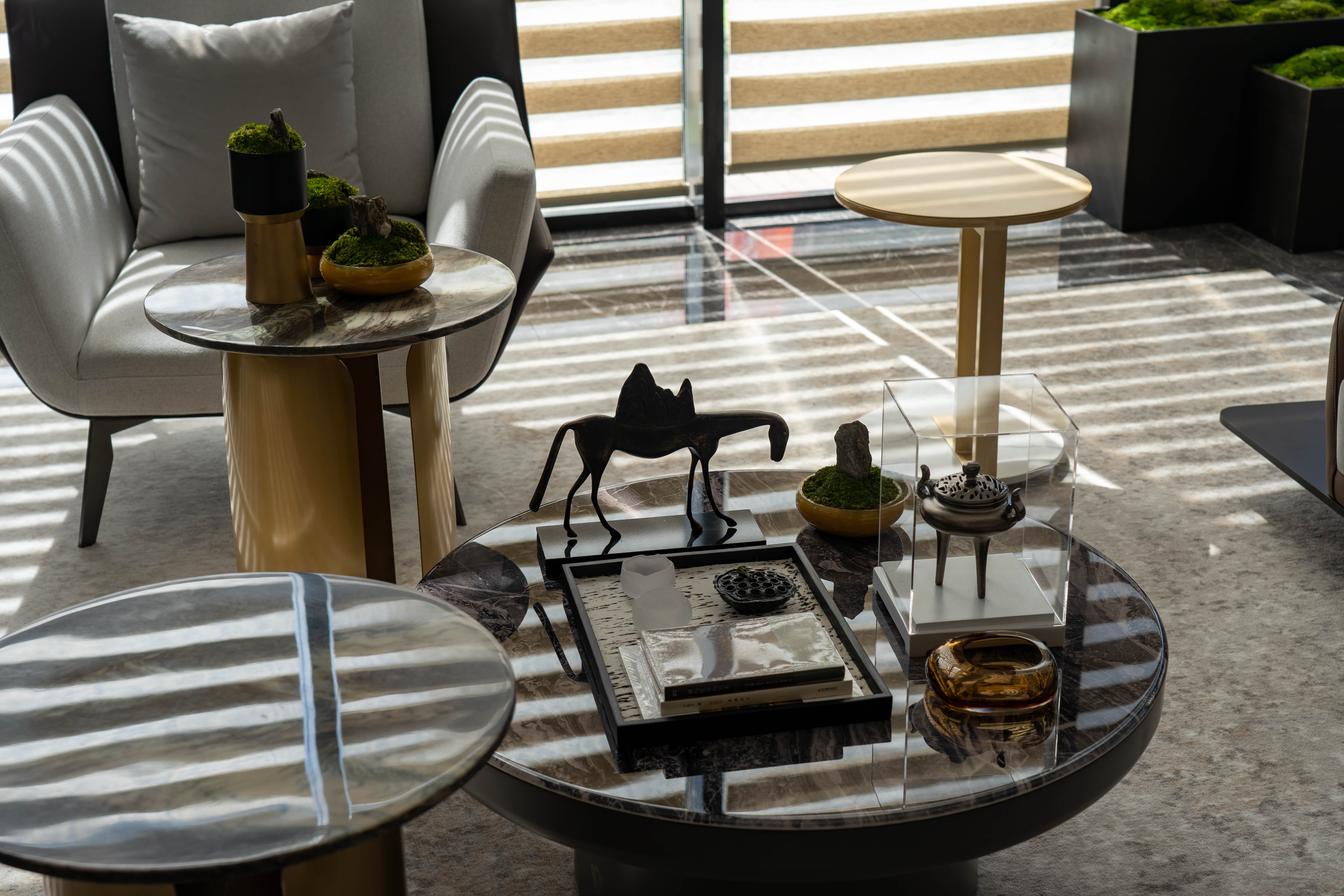 通过自然形态的摆件、曲线流动的家具,以及富有层次感的纺织品来体现这一元素。云的轻盈与水的灵动相得益彰,赋予空间一种柔和的流动感,使得整个环境看似静止,却在细节中暗含动态。