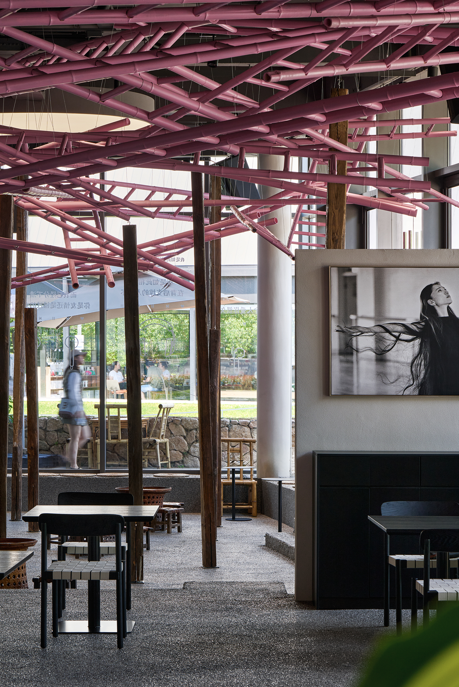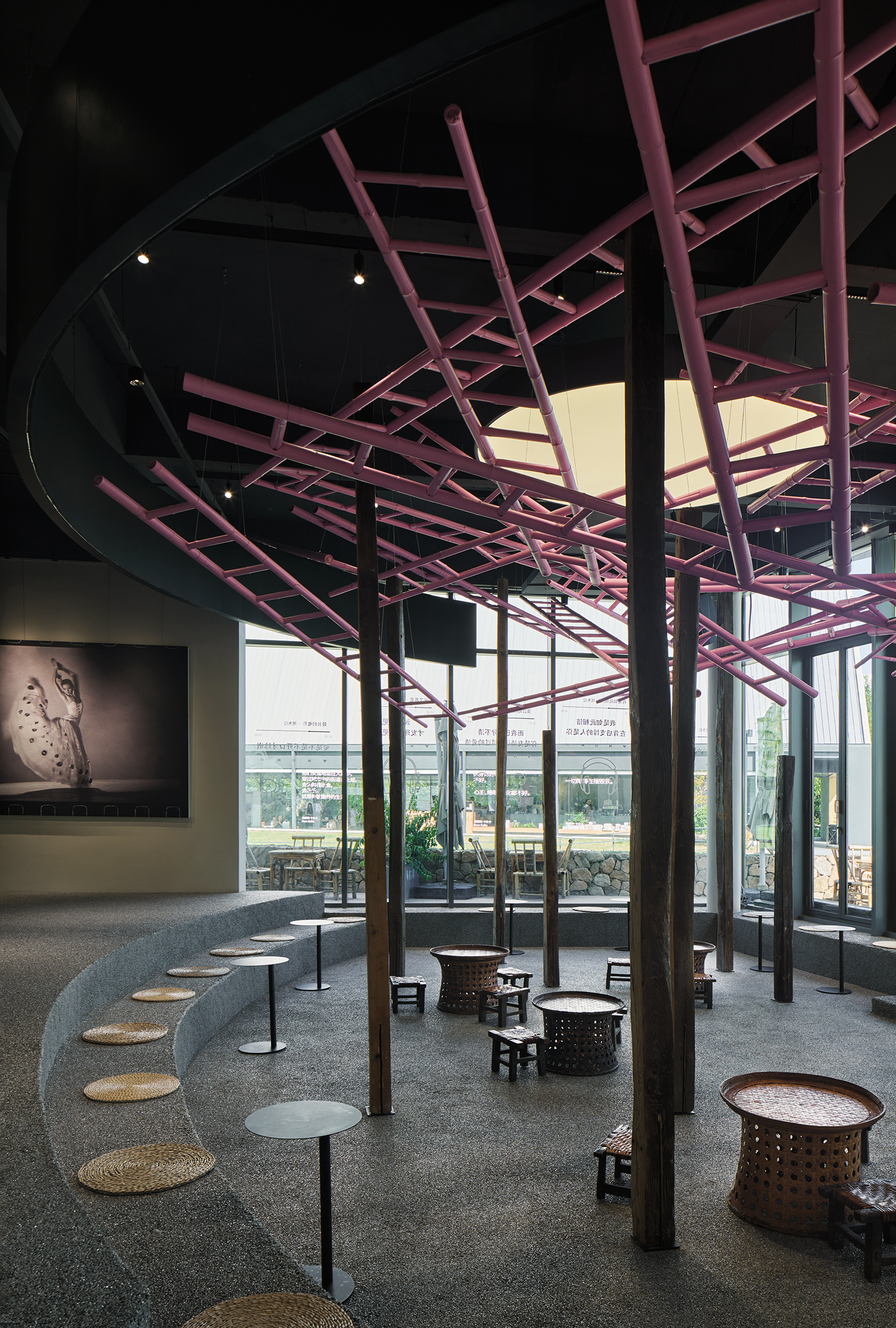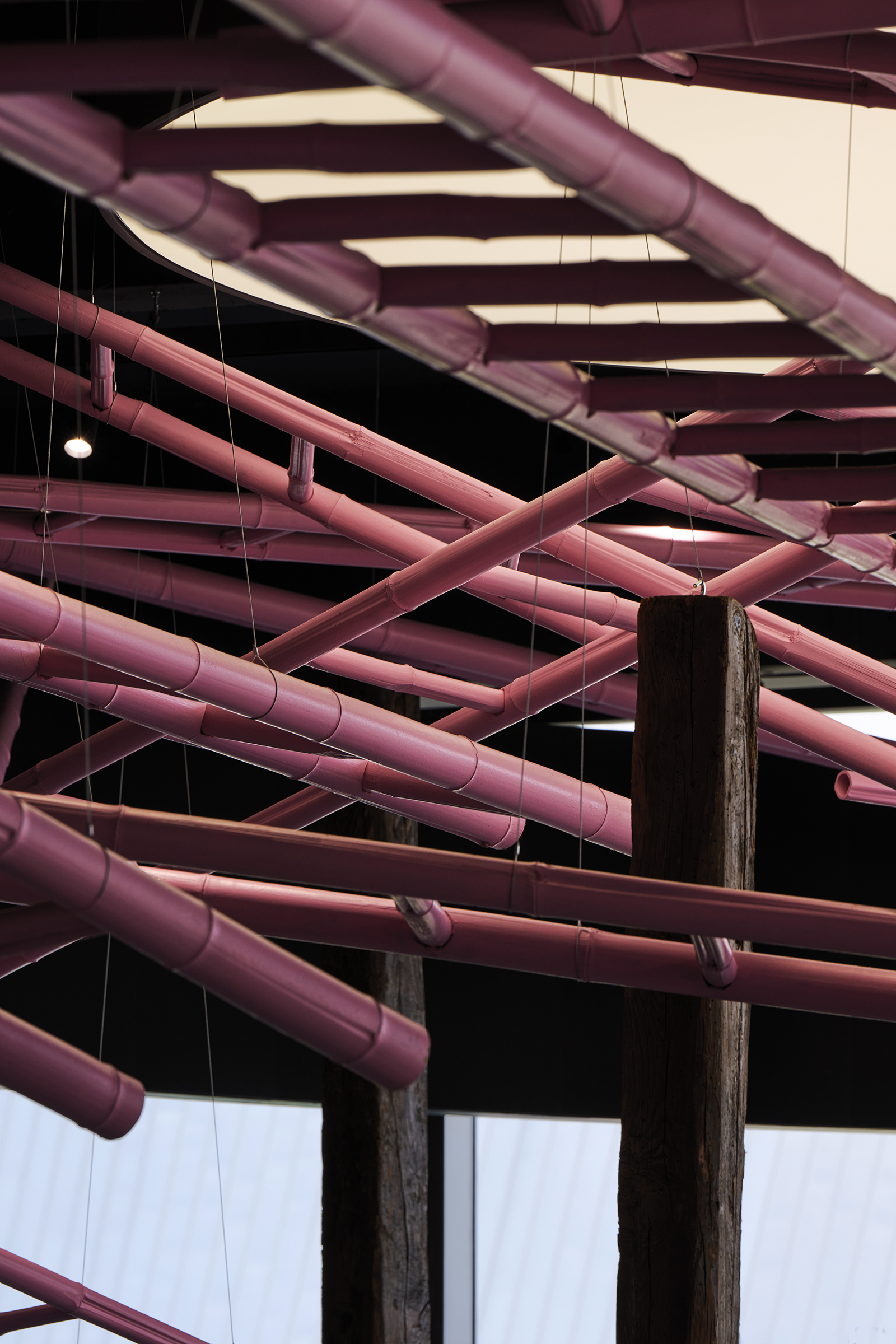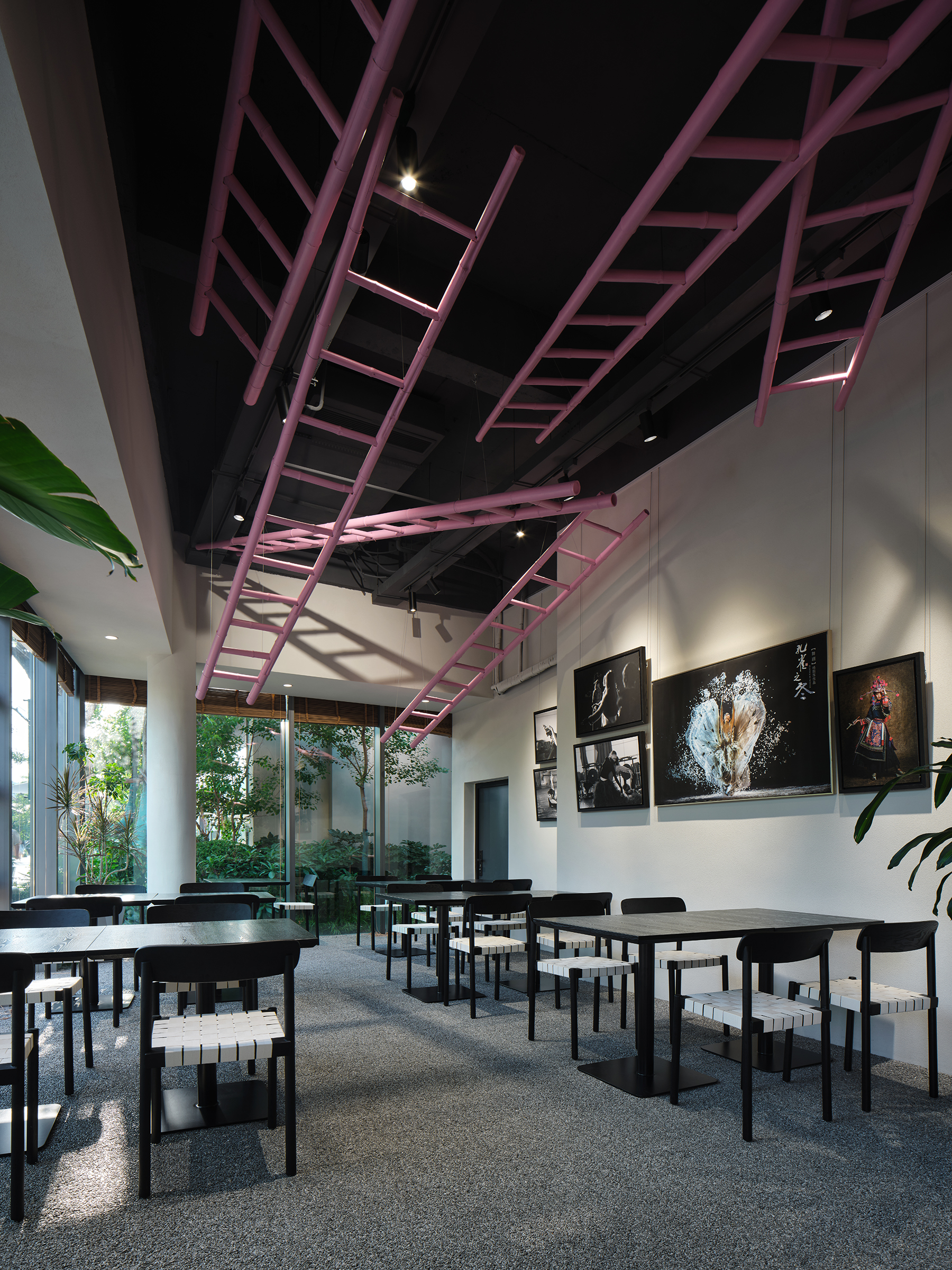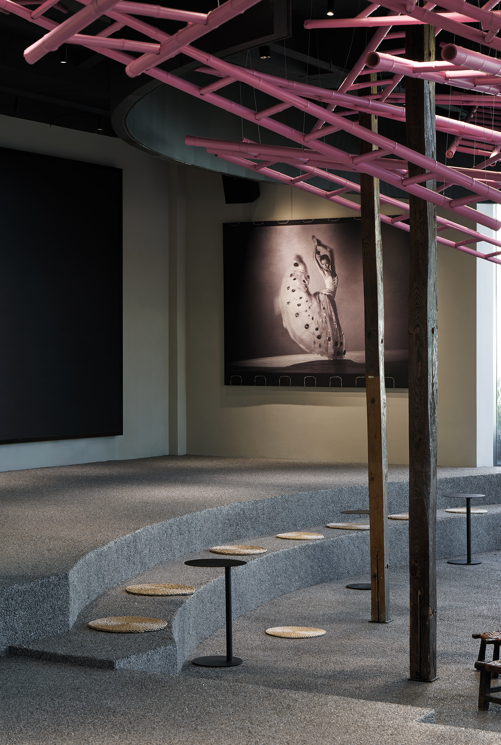 得益于优秀的层高,自重较轻的粉色竹梯满布空间,悬在座位区域的上方,竹字所代表的传统语言,被饰以当代的粉色,在空间中舞蹈,柔和了空间的光线。而为了让竹梯成为空间的亮点,我们统一了空间的色彩,将过多的空间色彩和材质统一,铺设了灰色干粘石、也将墙面统一为灰色的艺术涂料,将重心聚焦于空间本身。
