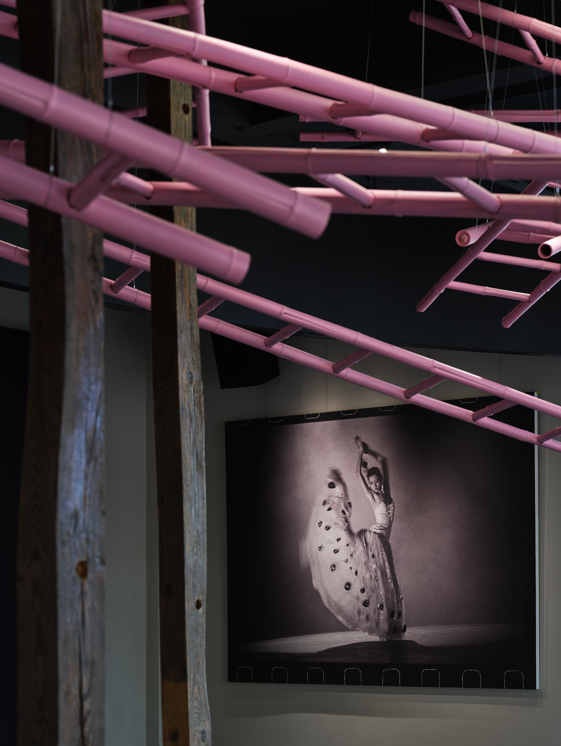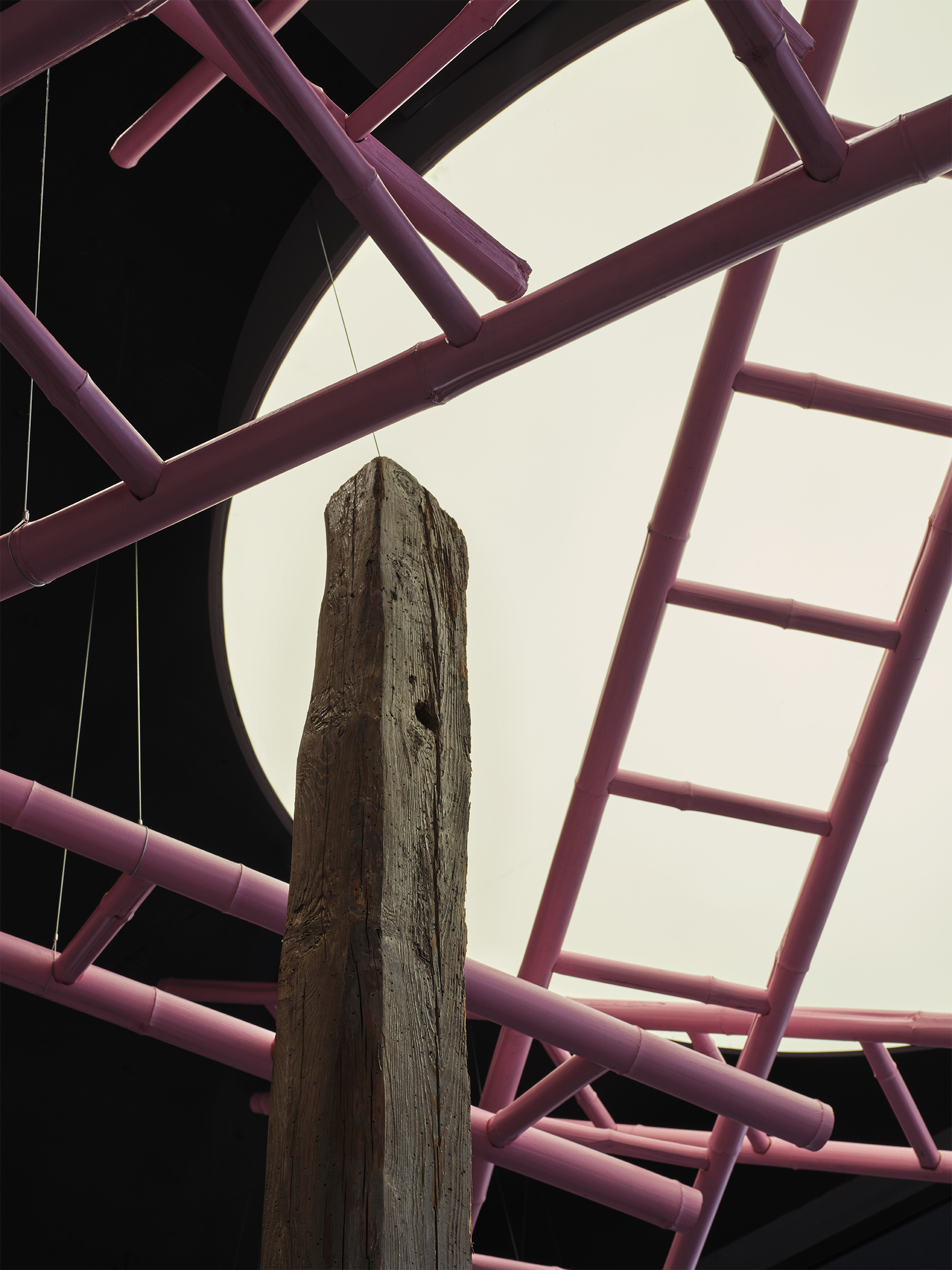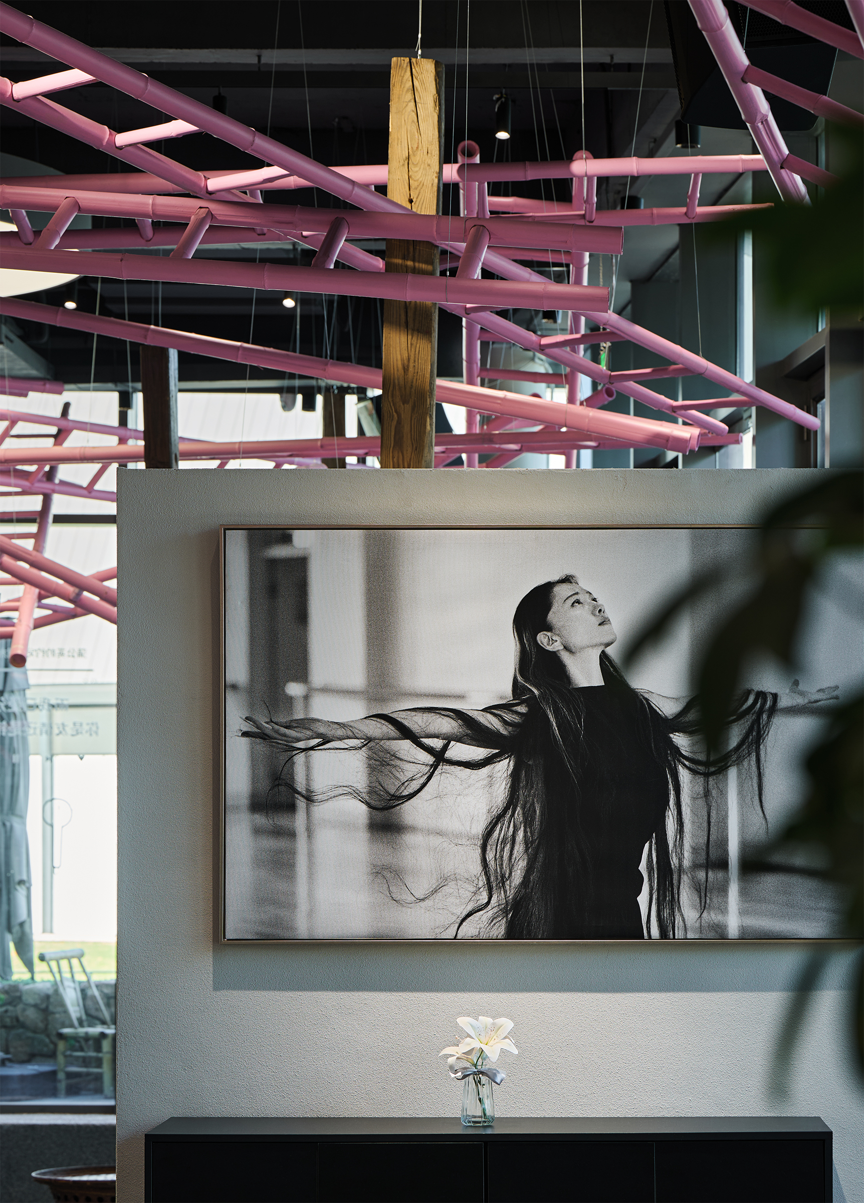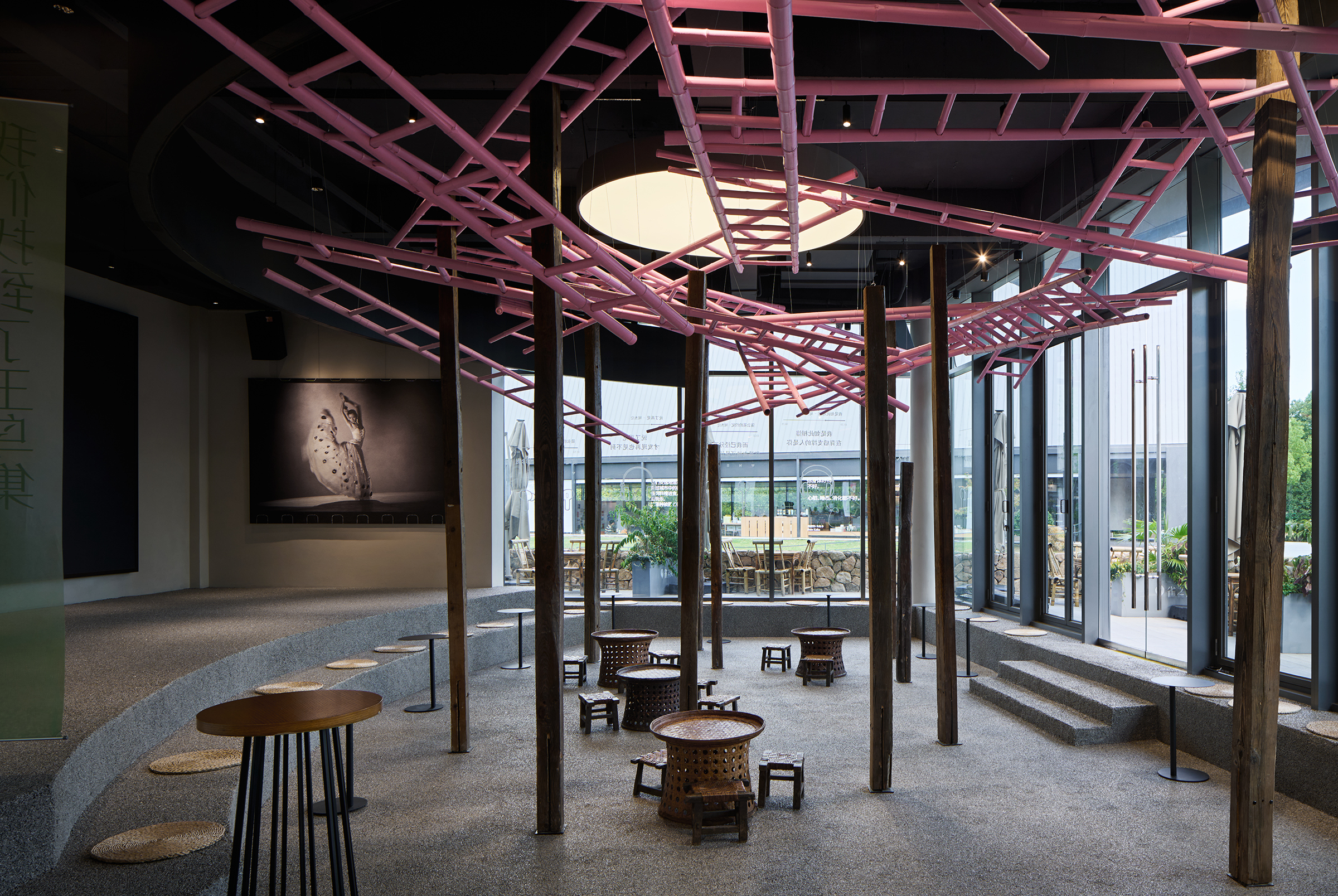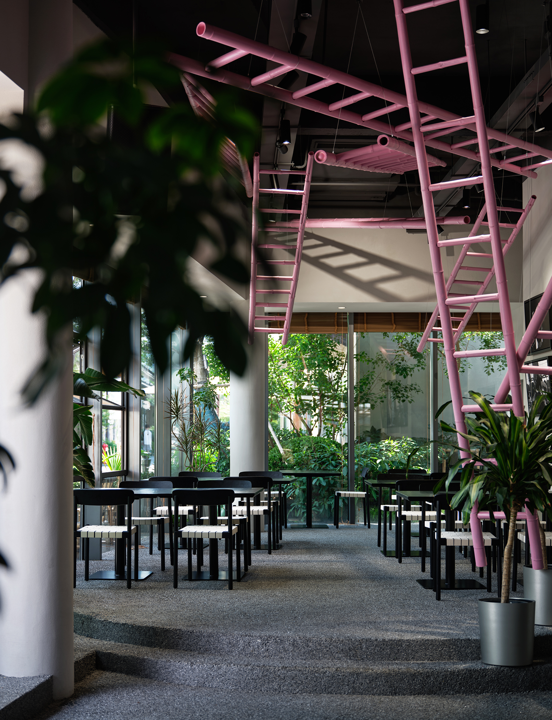 得益于优秀的层高,自重较轻的粉色竹梯满布空间,悬在座位区域的上方,竹字所代表的传统语言,被饰以当代的粉色,在空间中舞蹈,柔和了空间的光线。而为了让竹梯成为空间的亮点,我们统一了空间的色彩,将过多的空间色彩和材质统一,铺设了灰色干粘石、也将墙面统一为灰色的艺术涂料,将重心聚焦于空间本身。