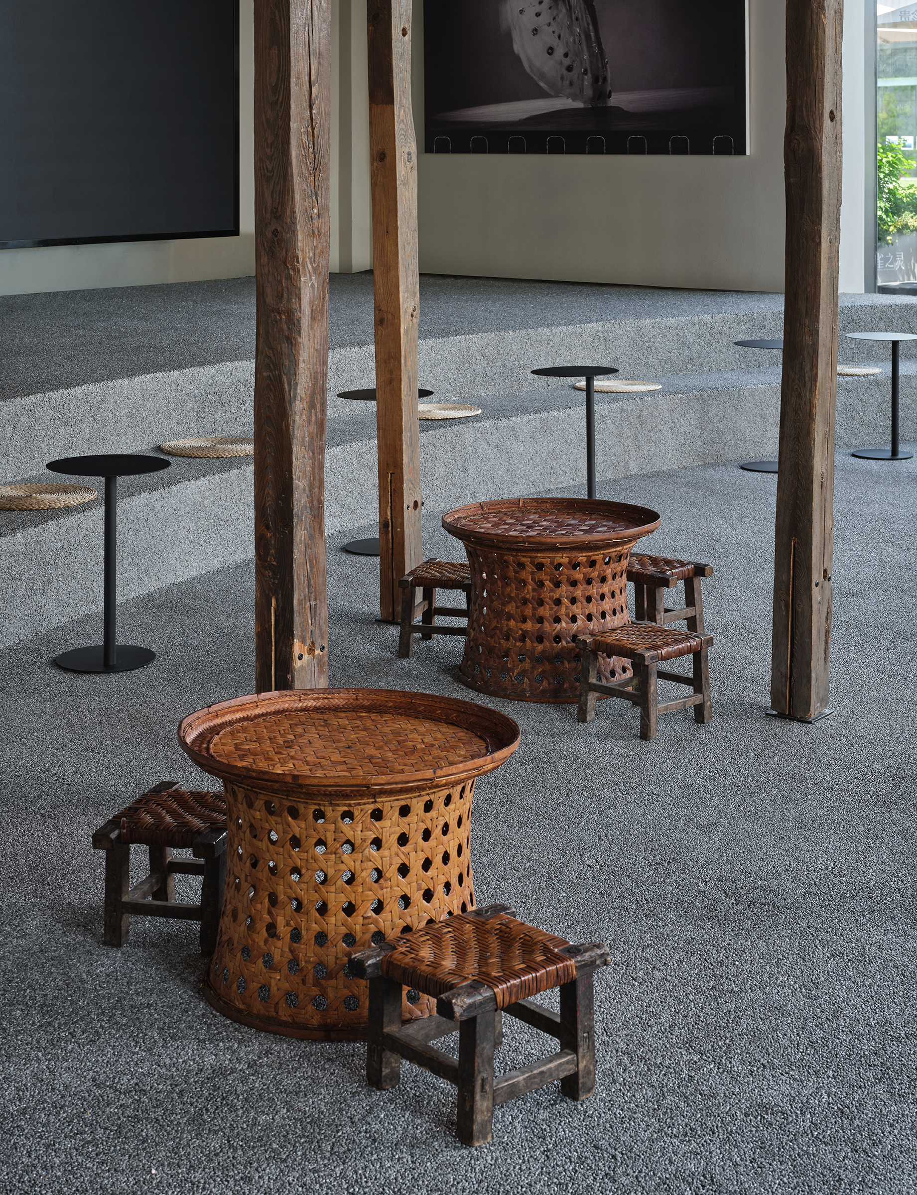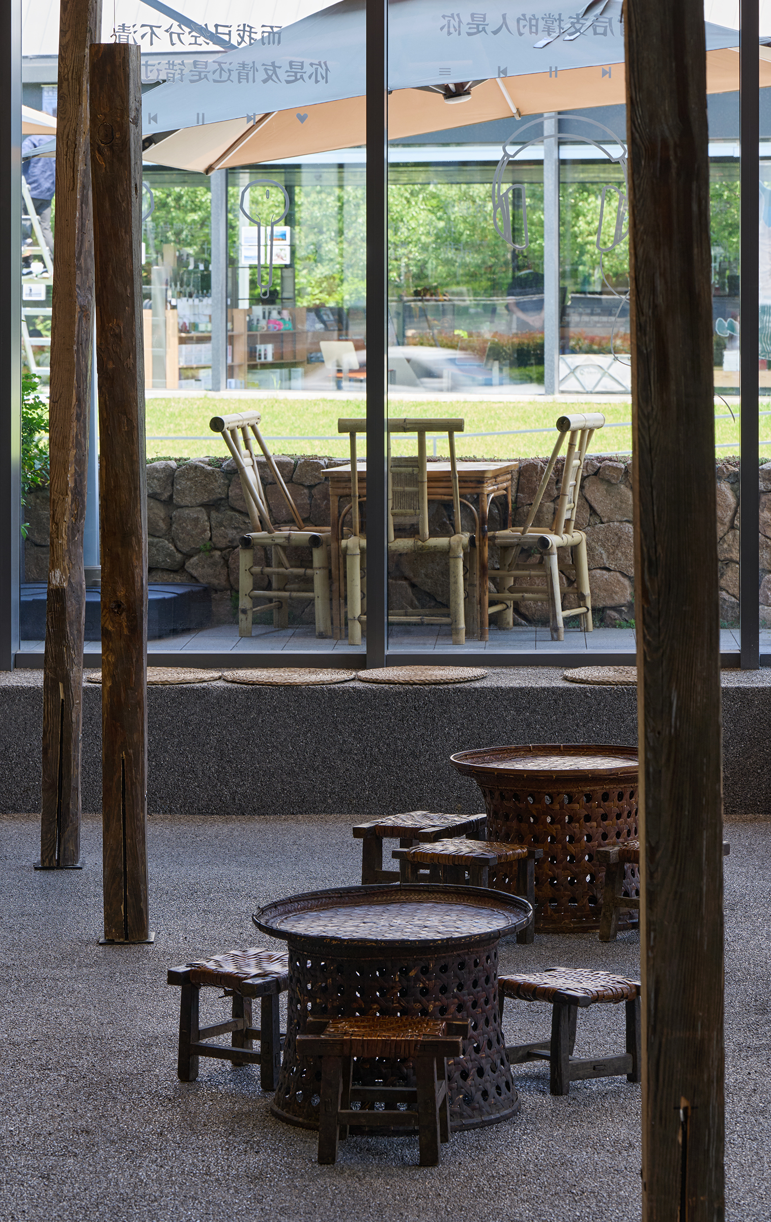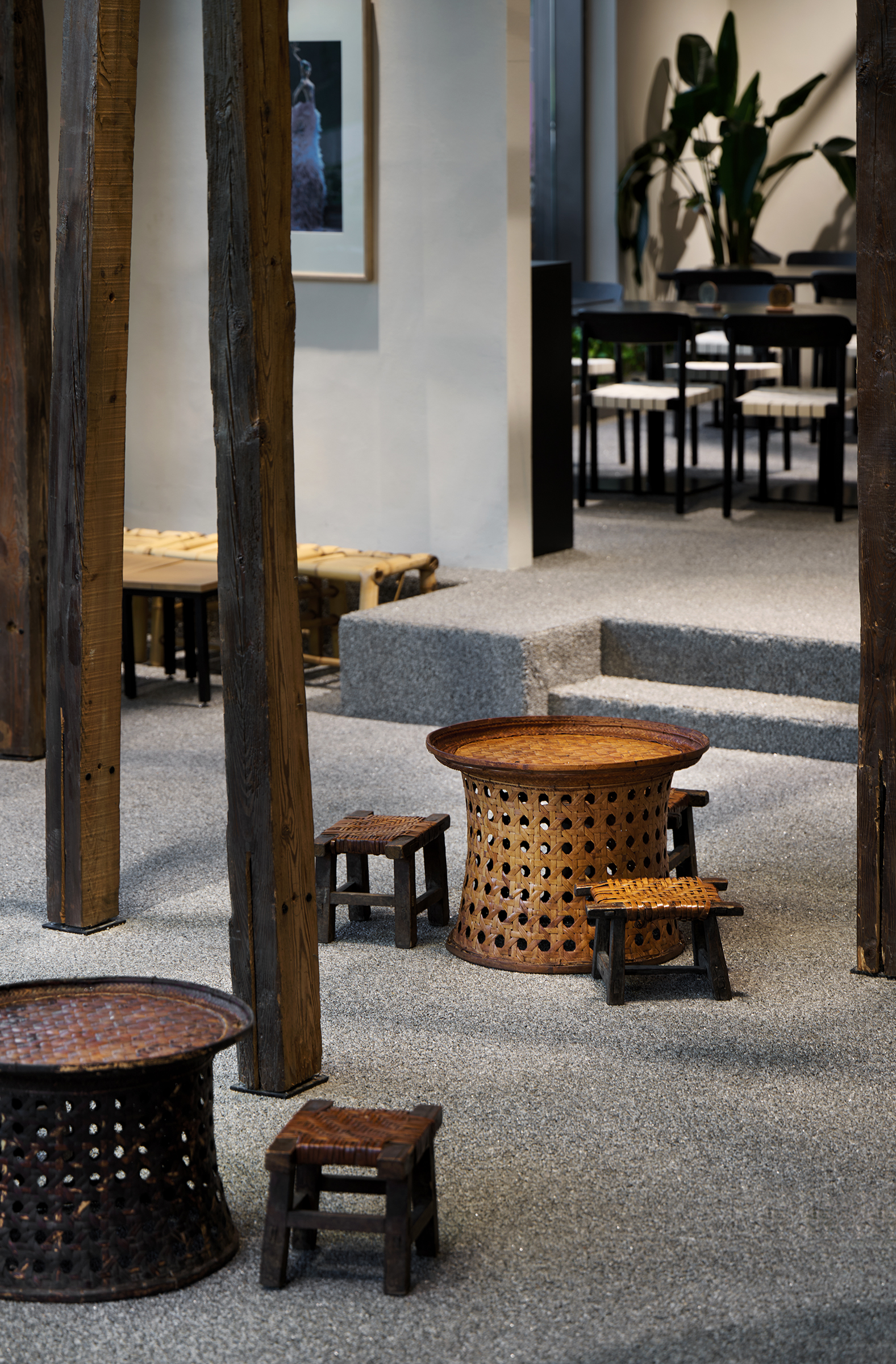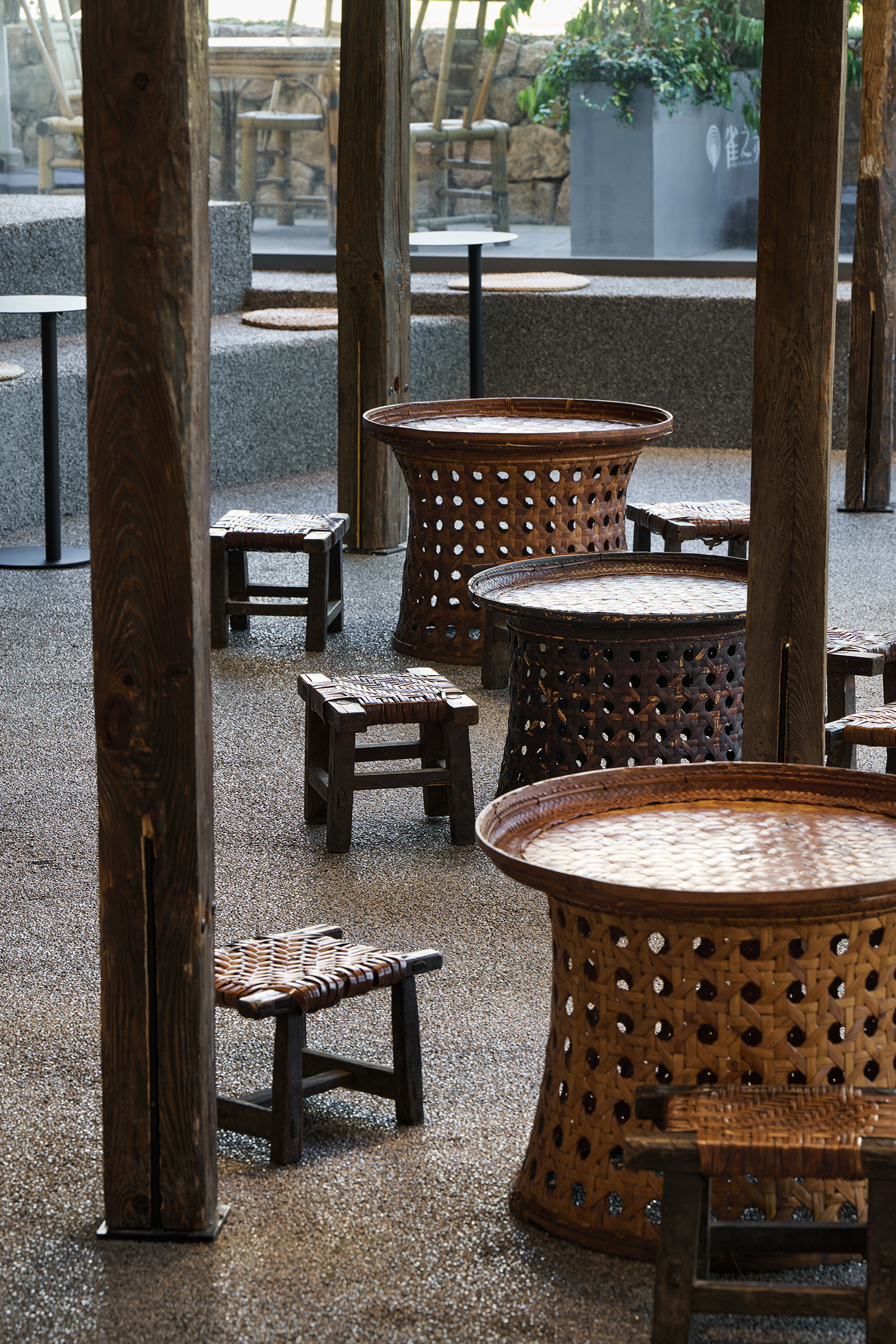 竹制的户外桌椅、云南的藤编矮几,一些“老物件”在这个新的空间里活跃,我们在舞台表演的区域将若干长长短短的老木方树立起来。垂直的雕塑让整个空间仿佛置身于森林之中,舞姿跳跃其中。空间主材:艺术涂料 干粘石 竹梯