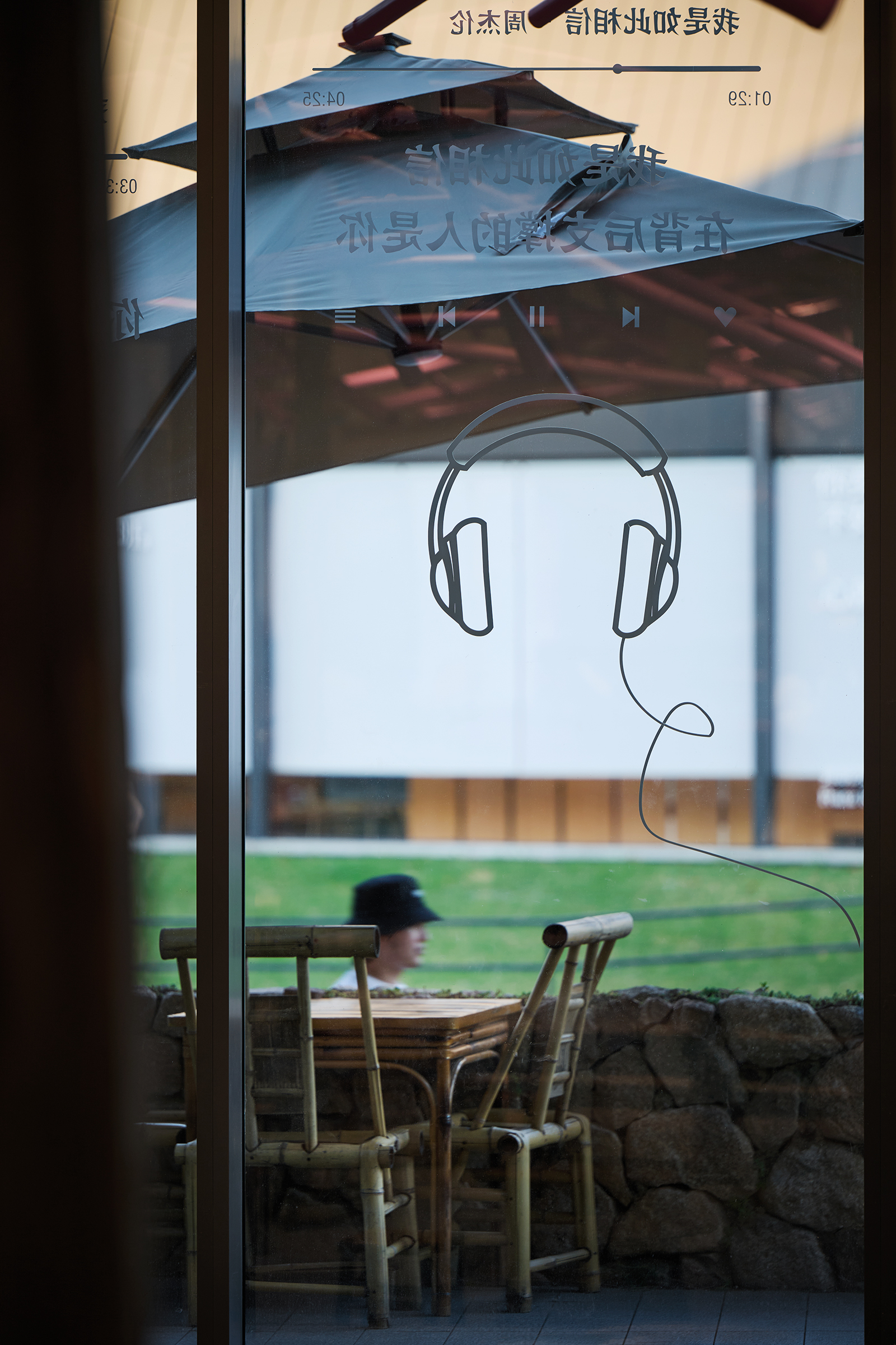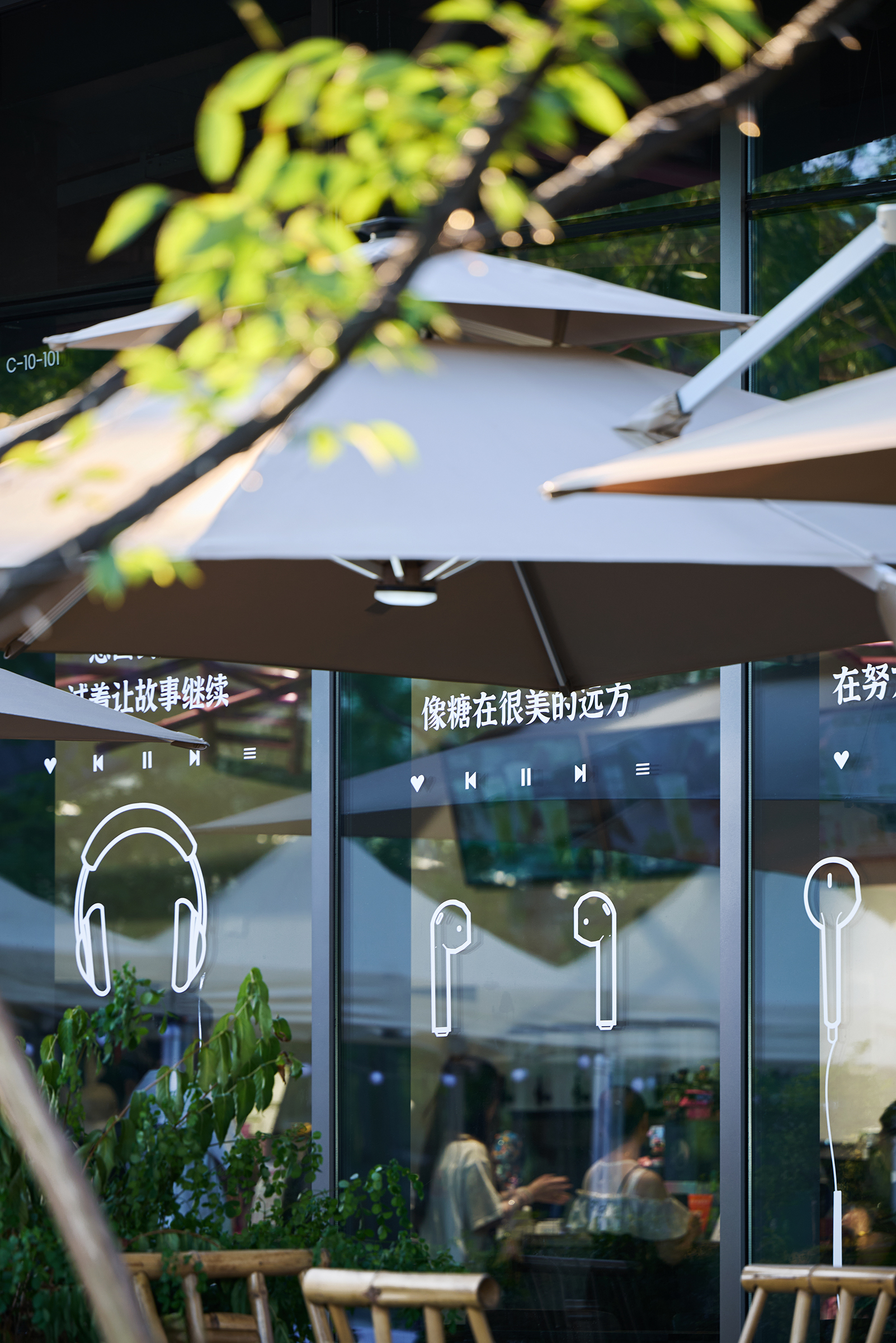 竹制的户外桌椅、云南的藤编矮几,一些“老物件”在这个新的空间里活跃,我们在舞台表演的区域将若干长长短短的老木方树立起来。垂直的雕塑让整个空间仿佛置身于森林之中,舞姿跳跃其中。关于周杰伦的内容我们更多留在了色彩表达以及内容输出上,整个玻璃外立面,我们用杰伦一首首歌,记录曾经每一个被吸引的瞬间,也是打卡拍照的装置。