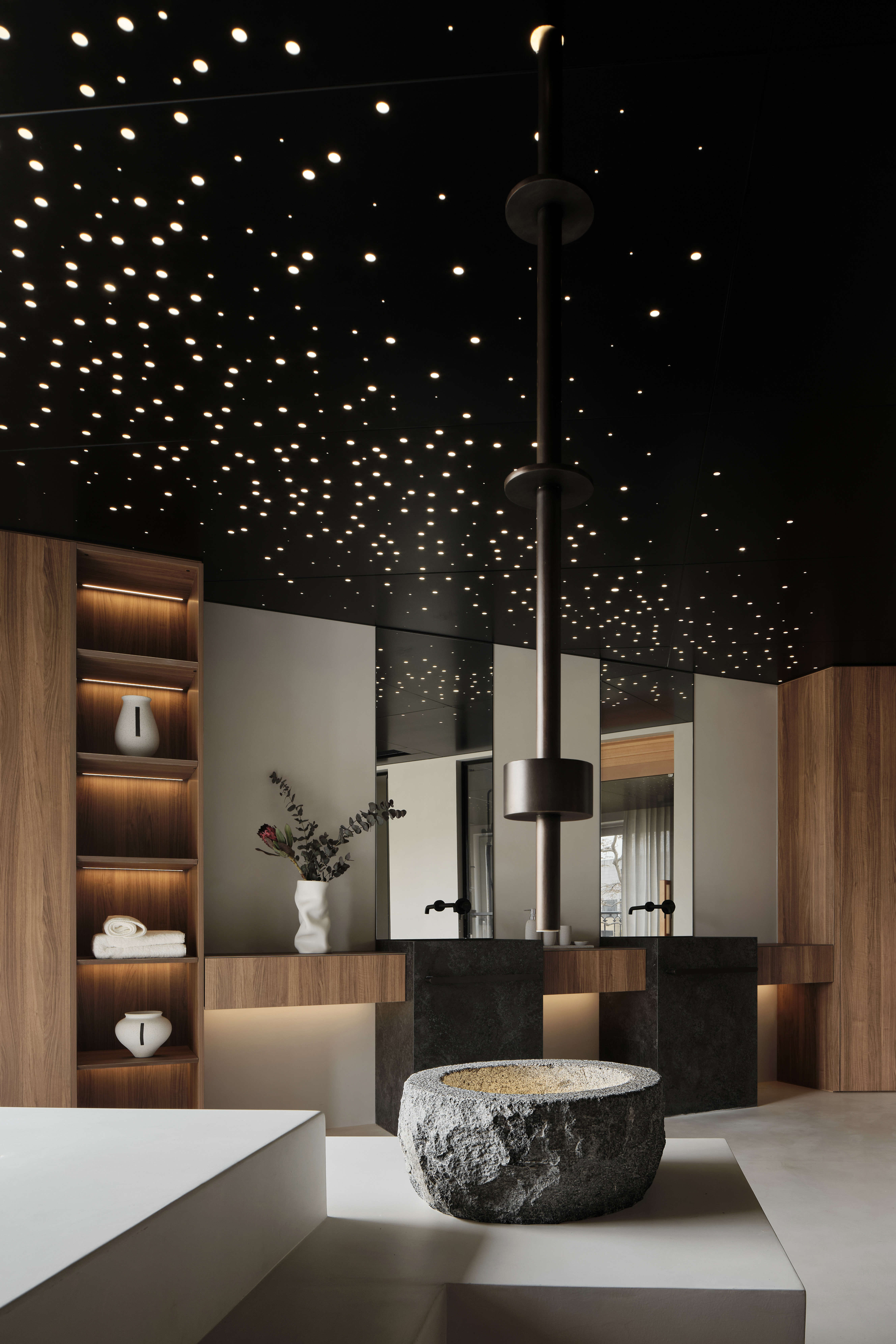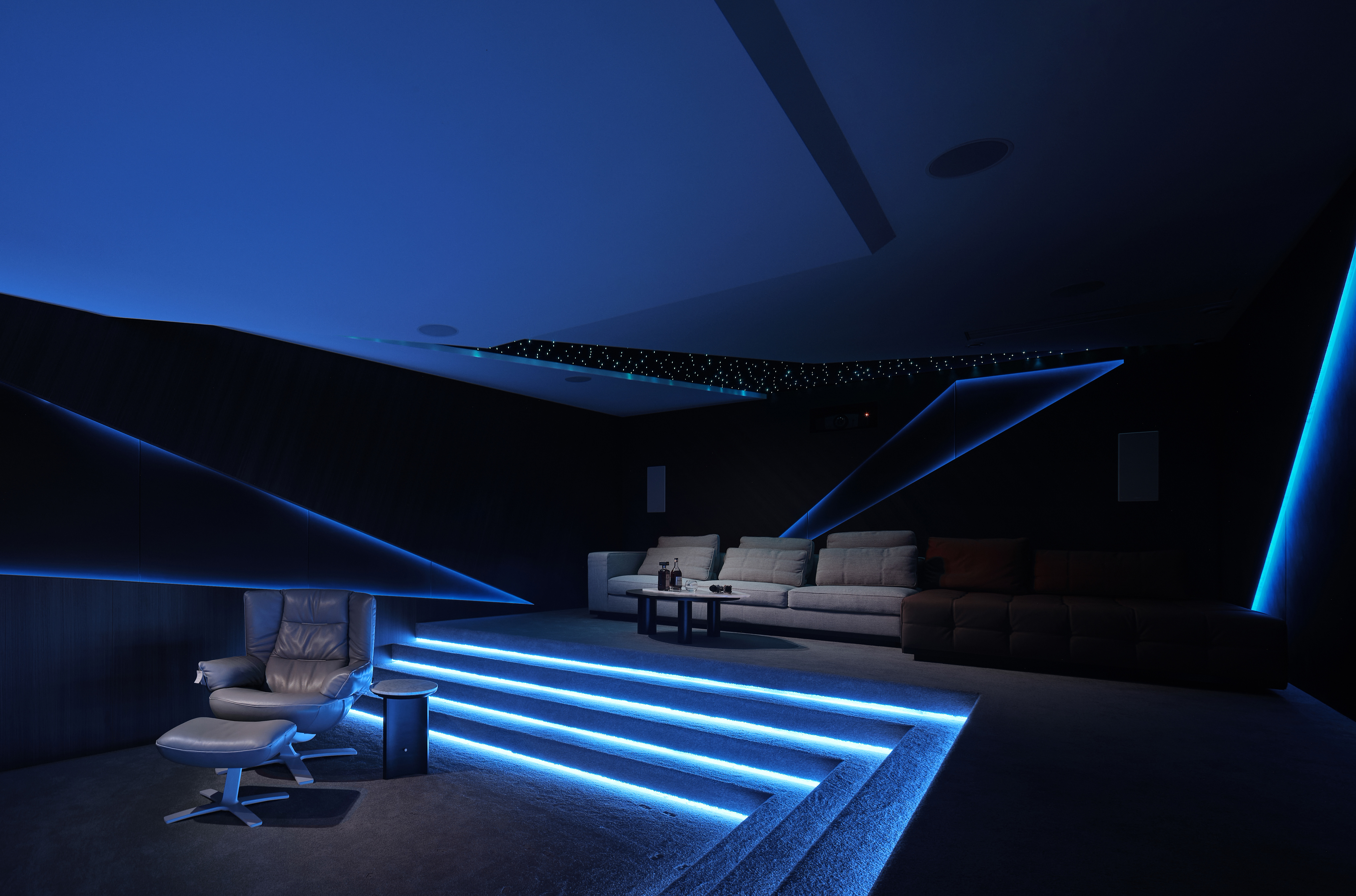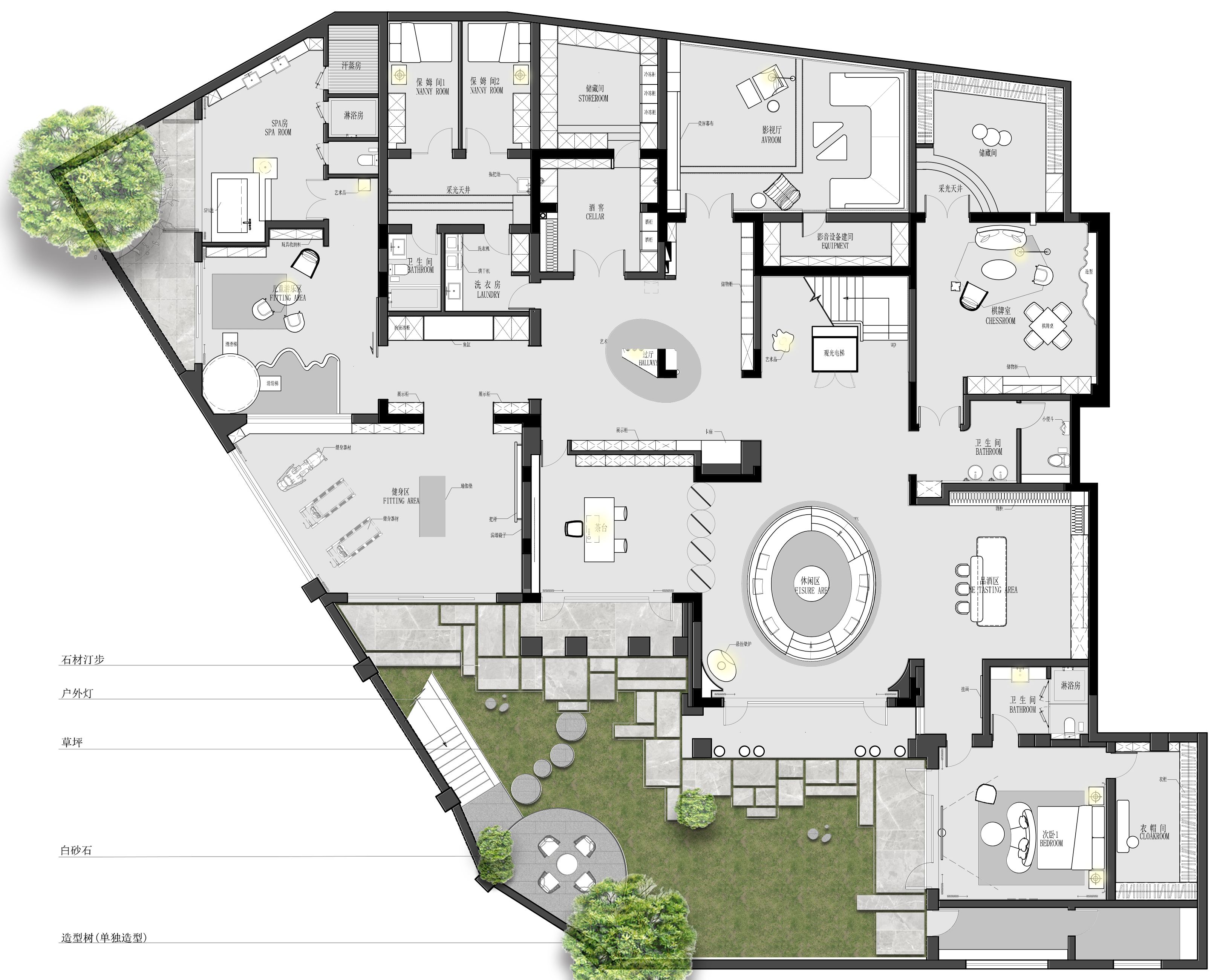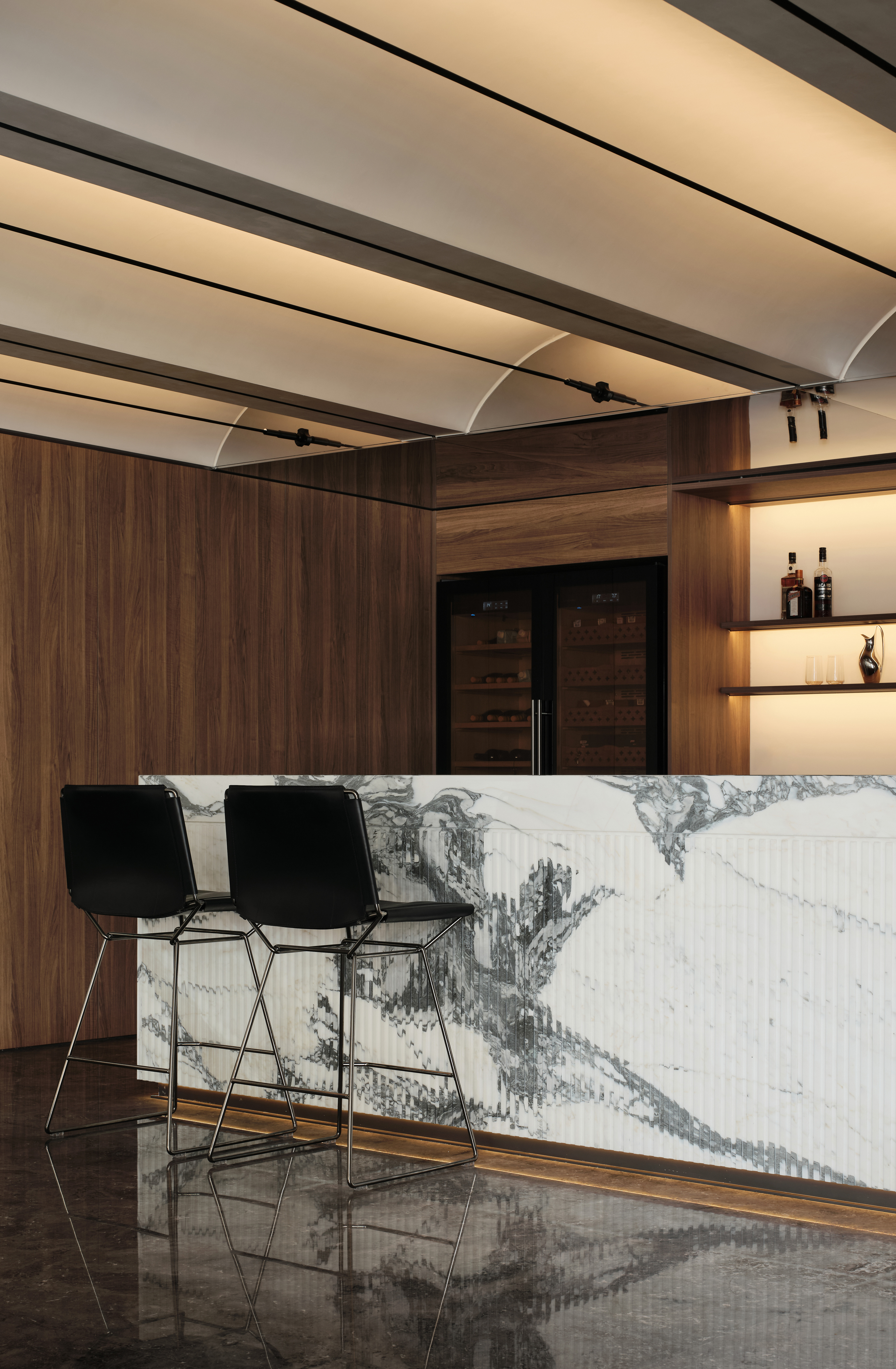 空间布局:负一层整层设计休闲娱乐空间,影音室、SPA房、休闲区、品酒、喝茶等区域,更加合理地规划动线以及空间分布,负一层主厅打造下沉式的休闲洽谈区域,营造更围合的洽谈氛围