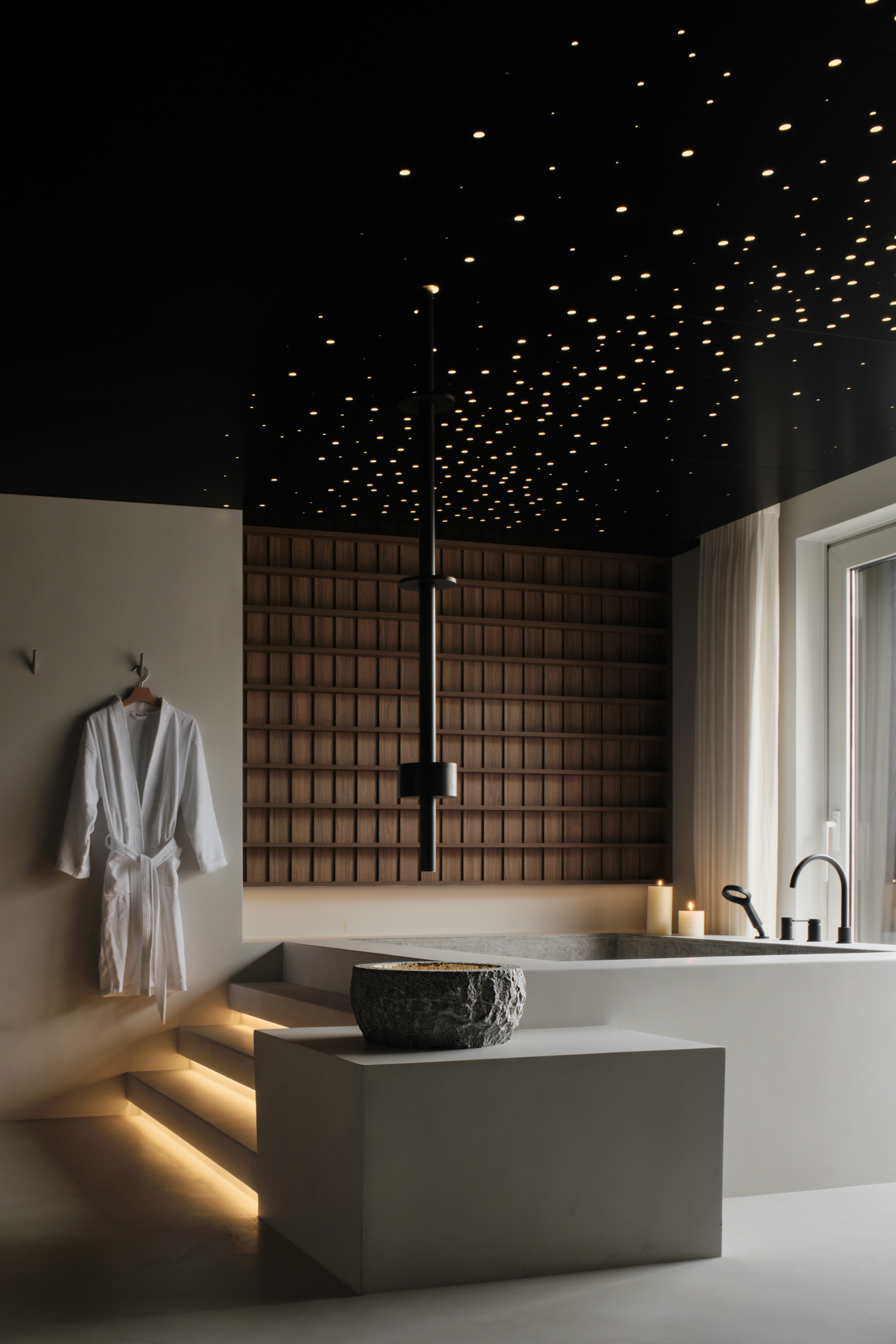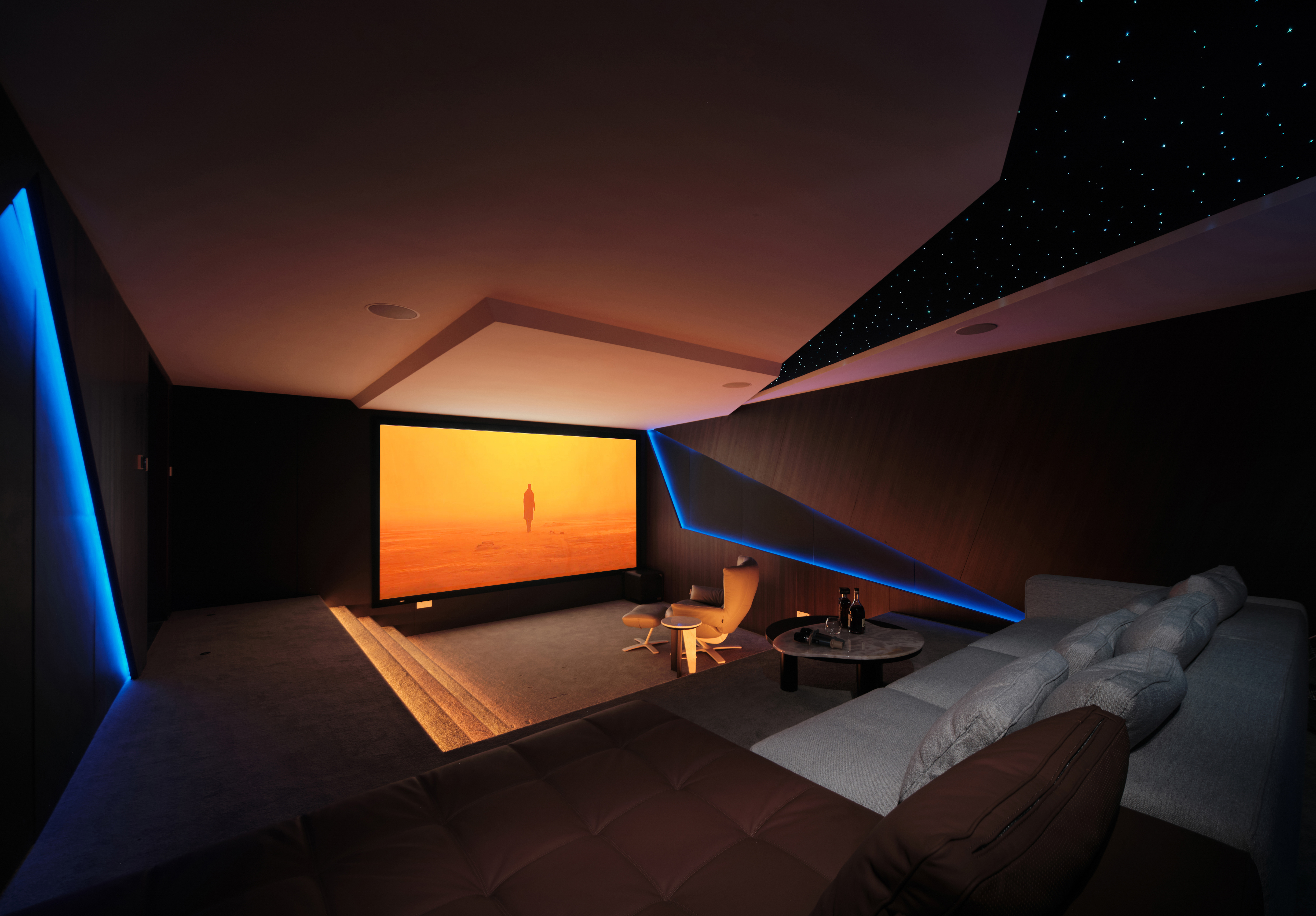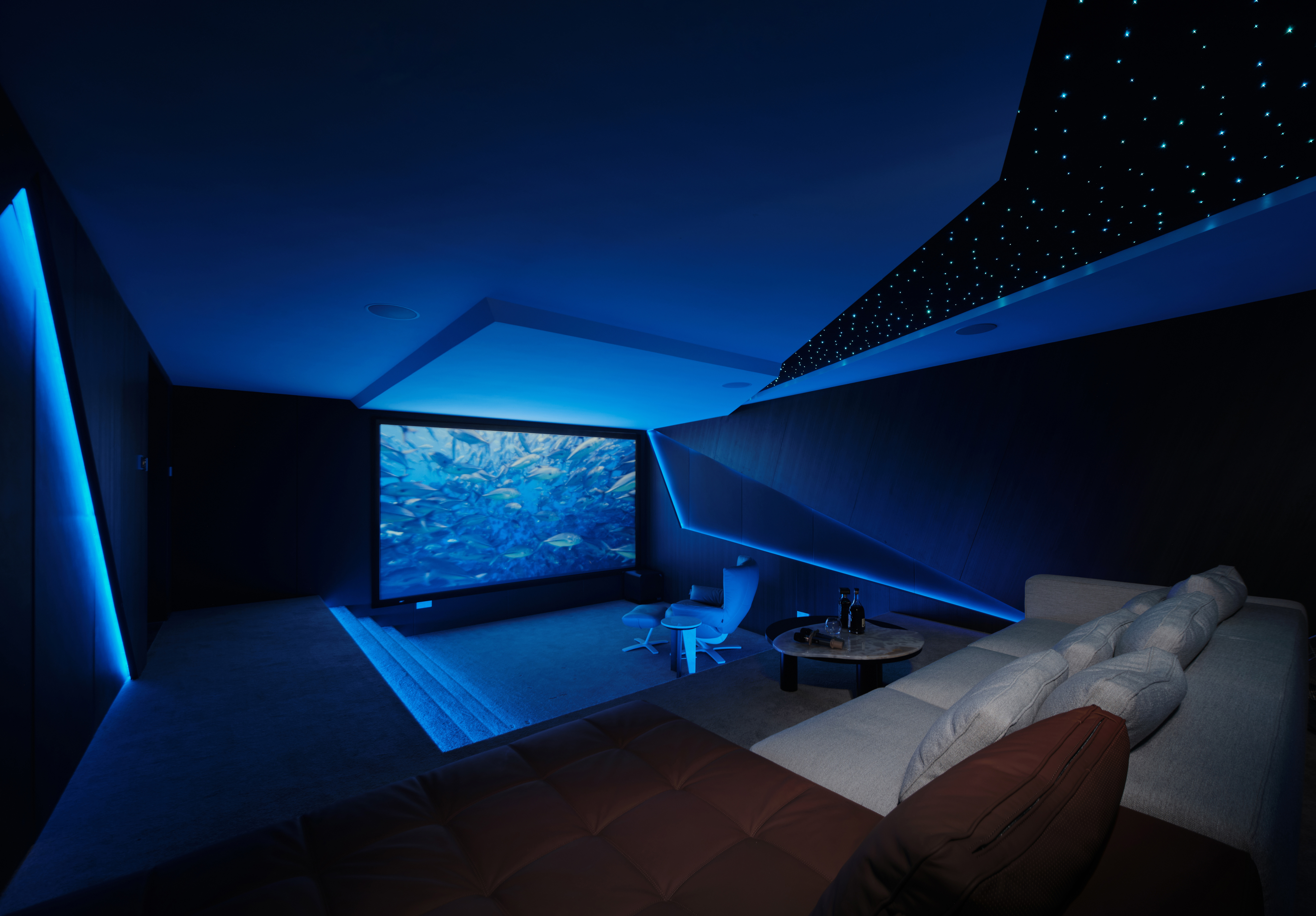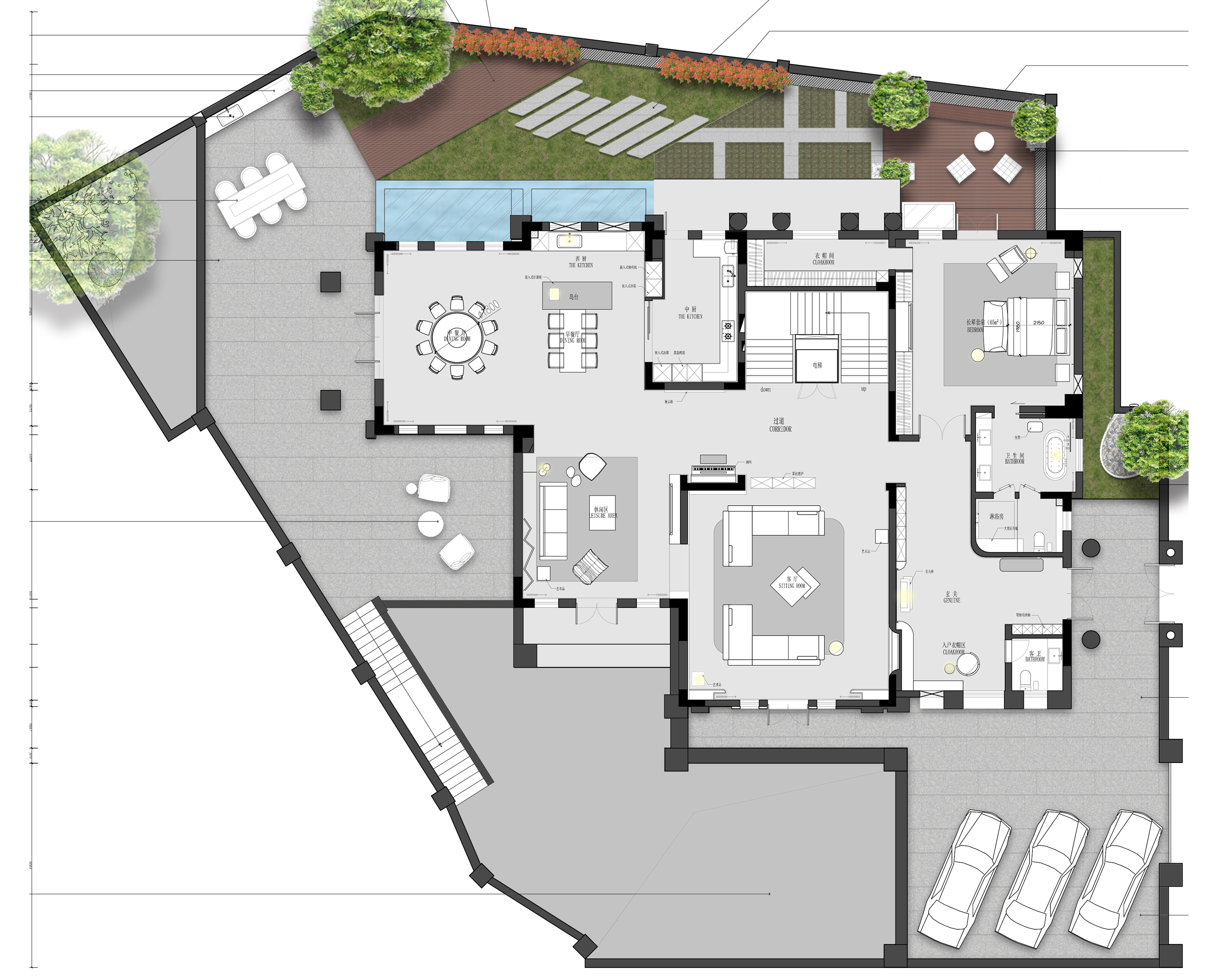 空间布局:负一层整层设计休闲娱乐空间,影音室、SPA房、休闲区、品酒、喝茶等区域,更加合理地规划动线以及空间分布,负一层主厅打造下沉式的休闲洽谈区域,营造更围合的洽谈氛围