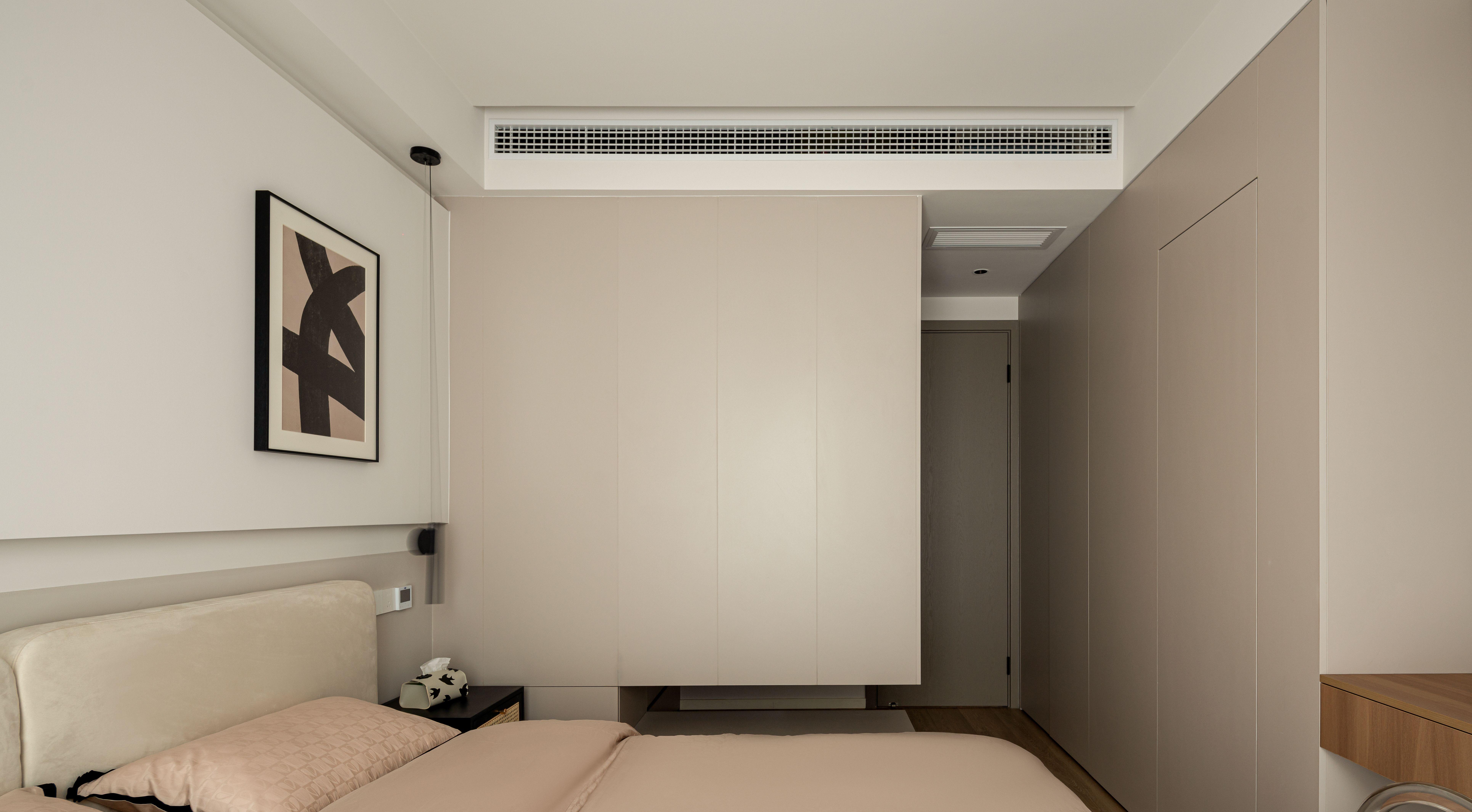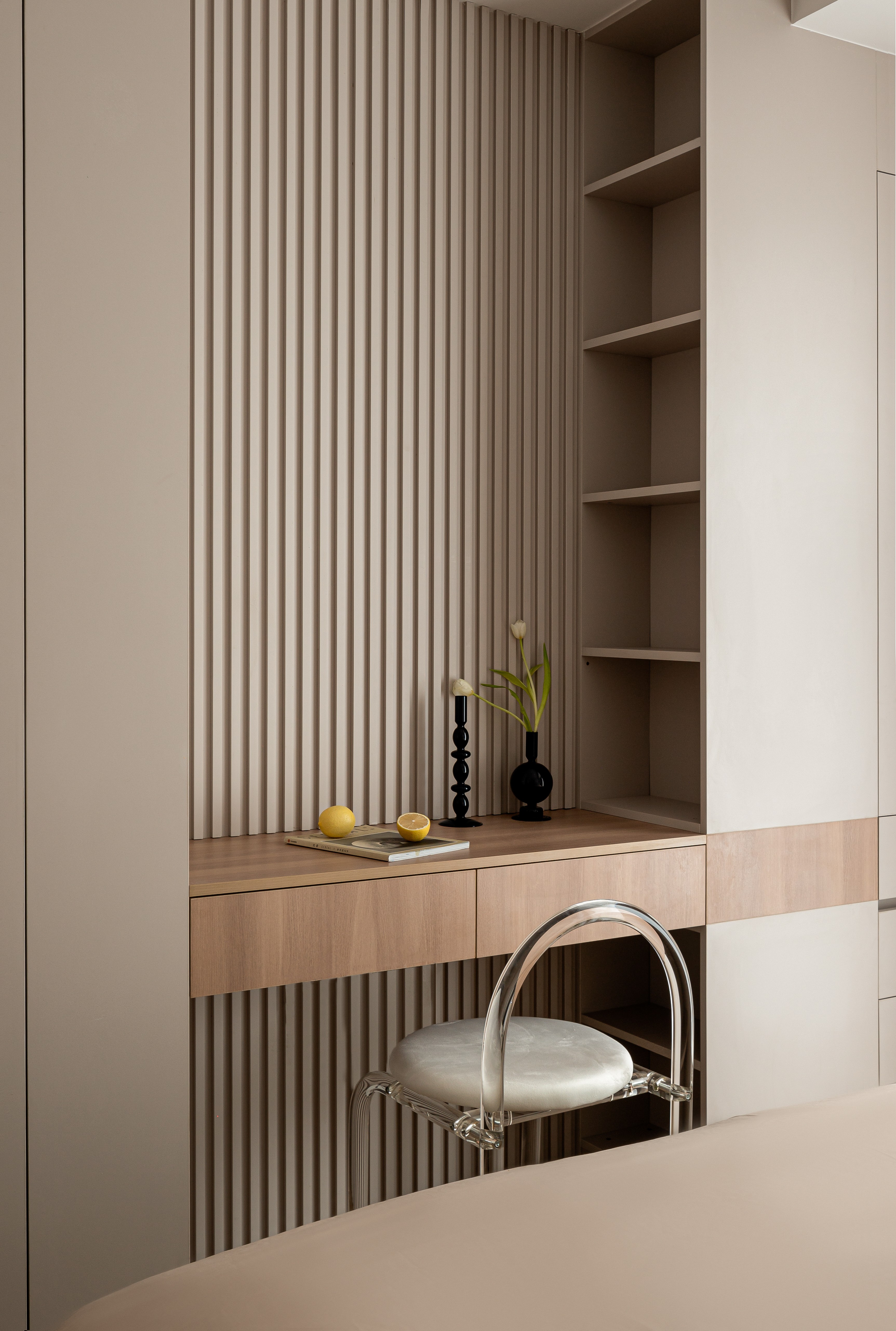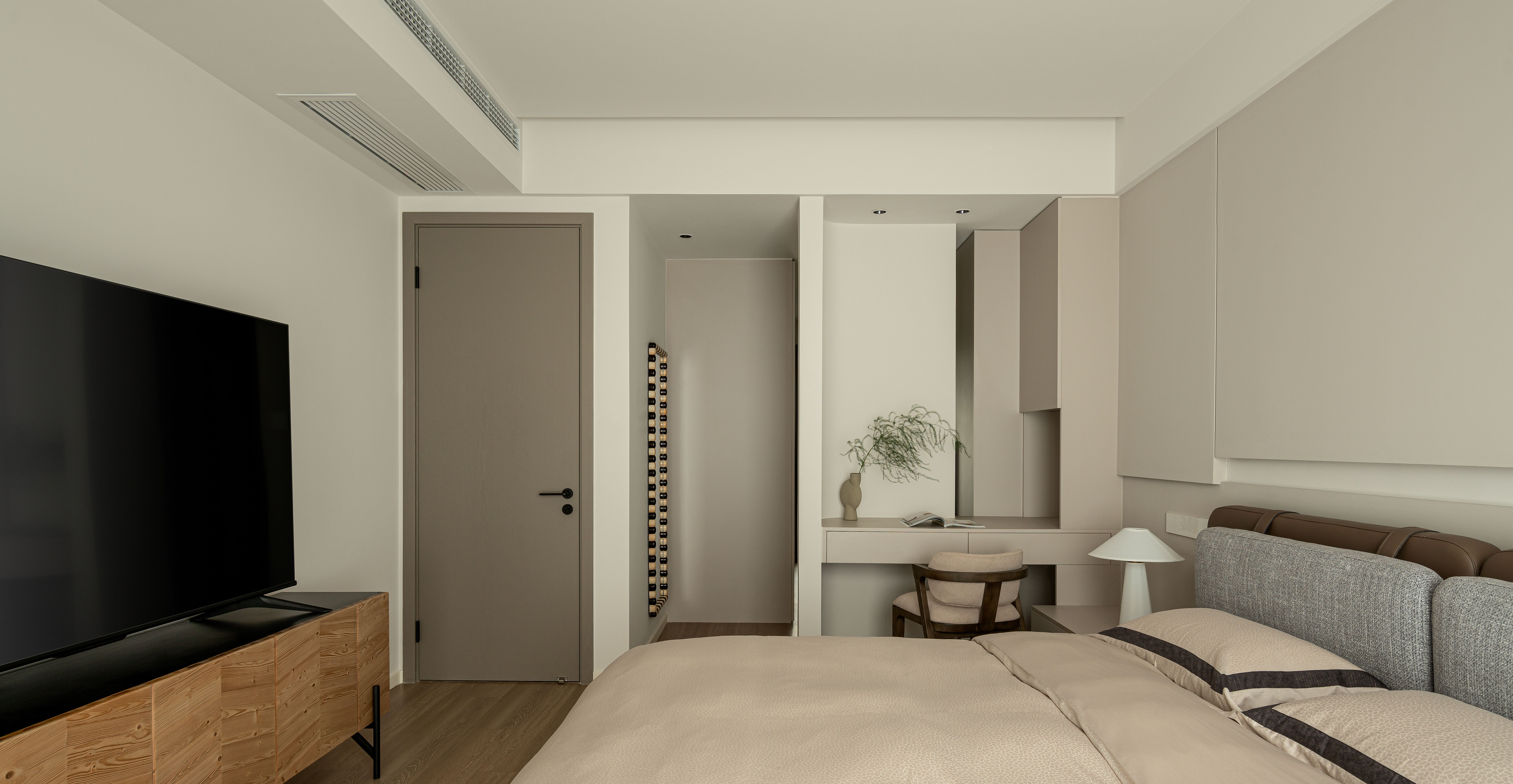 同时针对业主一家的居住要求,将原本的双卫,改造成了三个卫生间。在不影响次卫功能的前提下,将次卧也打造成了一个独立套房,使其双主卧都拥有独立的衣帽间与卫生间。将空间利用发挥到极致却依然保持空间该有的松弛感。