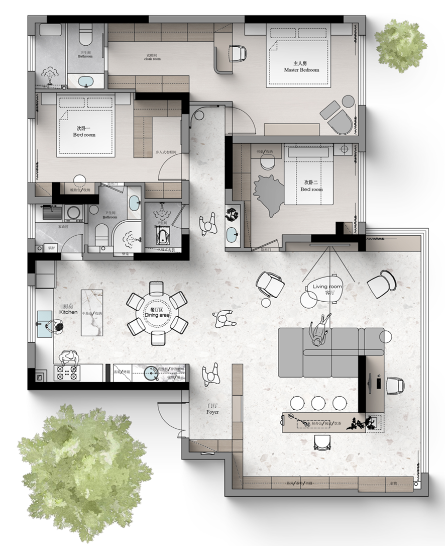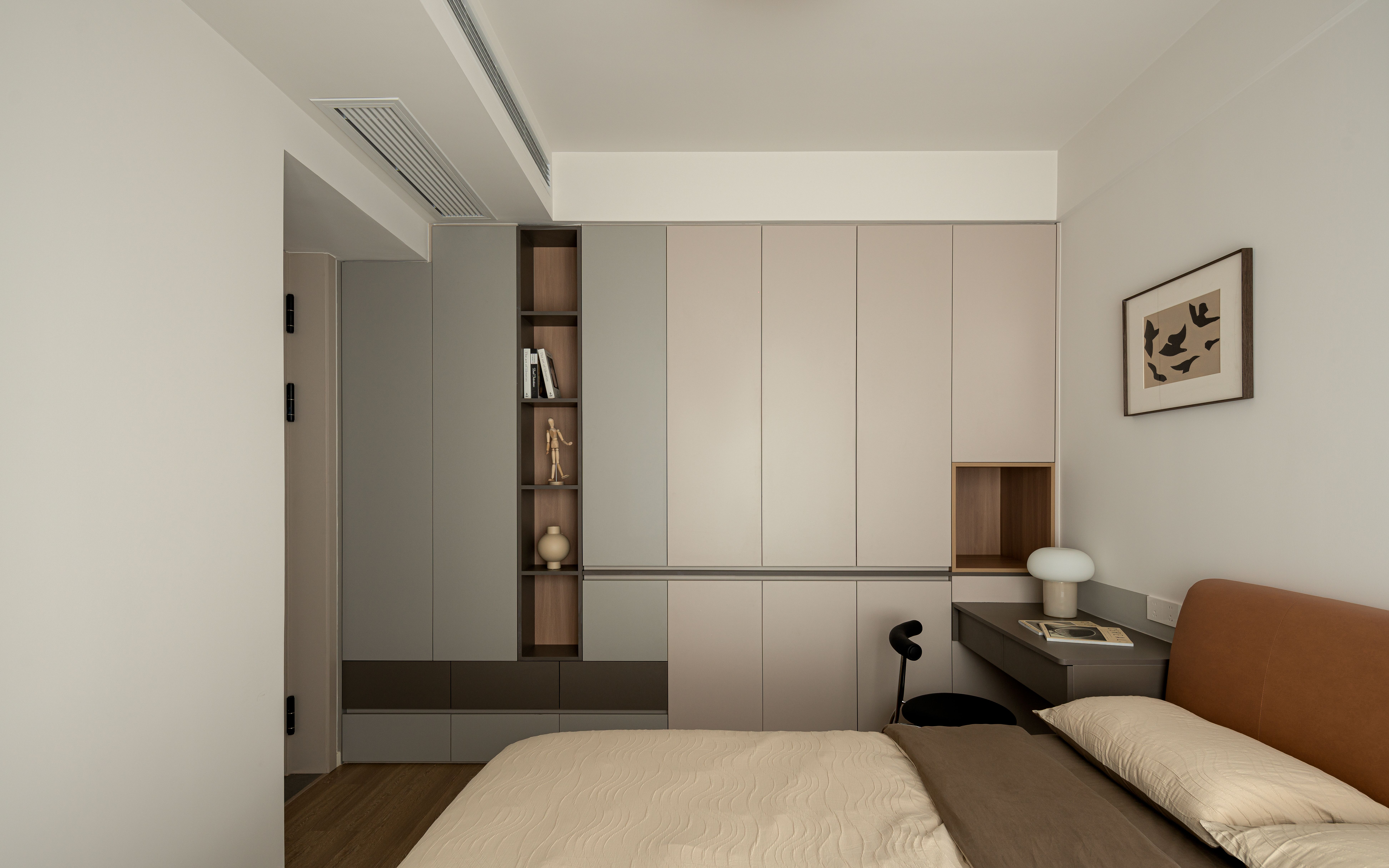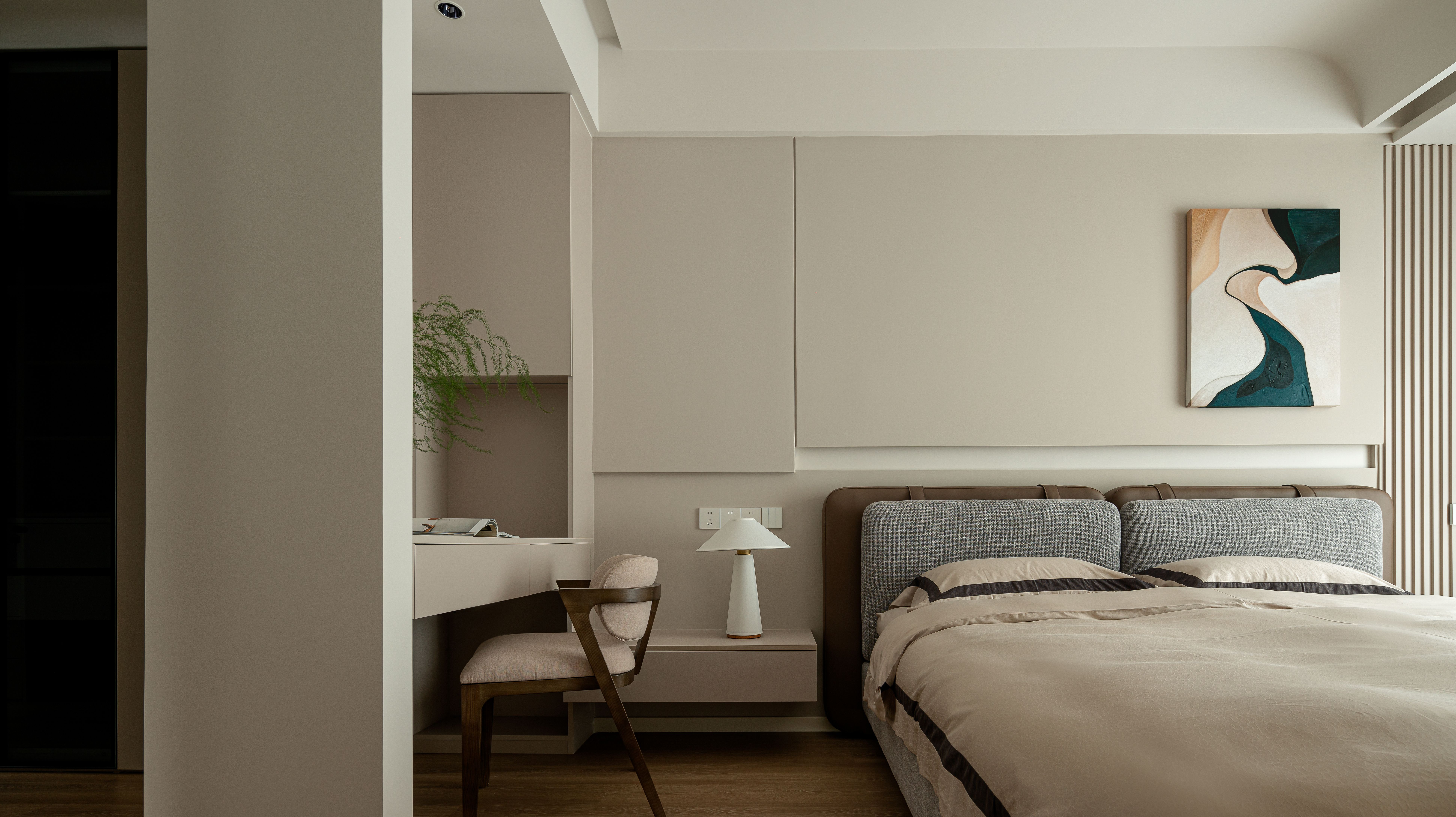 同时针对业主一家的居住要求,将原本的双卫,改造成了三个卫生间。在不影响次卫功能的前提下,将次卧也打造成了一个独立套房,使其双主卧都拥有独立的衣帽间与卫生间。将空间利用发挥到极致却依然保持空间该有的松弛感。