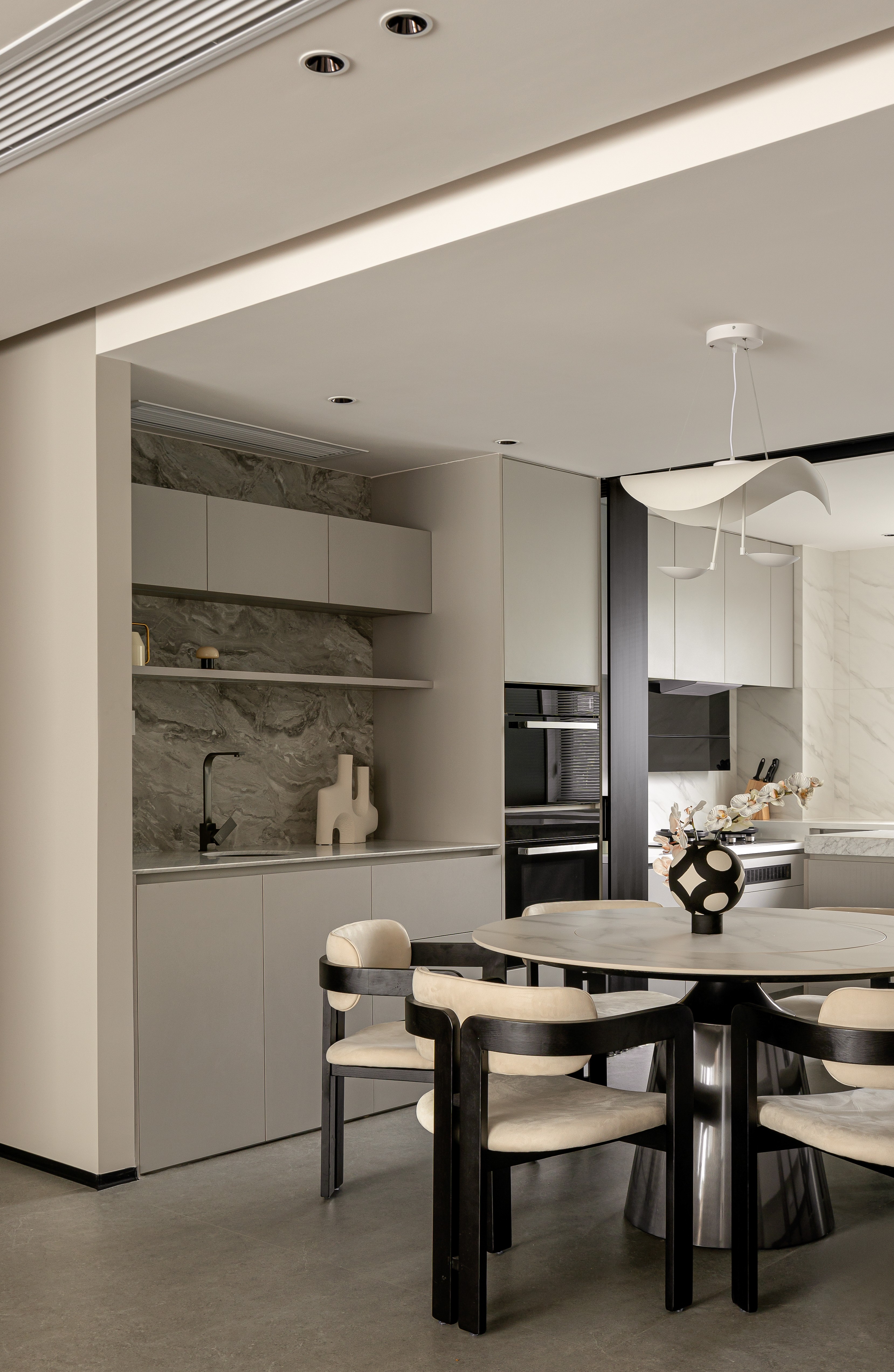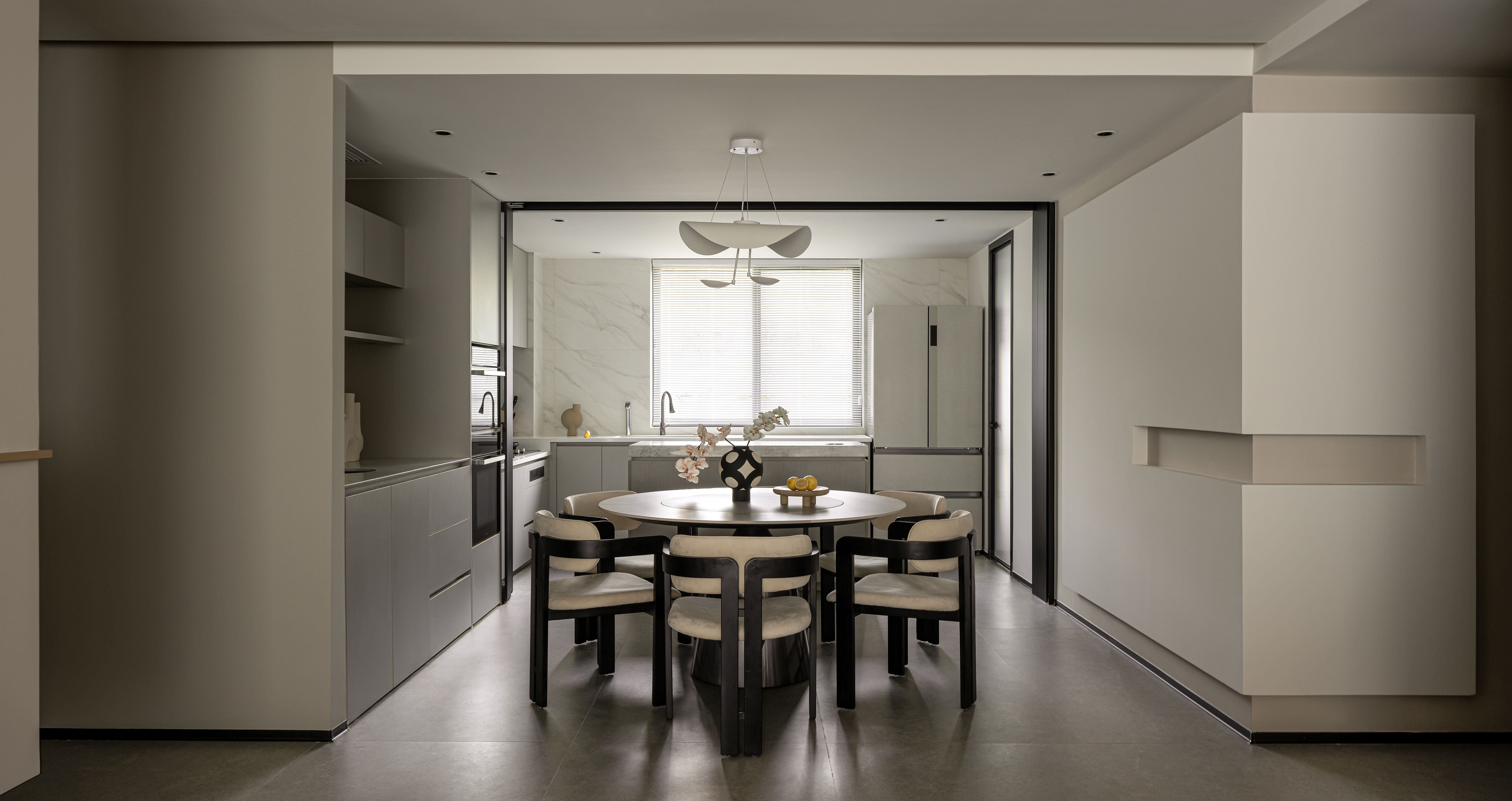 厨房也采用了倒台加六联动移门使其既能达到开放式的同时也能满足爆炒时候的油烟需求,中西厨的结合也能适应更多场景的需求。