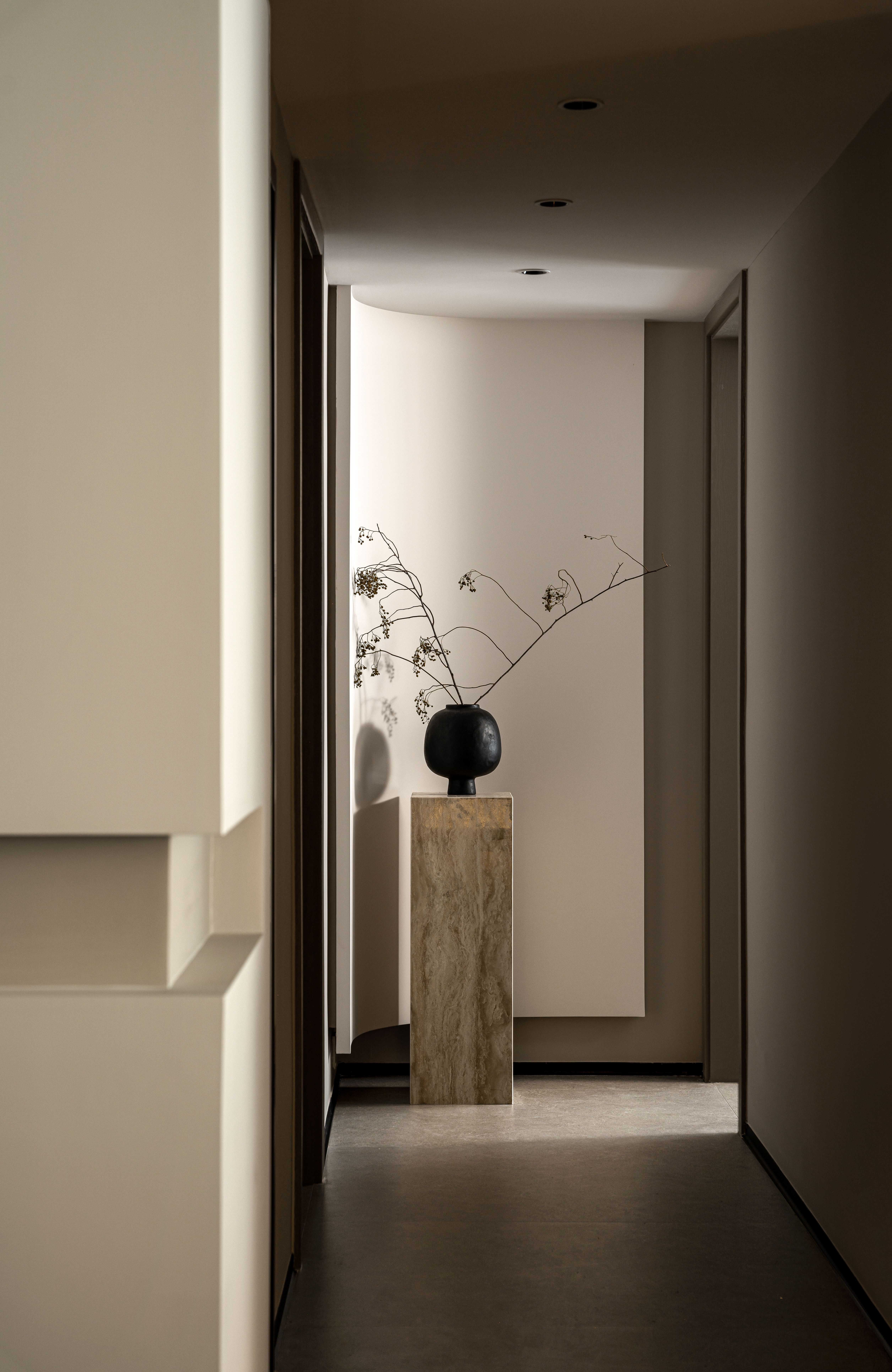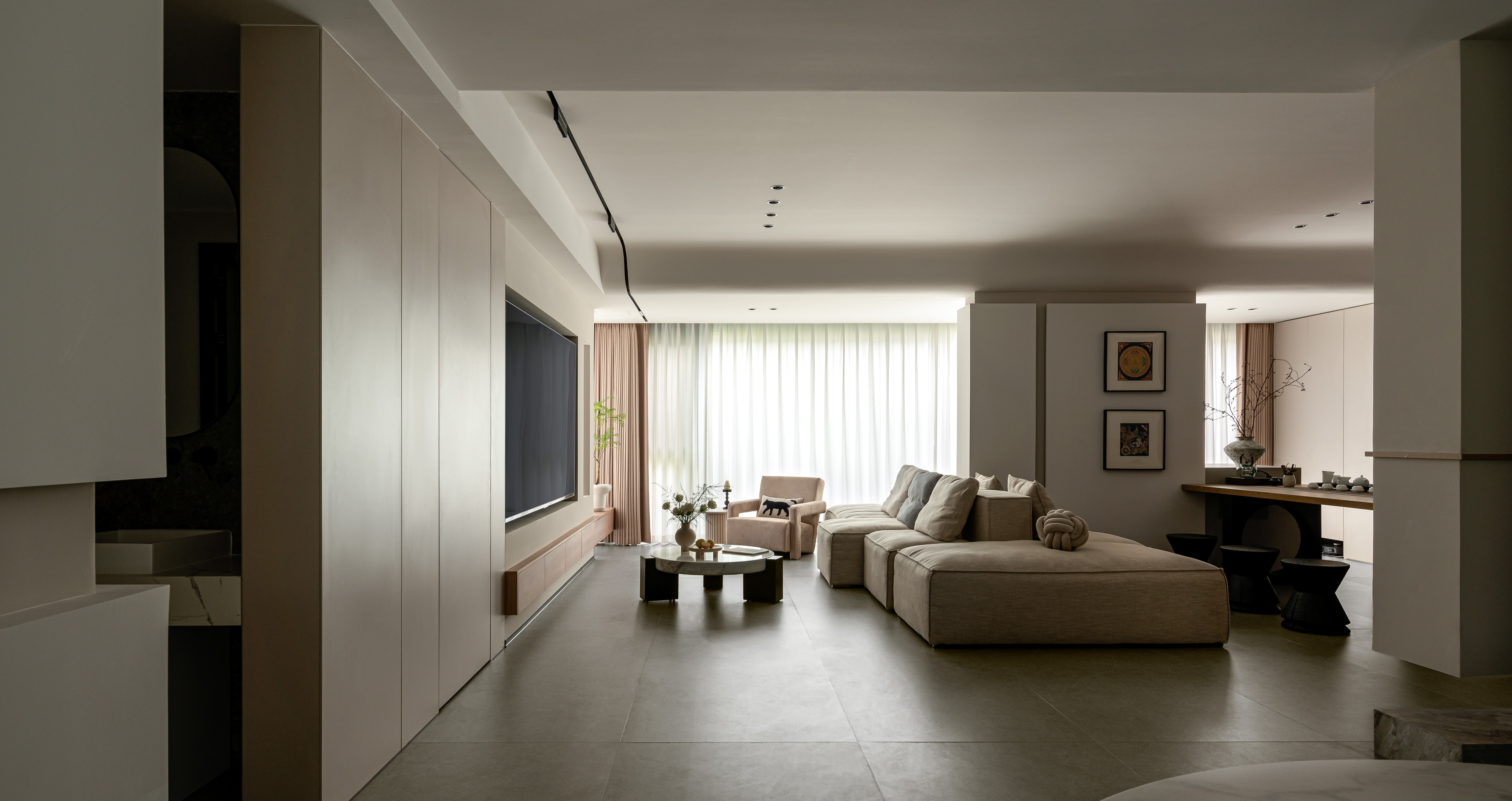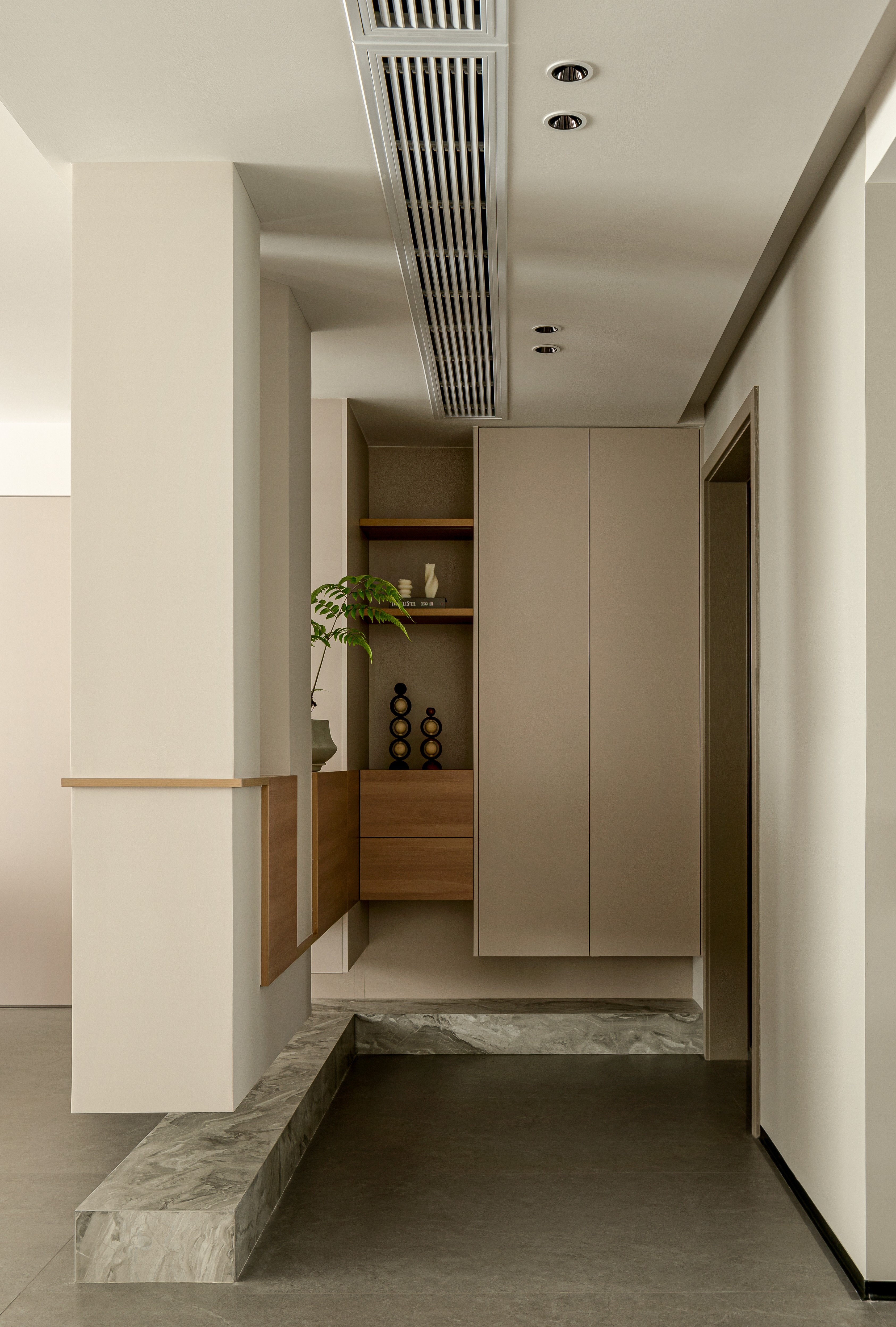 入户以悬挑、透景、穿插、叠级的手法让客厅景观与光线引入眼帘,加上独特的柜体结构手法让归家瞬间充满仪式感。在满足风水与储物需求的同时依然能保持优雅的艺术美学感。
