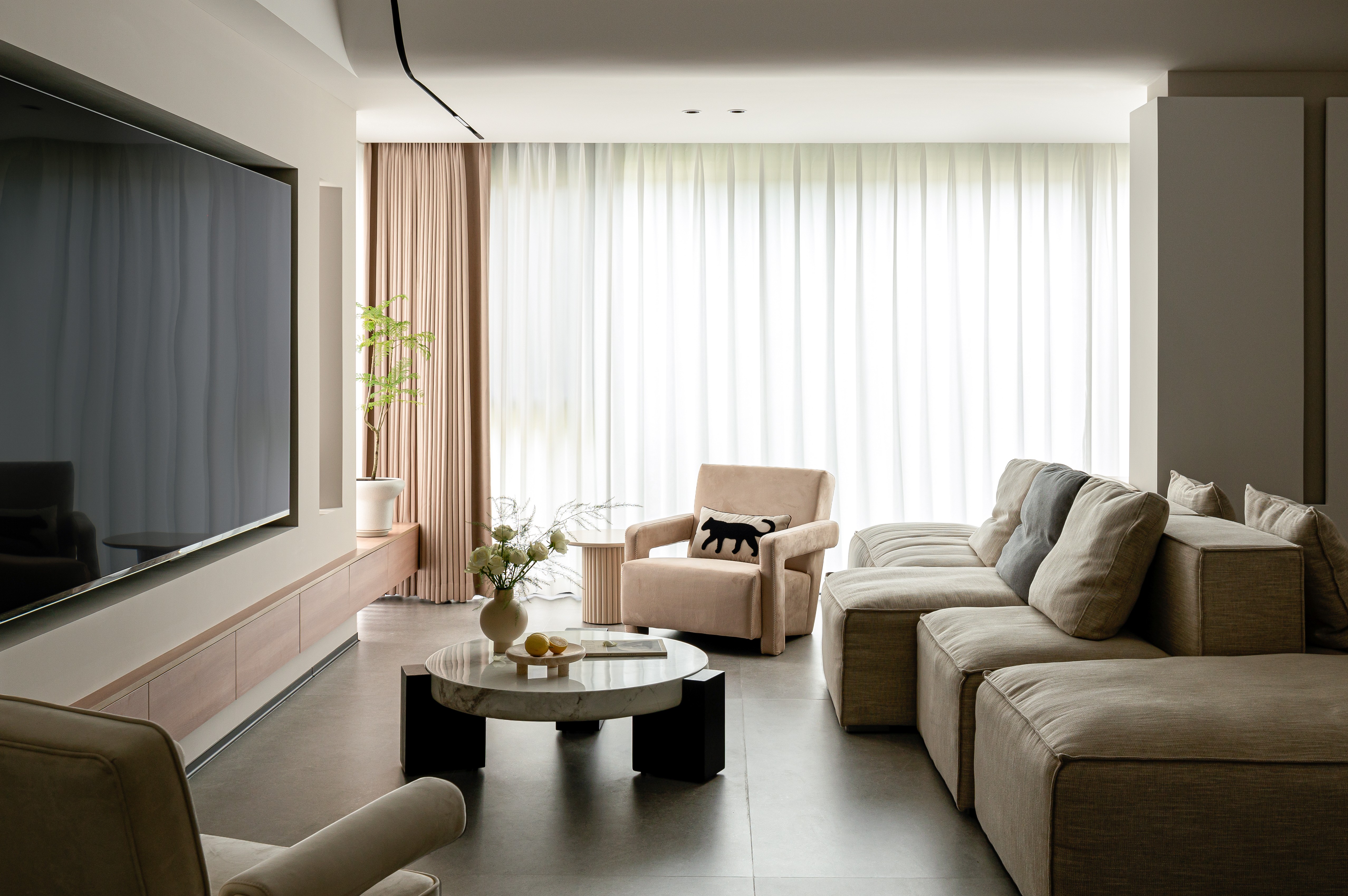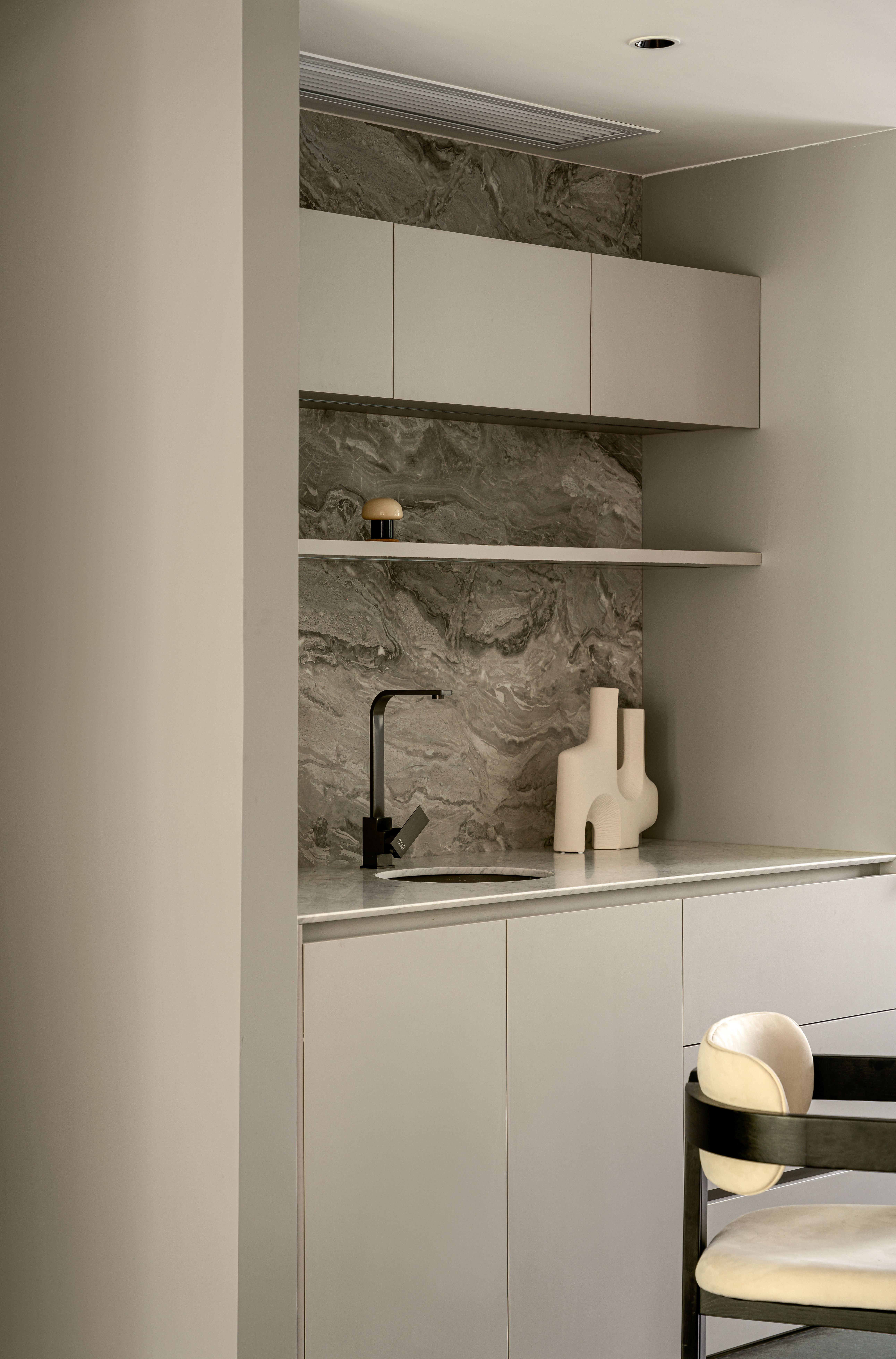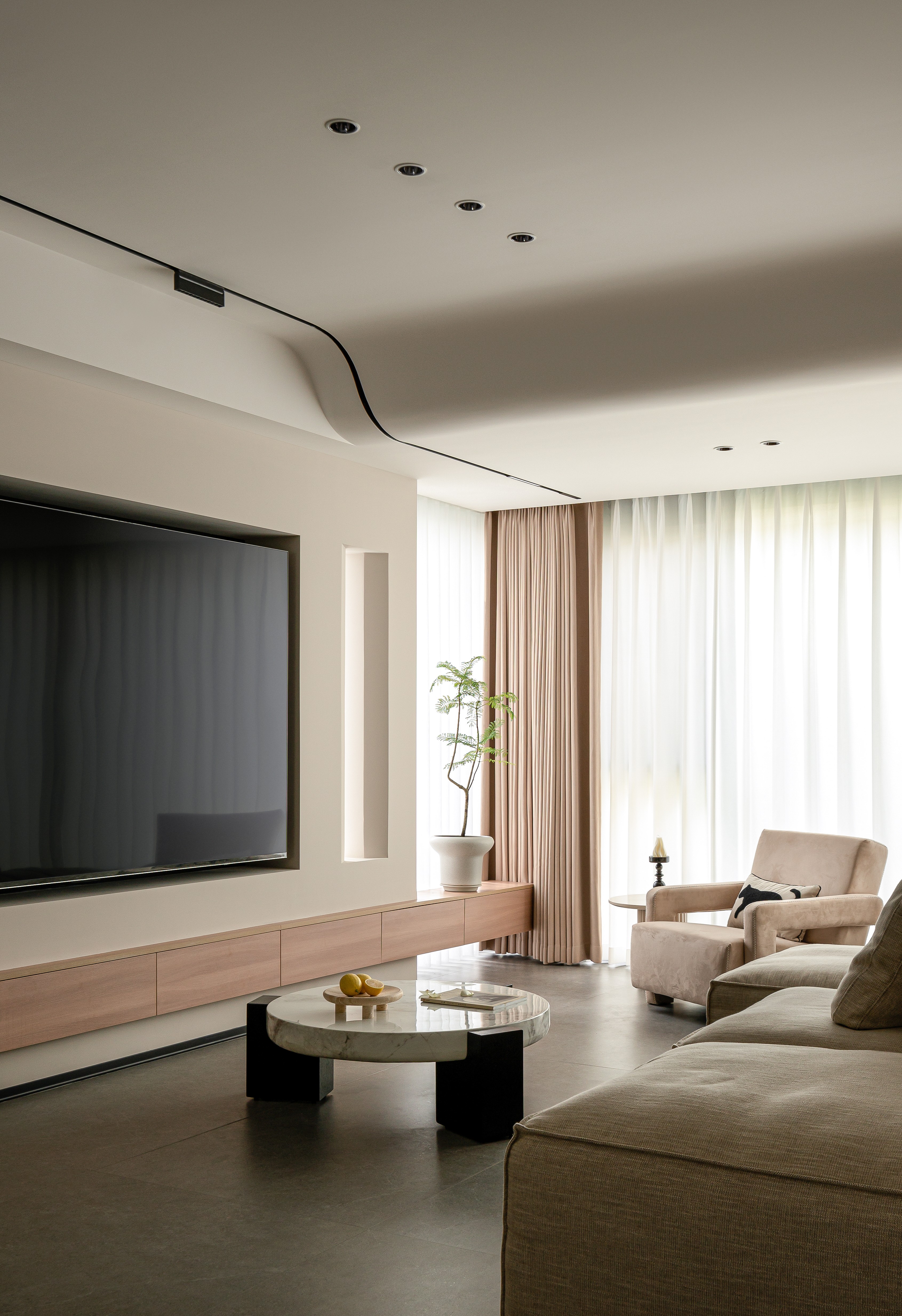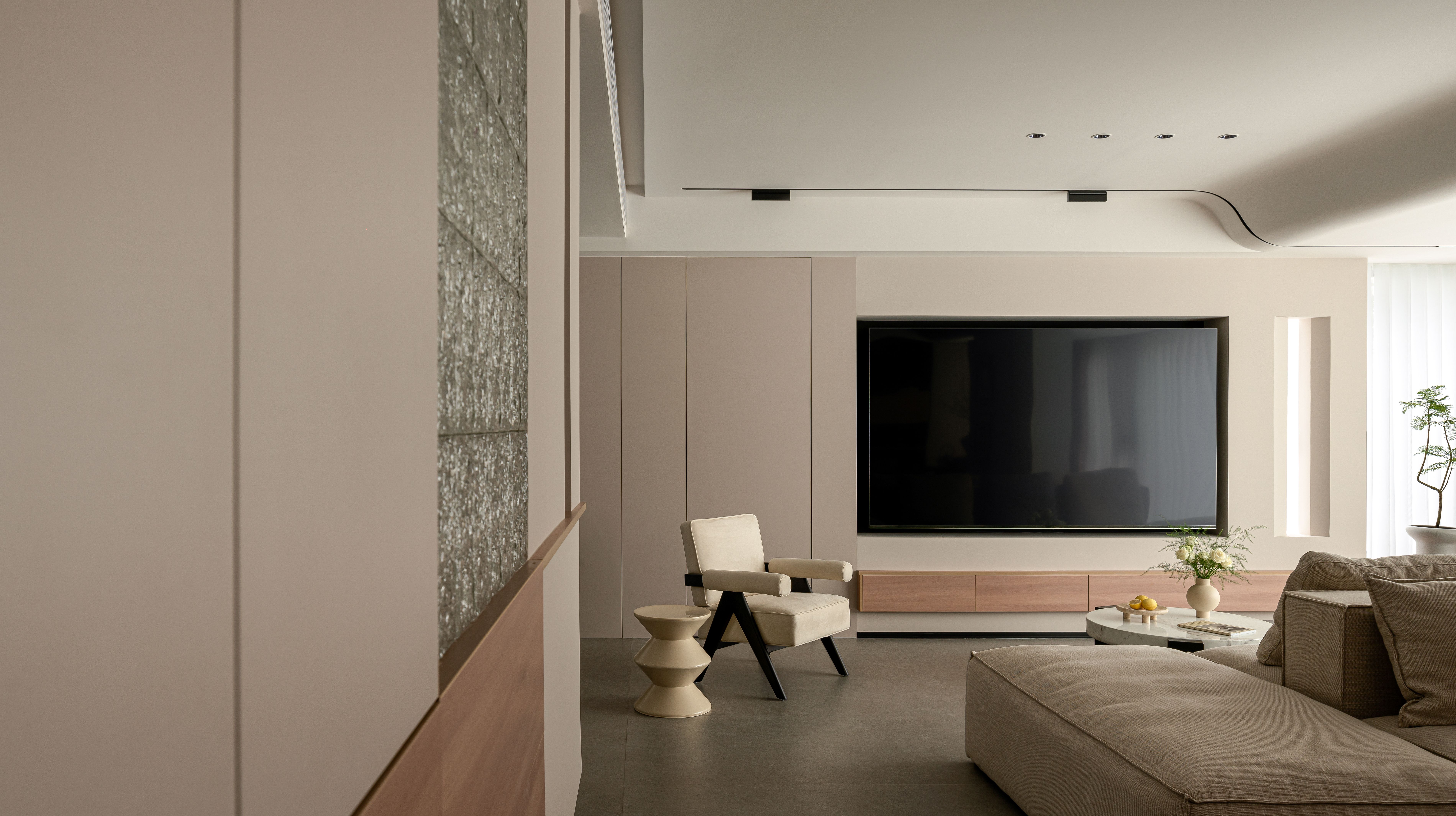 入户以悬挑、透景、穿插、叠级的手法让客厅景观与光线引入眼帘,加上独特的柜体结构手法让归家瞬间充满仪式感。在满足风水与储物需求的同时依然能保持优雅的艺术美学感。