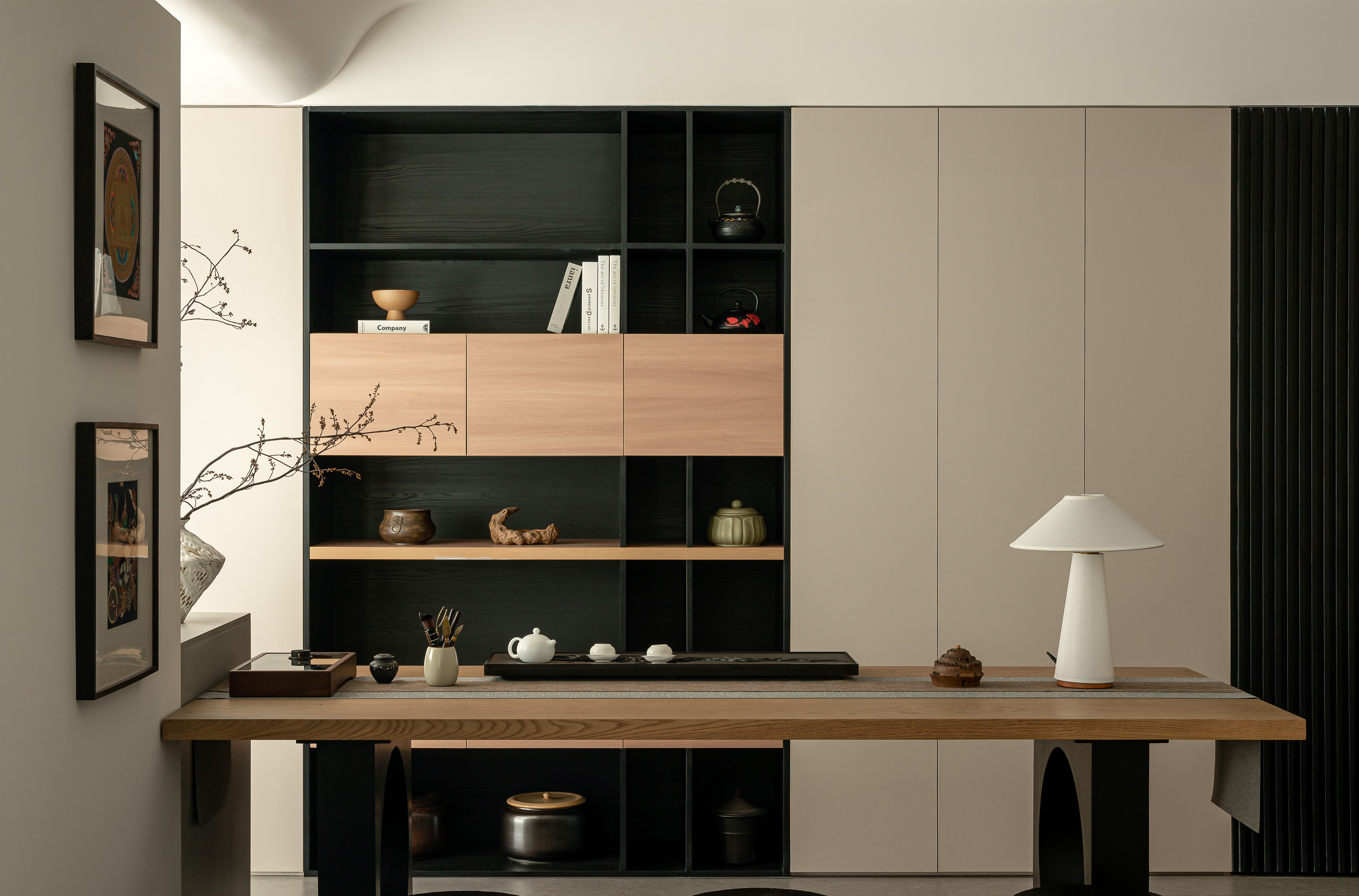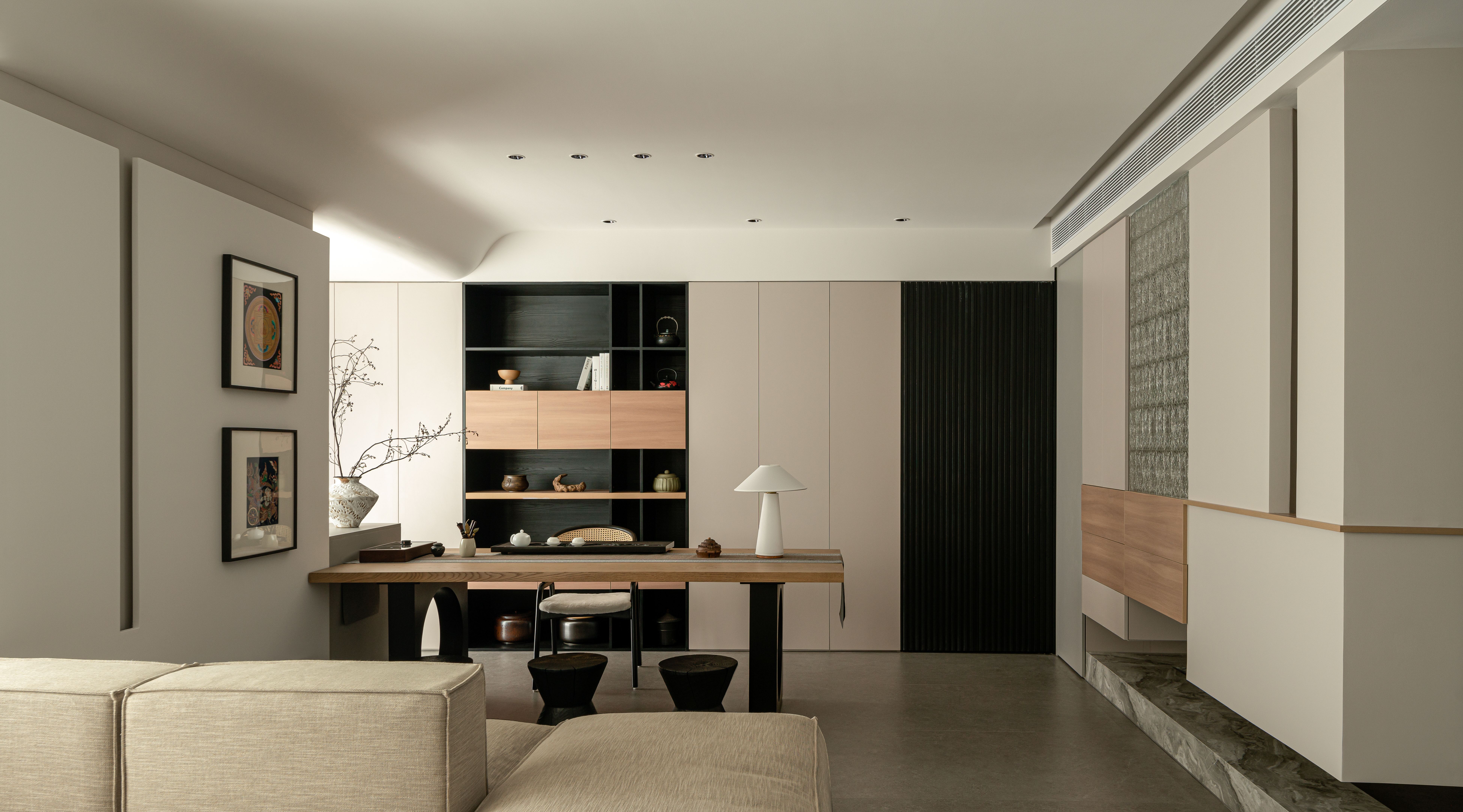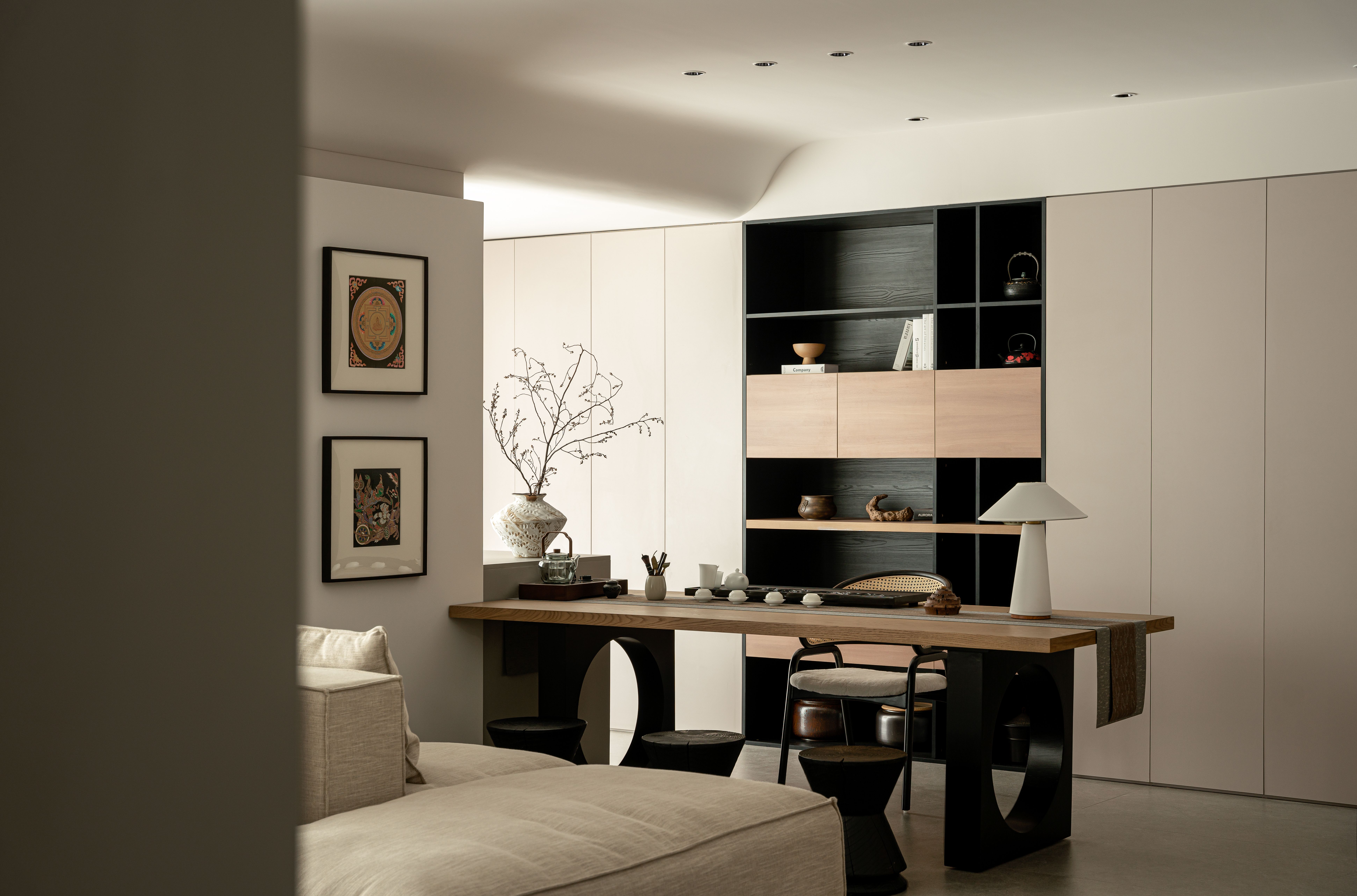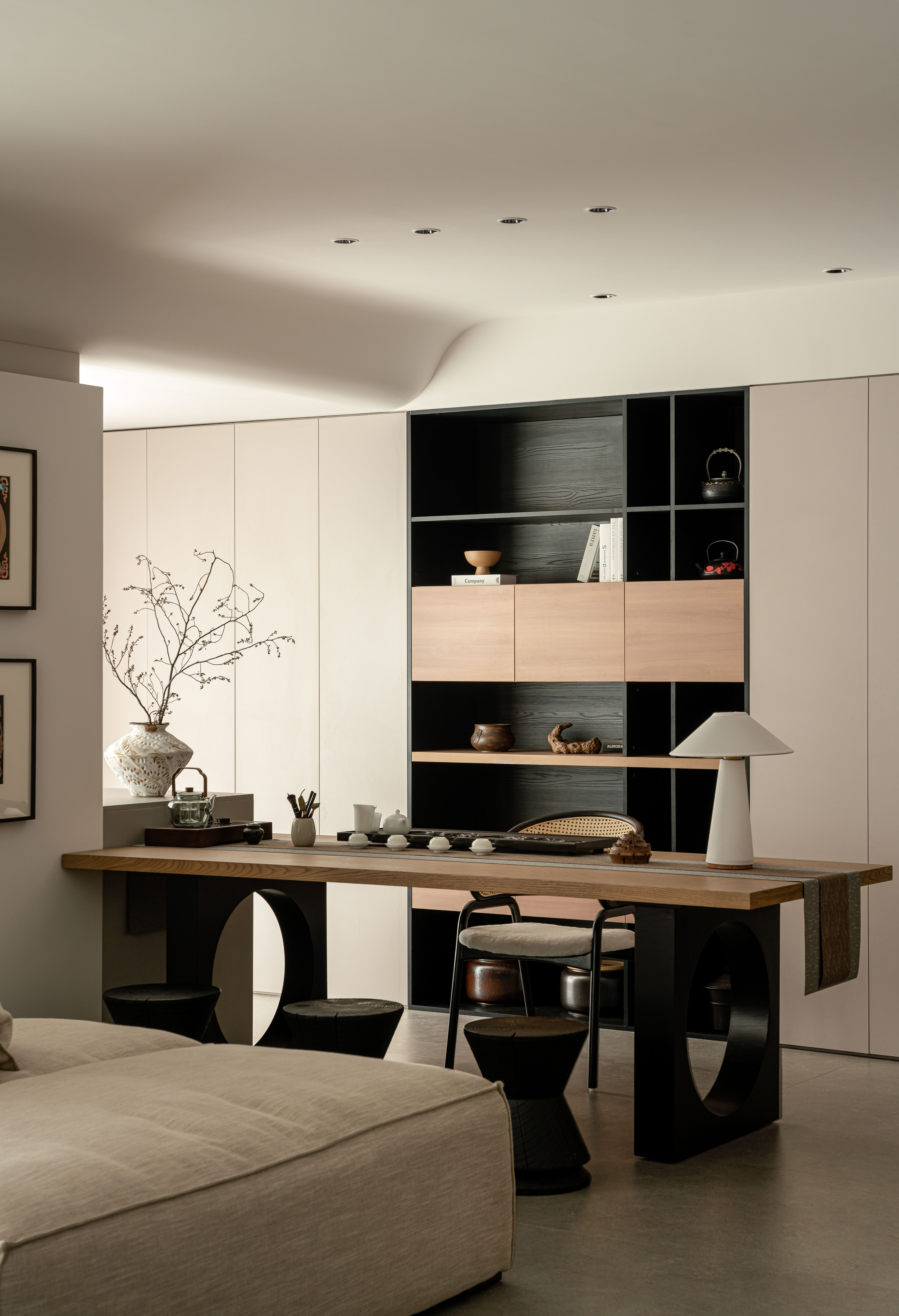空间整体把景观阳台融入客厅后,围绕一部分无法拆除的承重墙做功能布局规划,将客厅、阳台、茶室、办公区、串联起来形成洄游动线,使其原本无法打通的缺陷变为核心区域亮点。