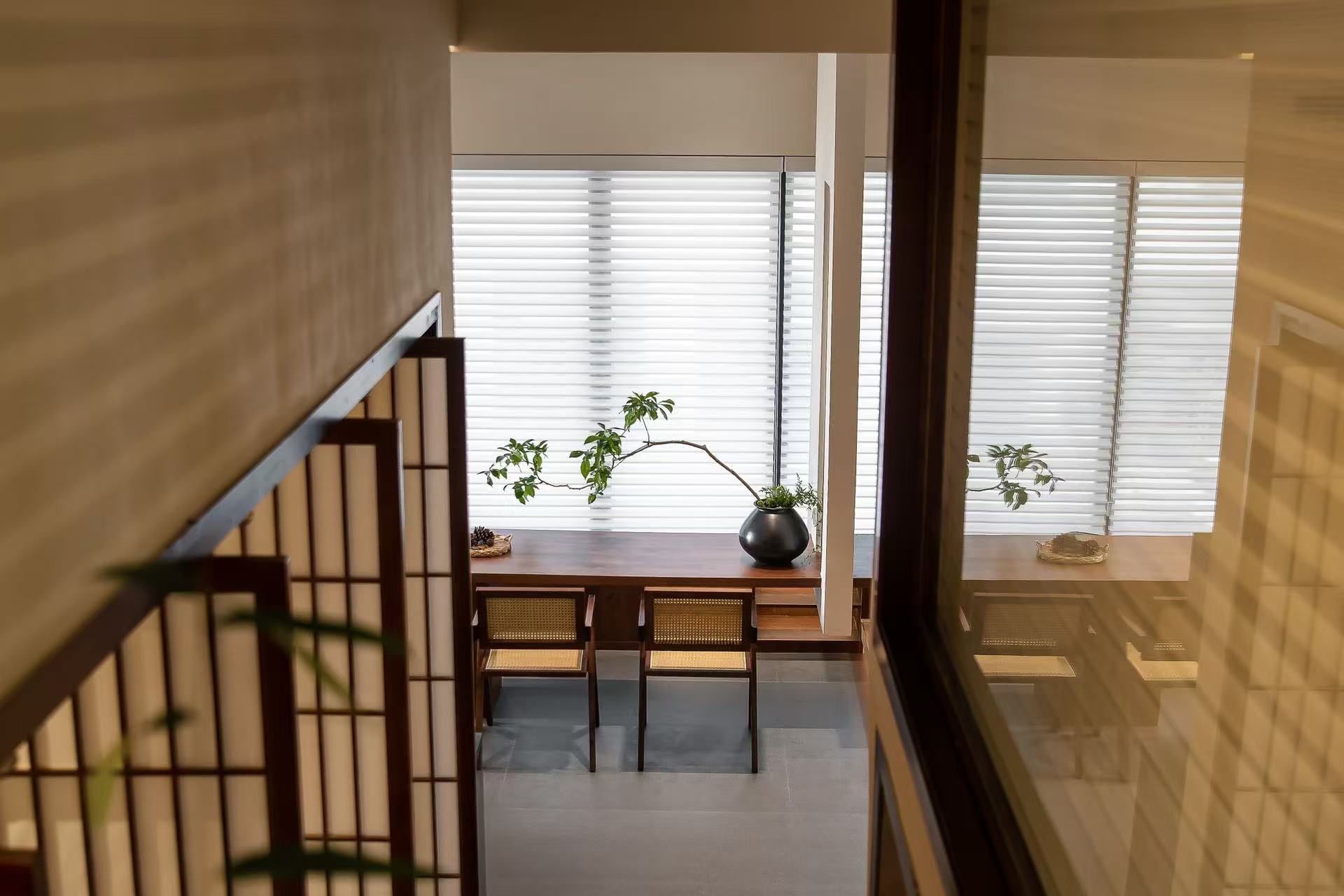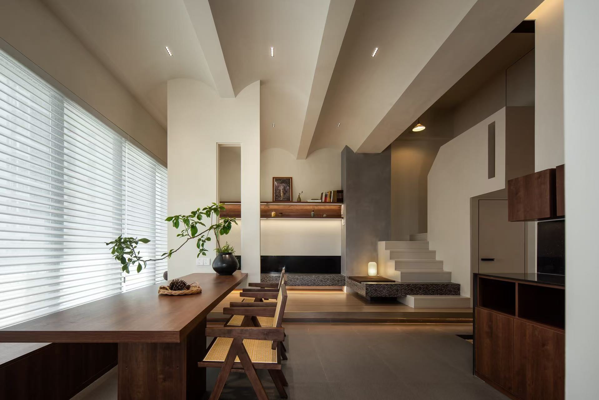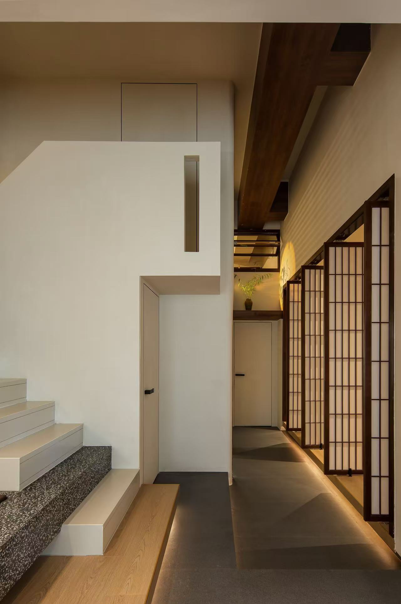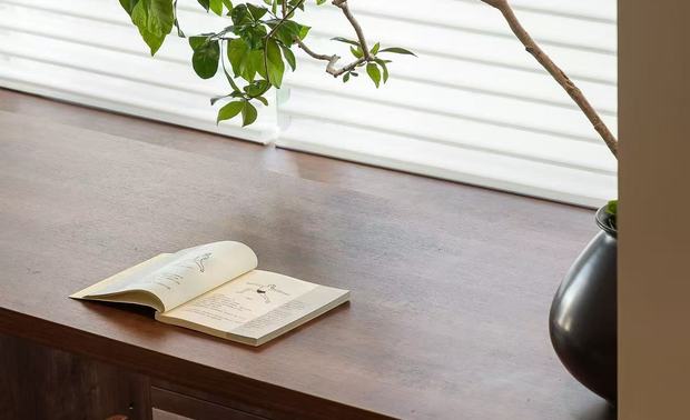 设计选材:在本案设计多数运用实木作主调,就如宛如一位优雅且极具韵味的主角,错层的高度原梁位和实木花格门都运用的木头的本质自感,显著着实木的色彩,从淡雅的棕褐,有着丰富的层次变化,无需过多修饰,便能营造出或温馨质朴、或沉稳大气的氛围。