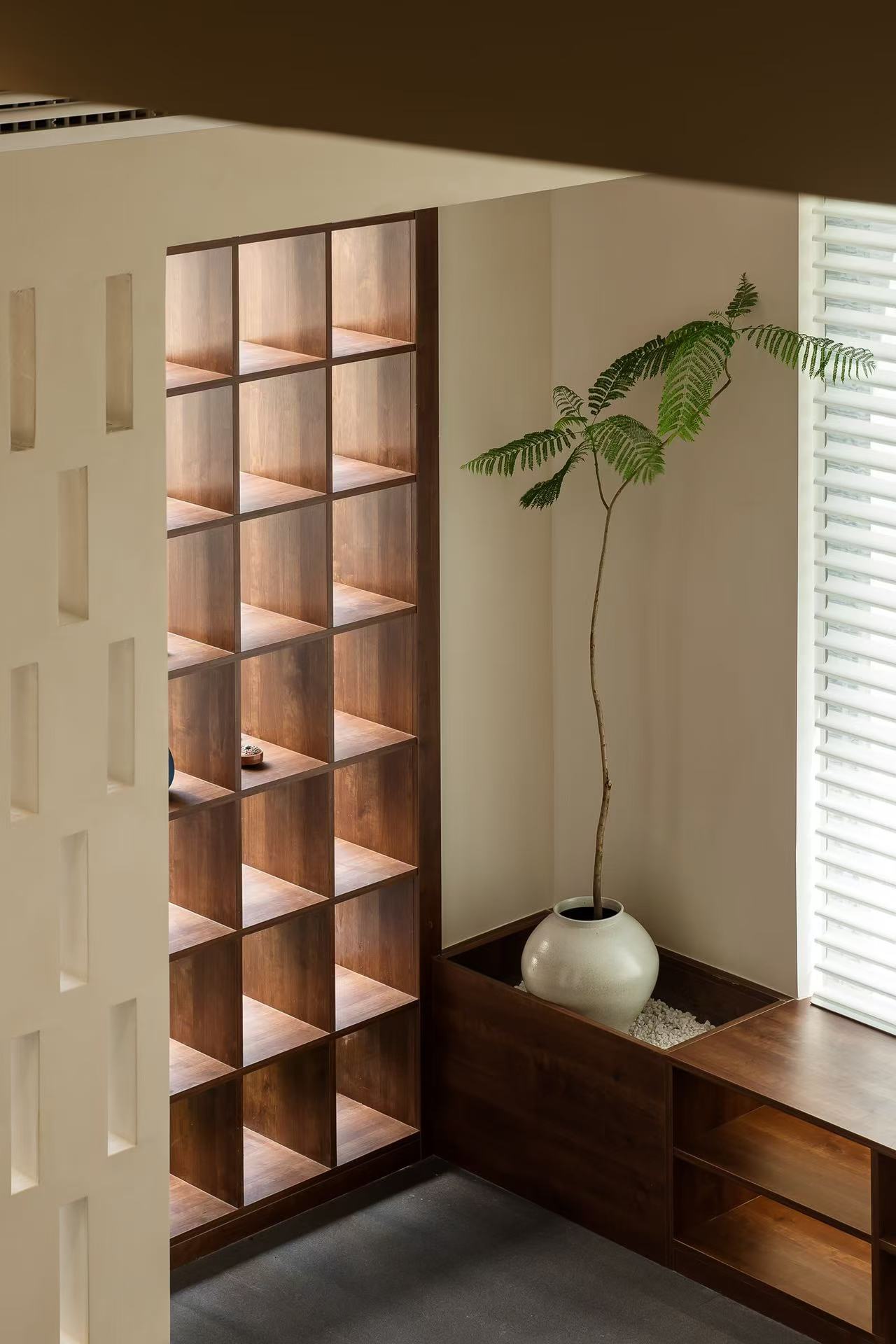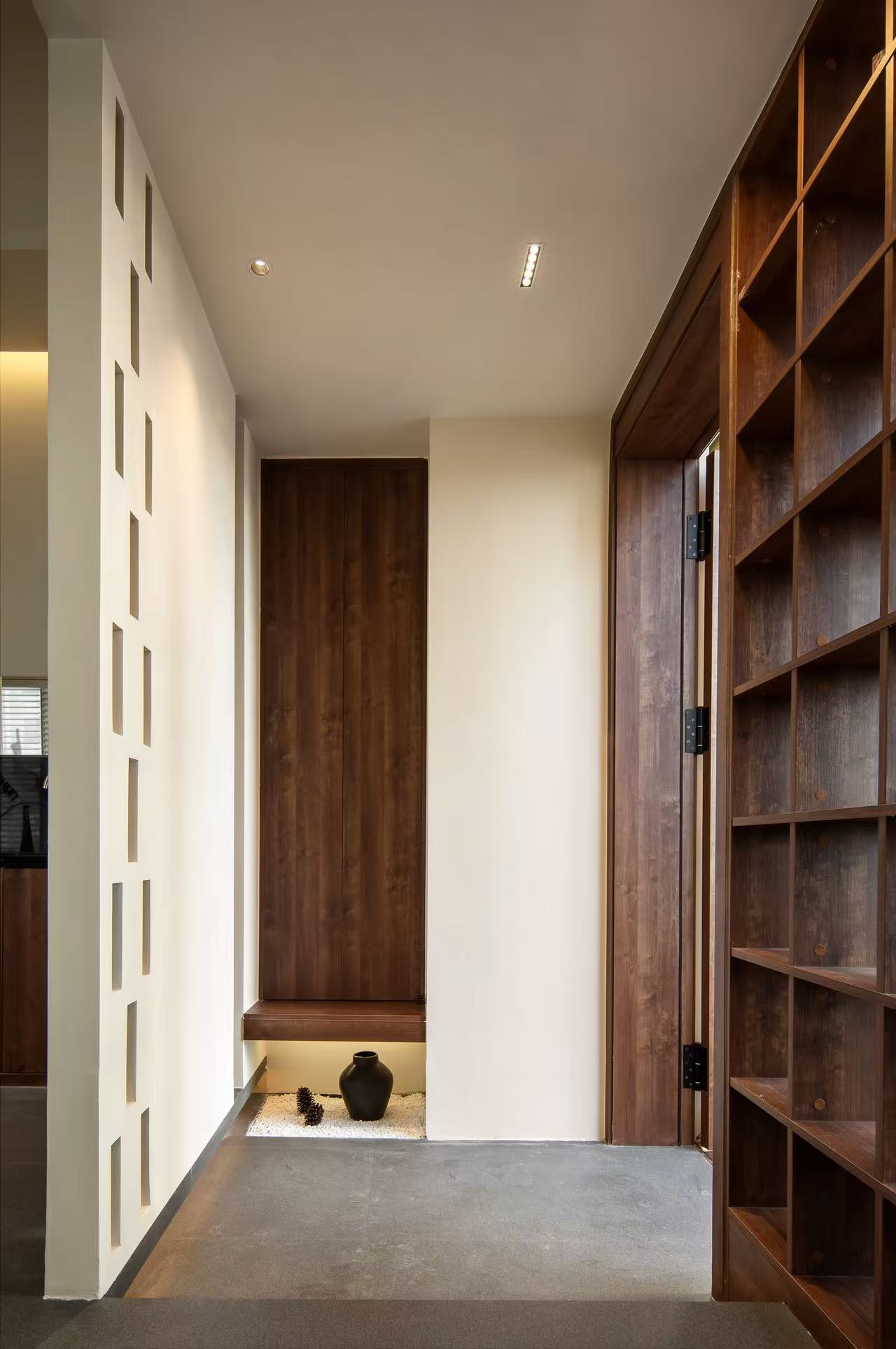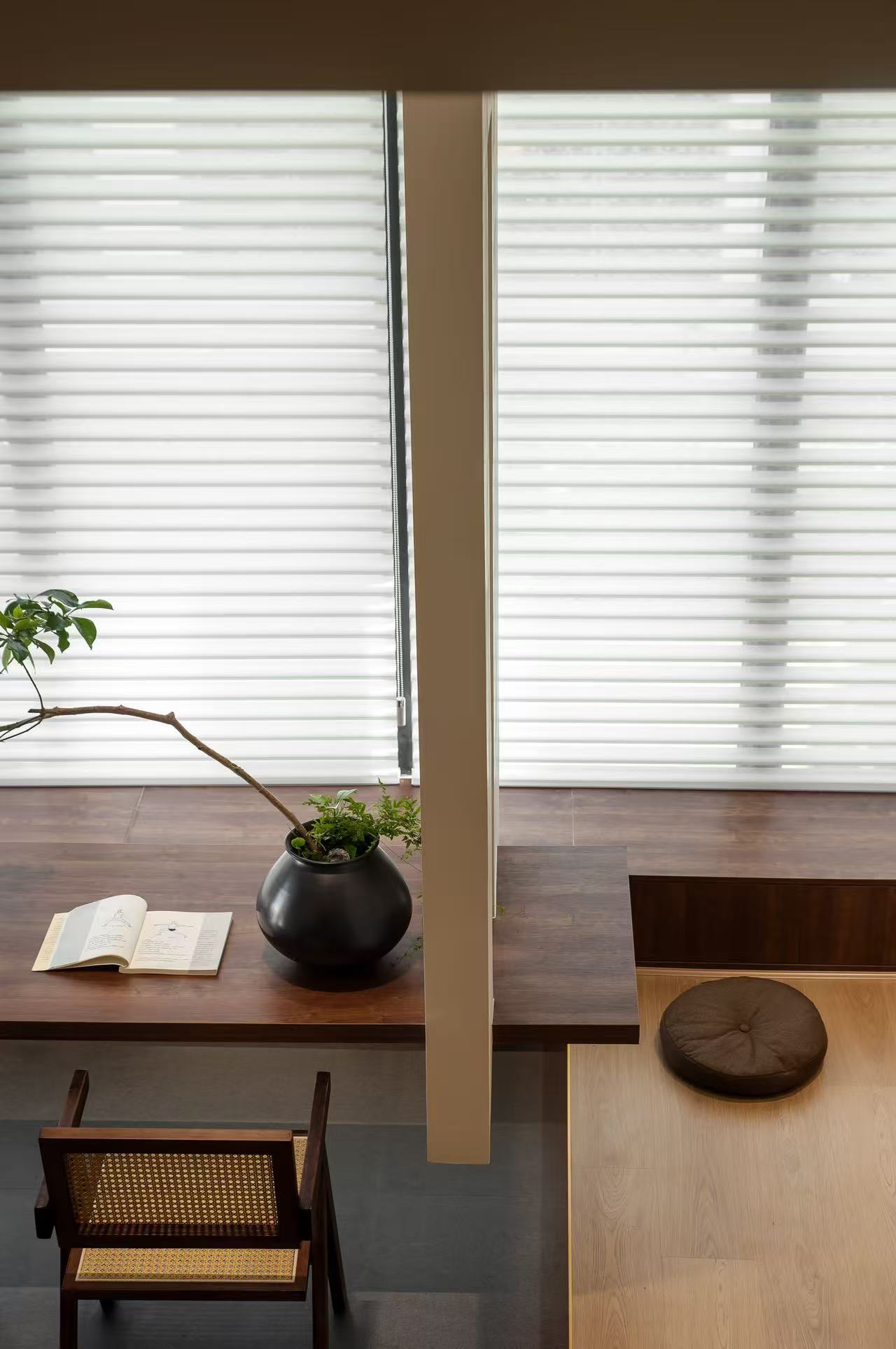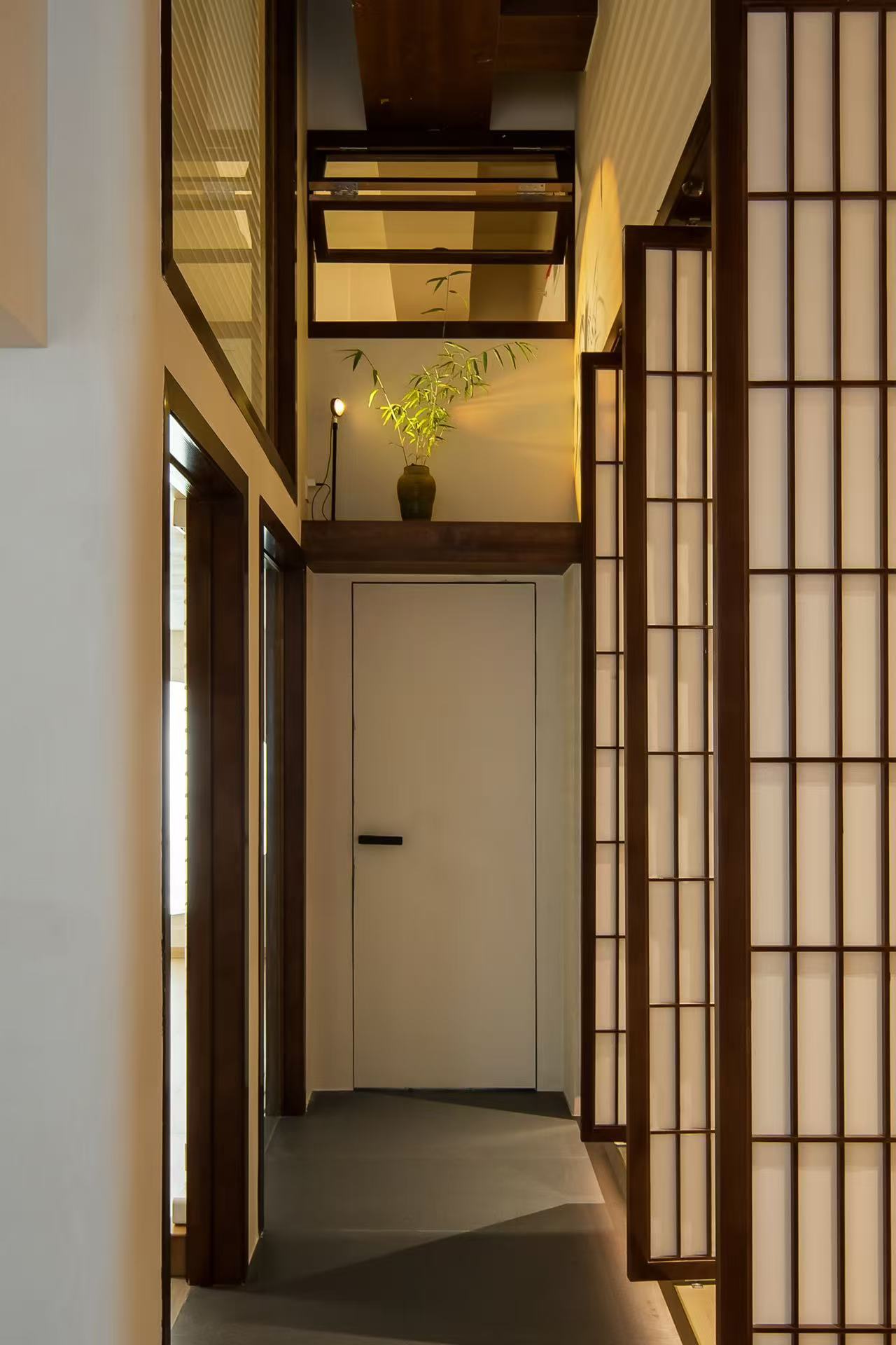 设计选材:在本案设计多数运用实木作主调,就如宛如一位优雅且极具韵味的主角,错层的高度原梁位和实木花格门都运用的木头的本质自感,显著着实木的色彩,从淡雅的棕褐,有着丰富的层次变化,无需过多修饰,便能营造出或温馨质朴、或沉稳大气的氛围。