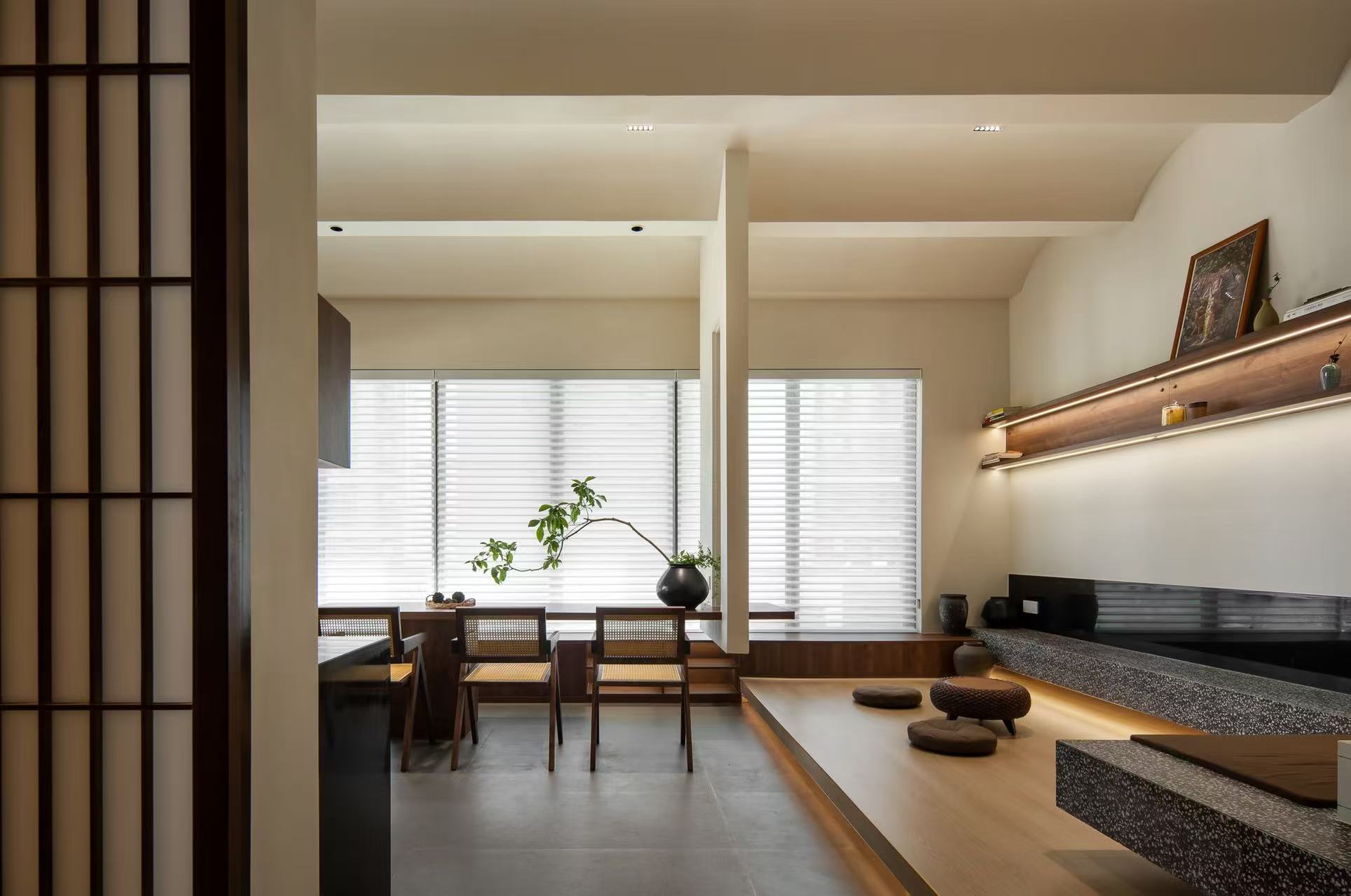 空间意境:整体空间色调选取了柔和的米白、浅灰与温润木色,营造出舒缓、静谧的视觉感受。墙面采用米白色艺术漆,其质感细腻,在不同光线角度下呈现出微妙变化,如同平静湖面上的光影流动,给人以平和安宁之感。地面铺设浅灰色木地板,天然的纹理与色泽散发着质朴气息,让人在踏入的瞬间便能感受到与大地的紧密连接,沉稳且安心。