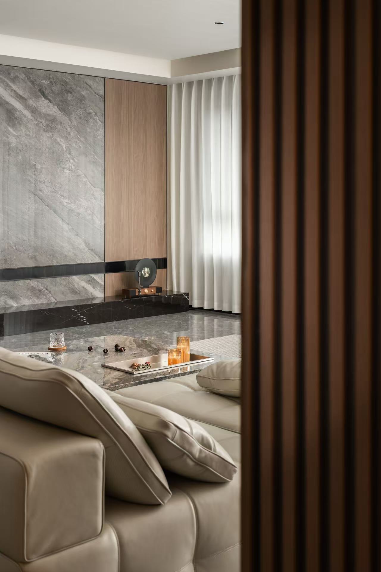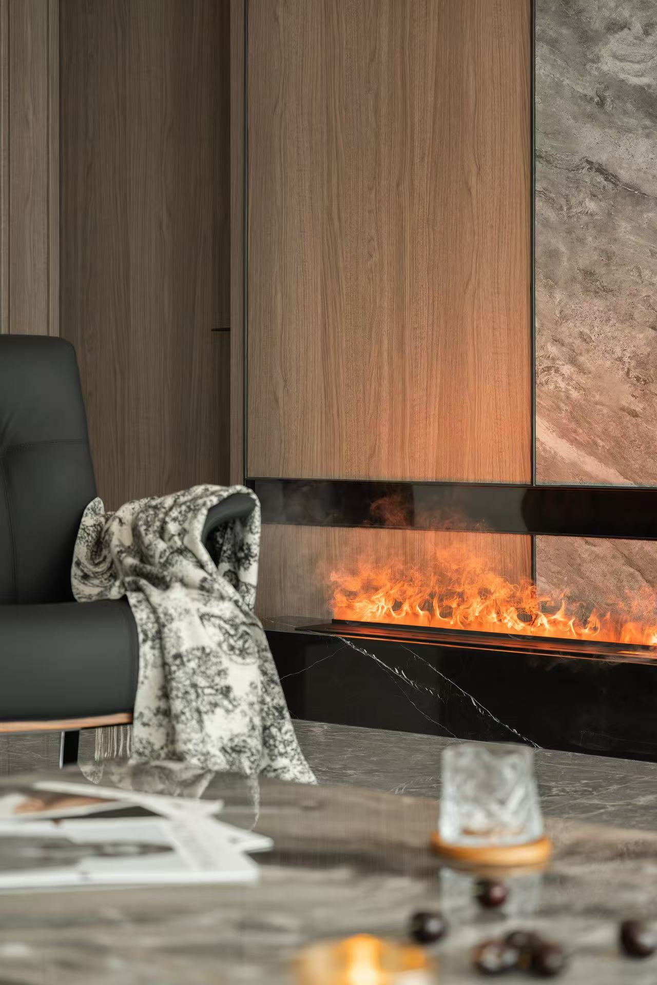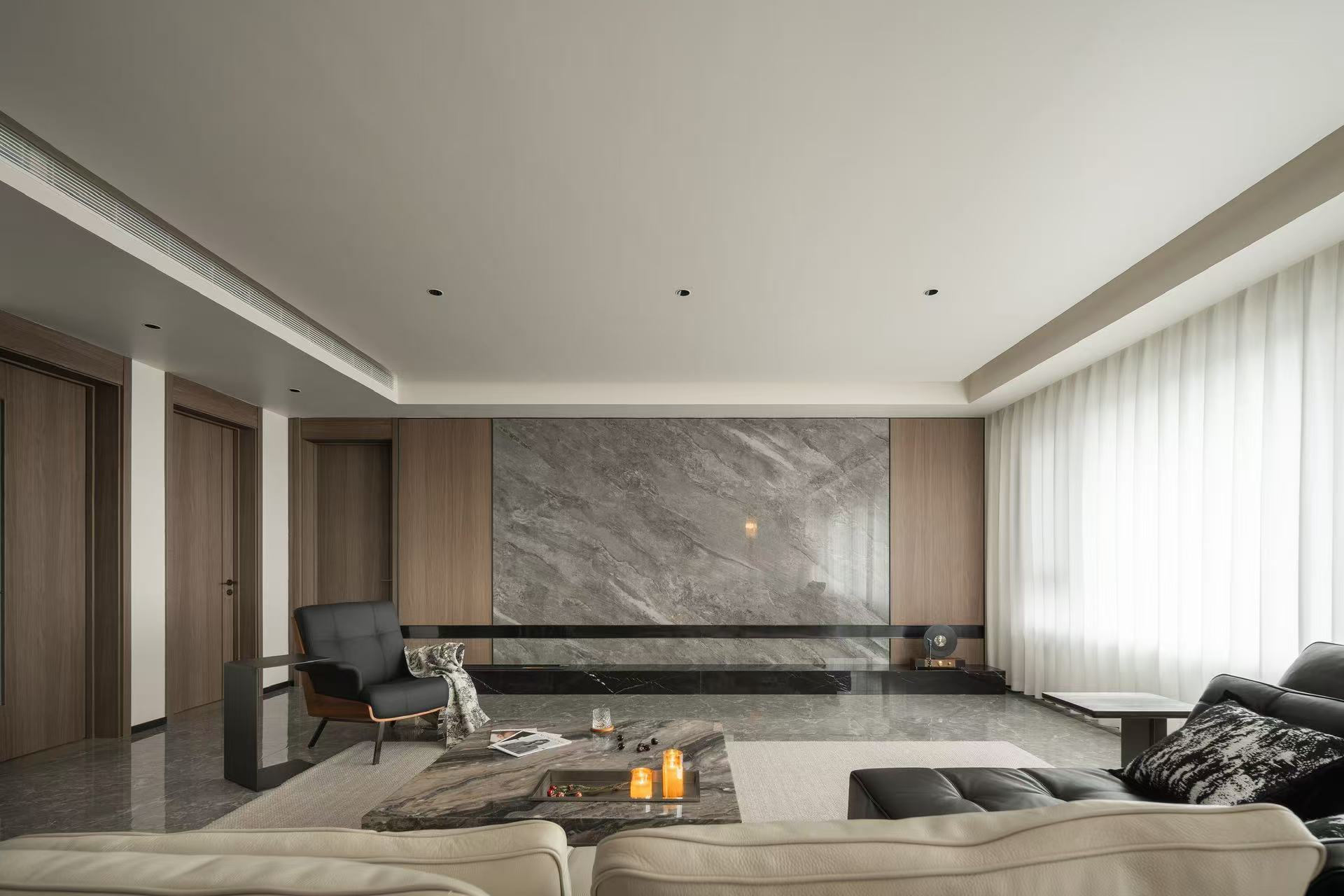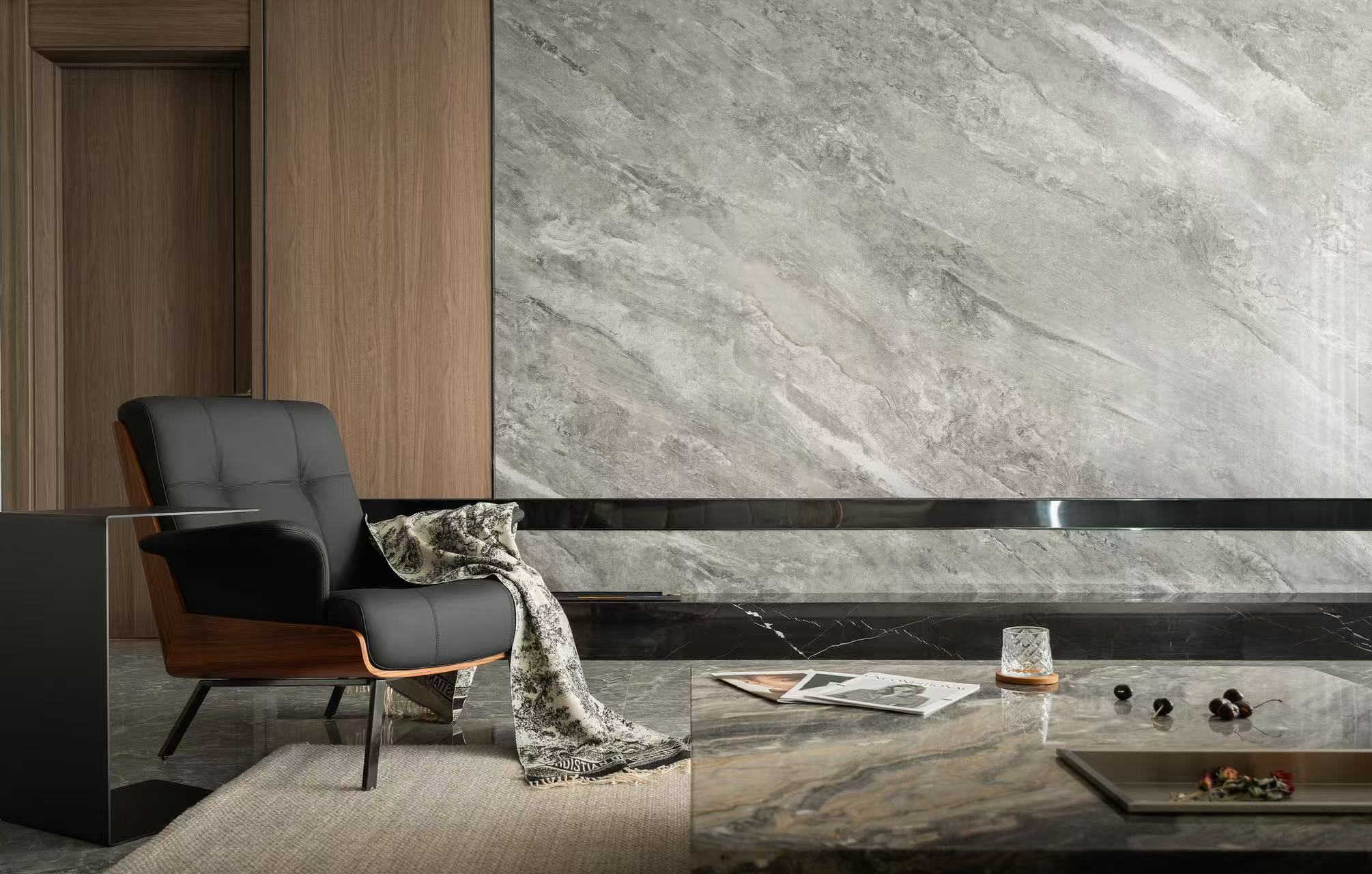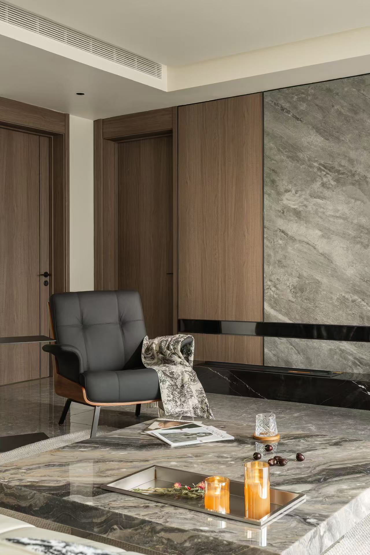材料上以石材为主要元素与木作的环保板材结合。