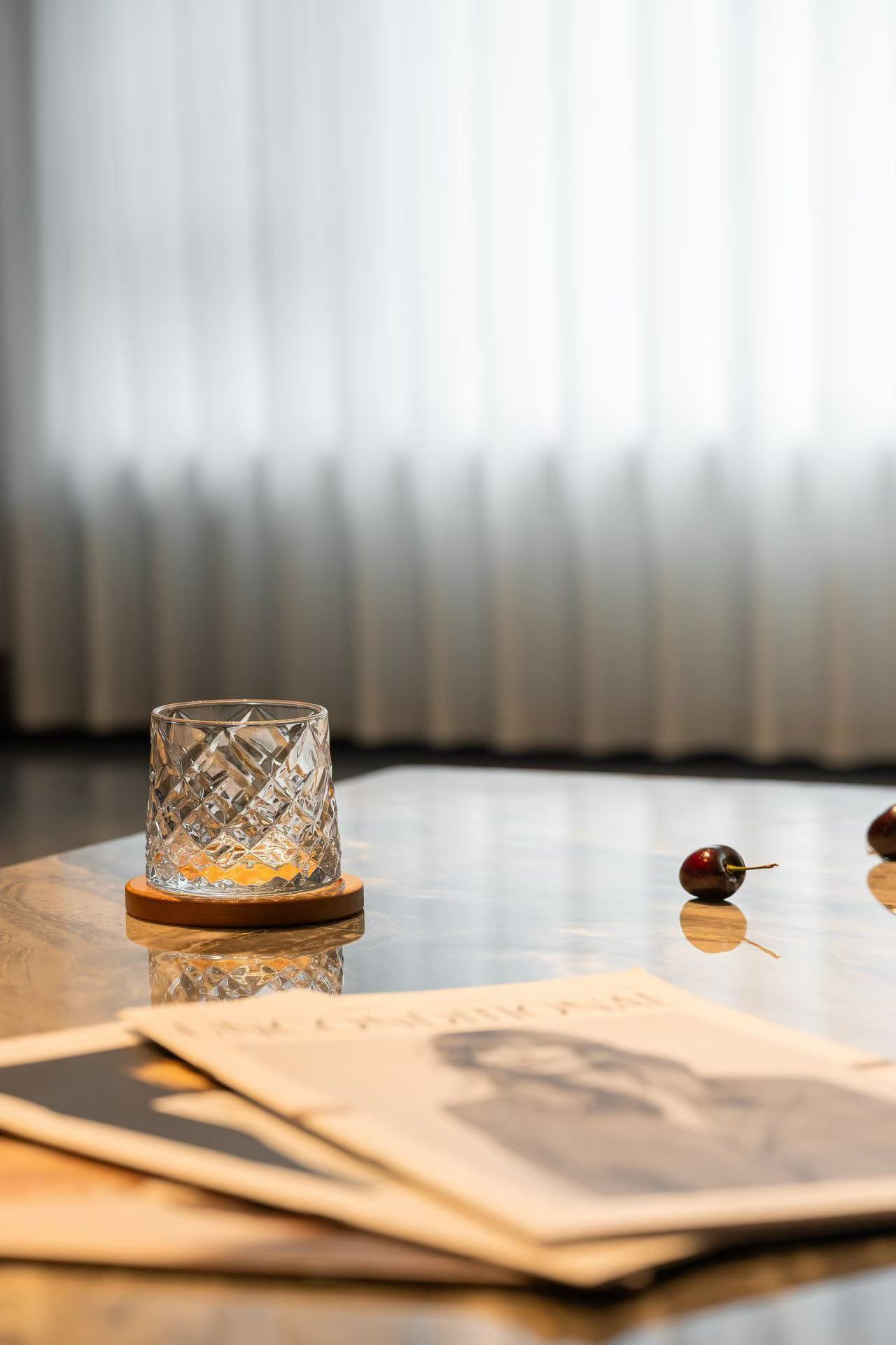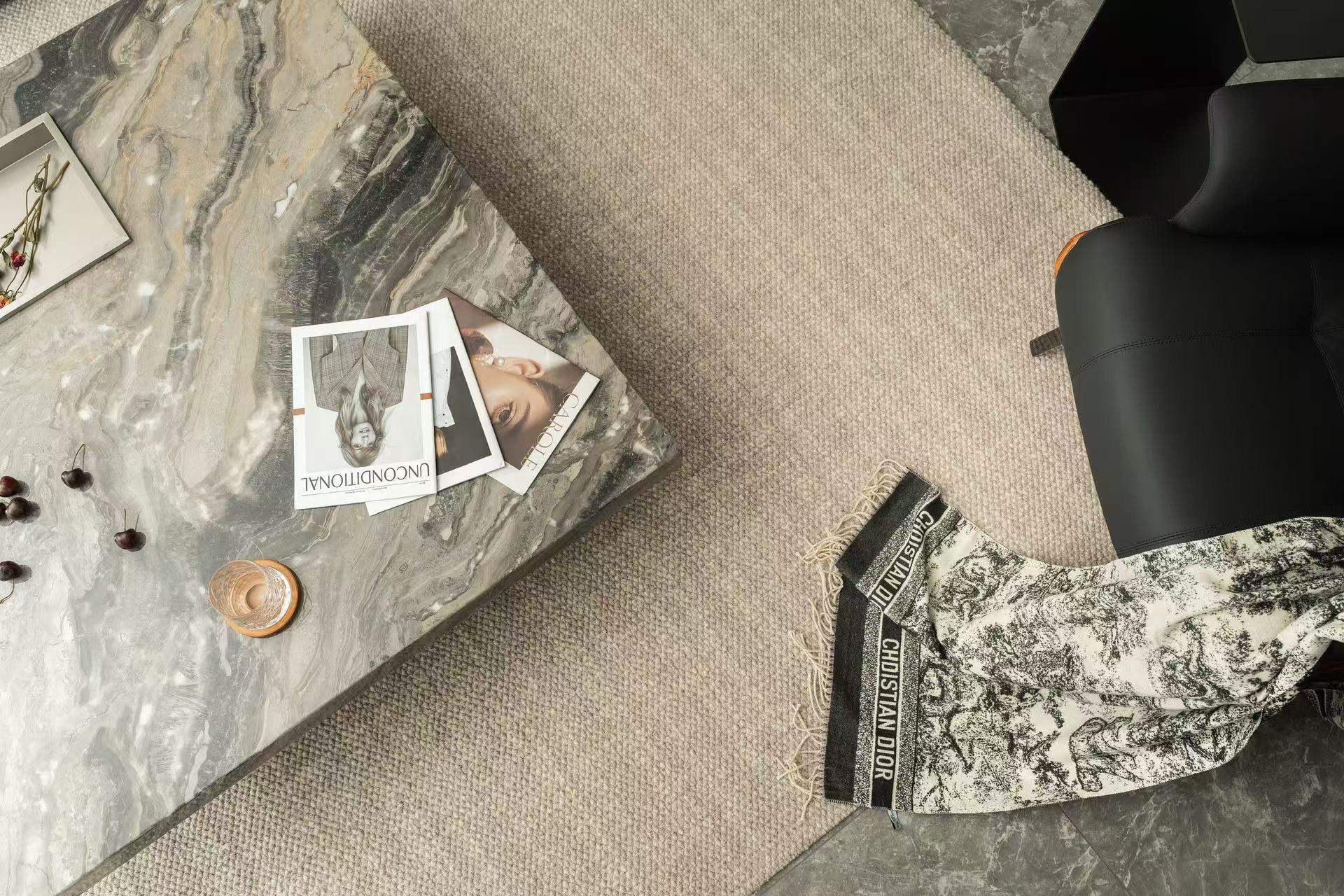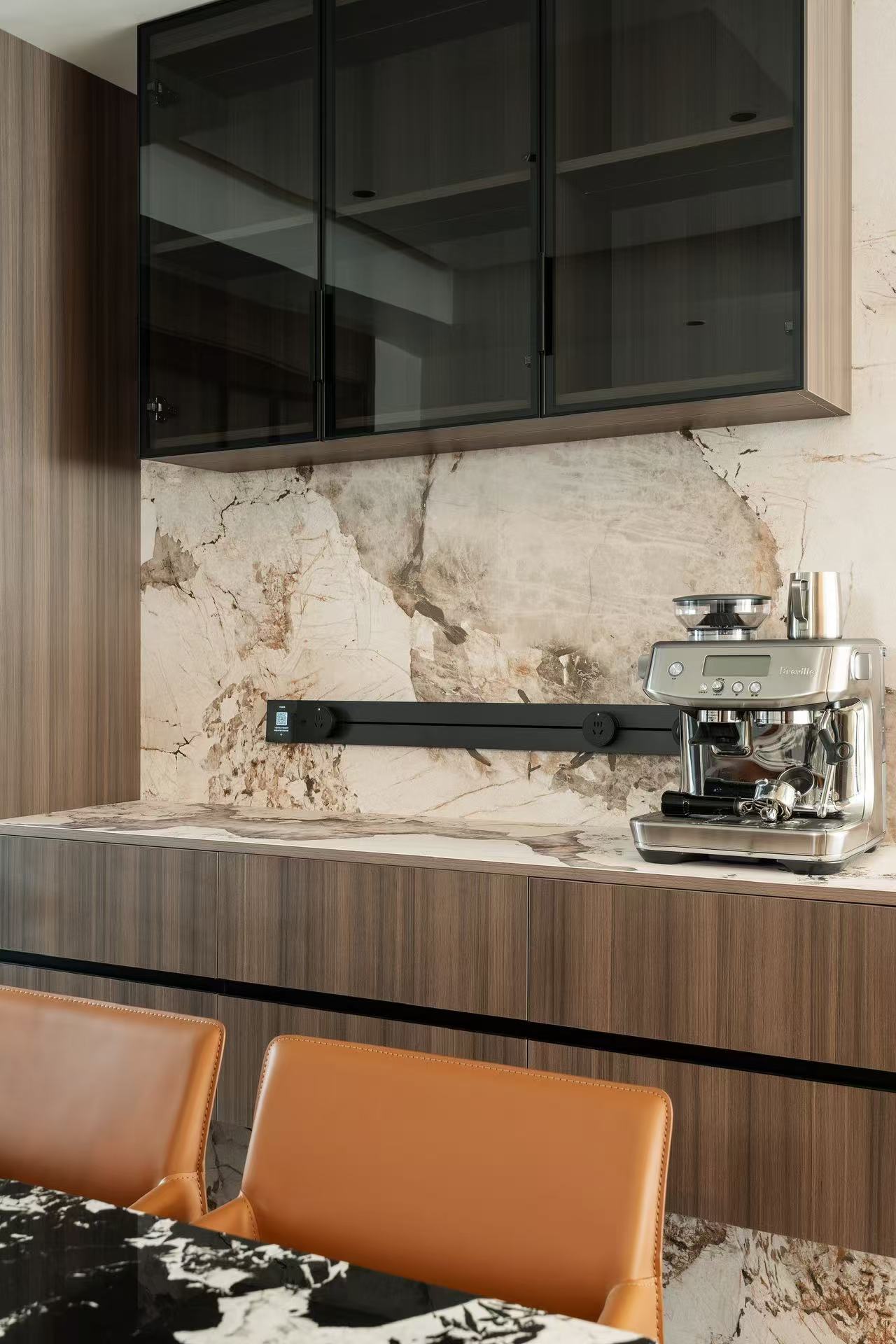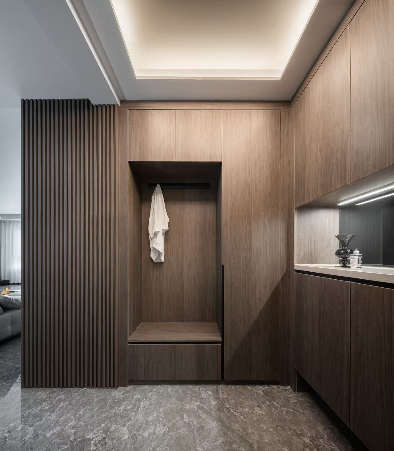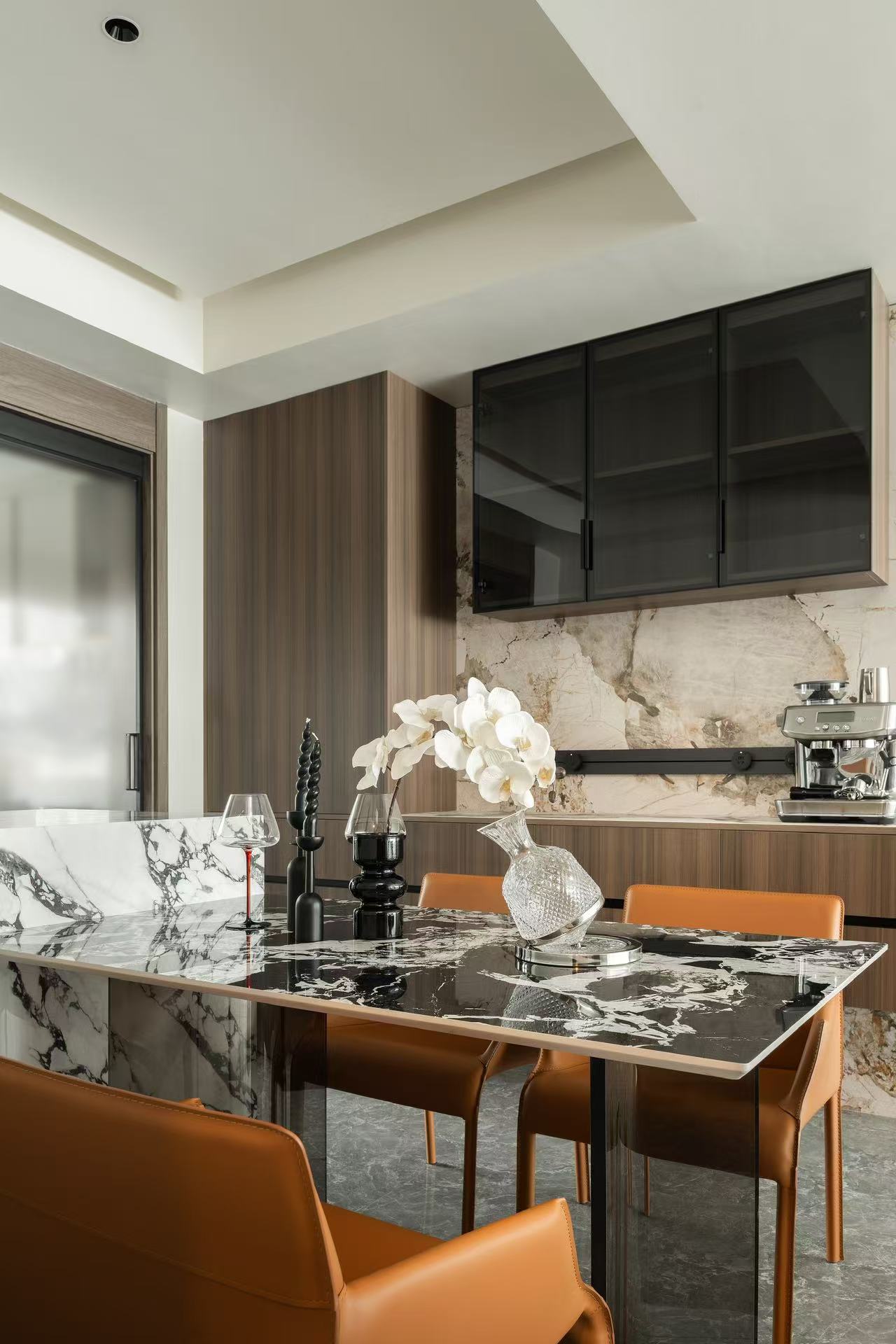 材料上以石材为主要元素与木作的环保板材结合。