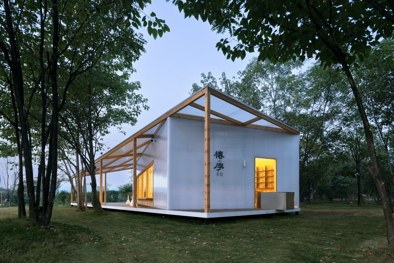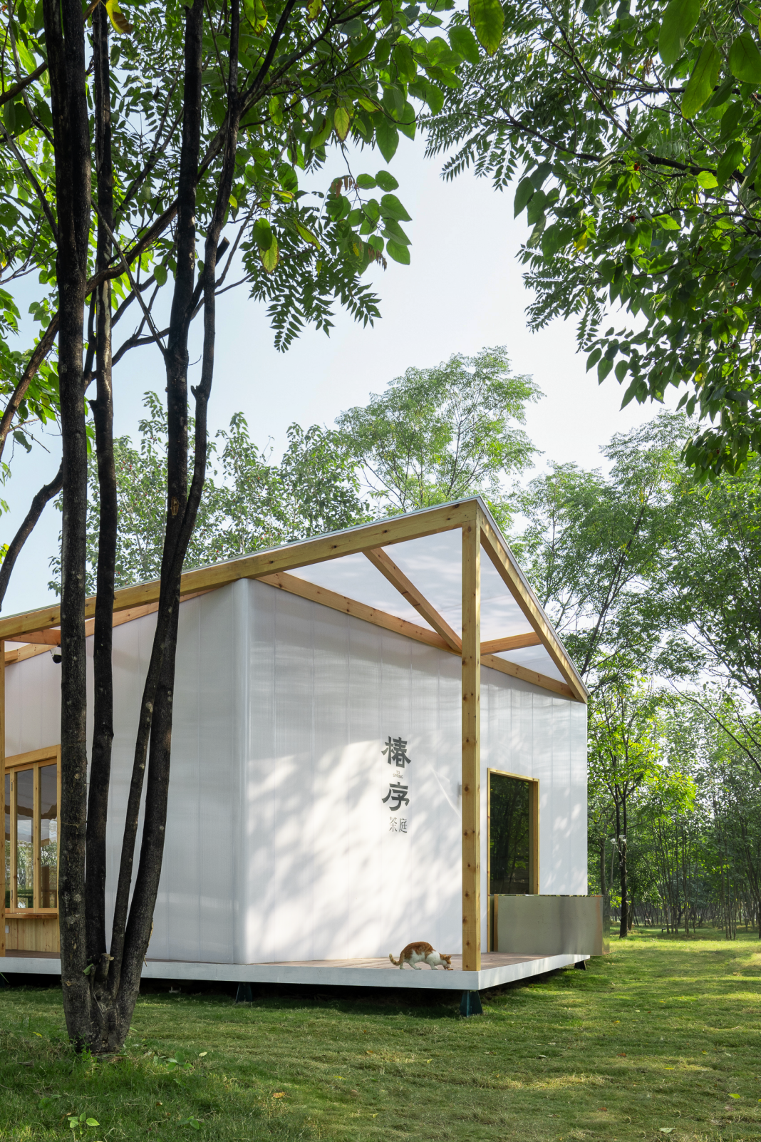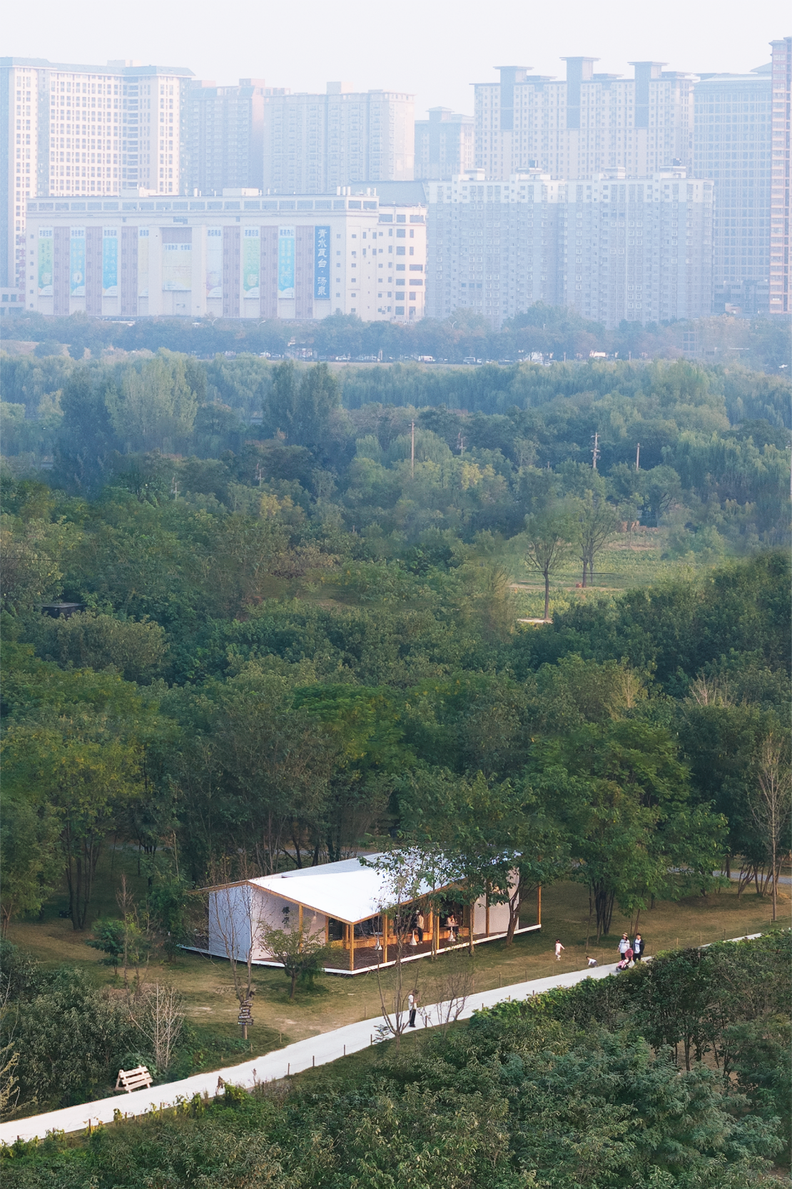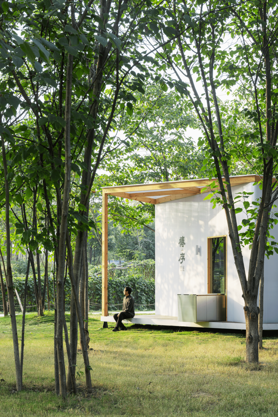 项目定位:场地原为农场内供游客露营的林地,有较强的原始感和松弛度,我们意图建造一座轻质的茶庭建筑,最大程度的保护原始林地,任由阳光与微风穿过,并以此安抚城市人群负重的心灵。