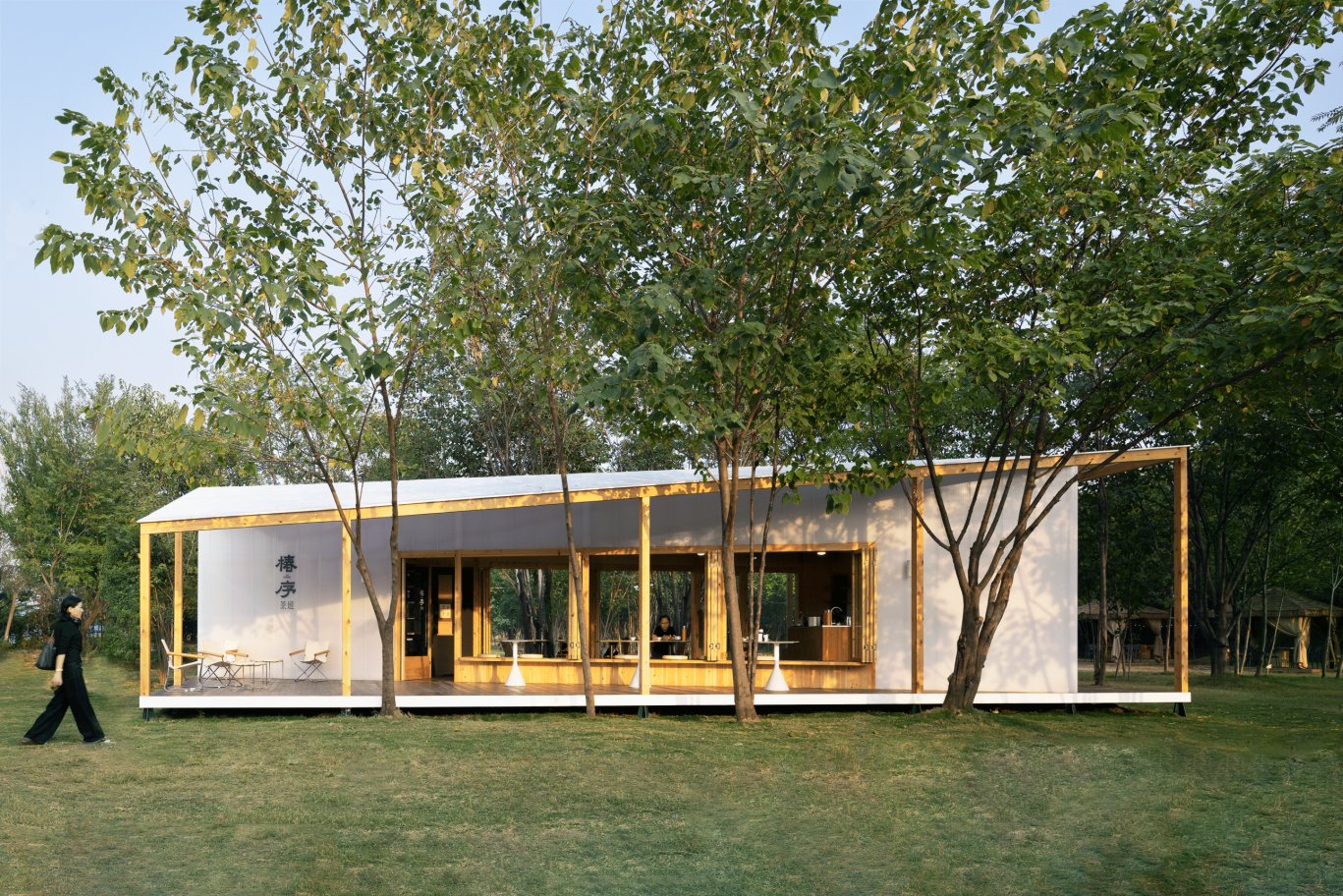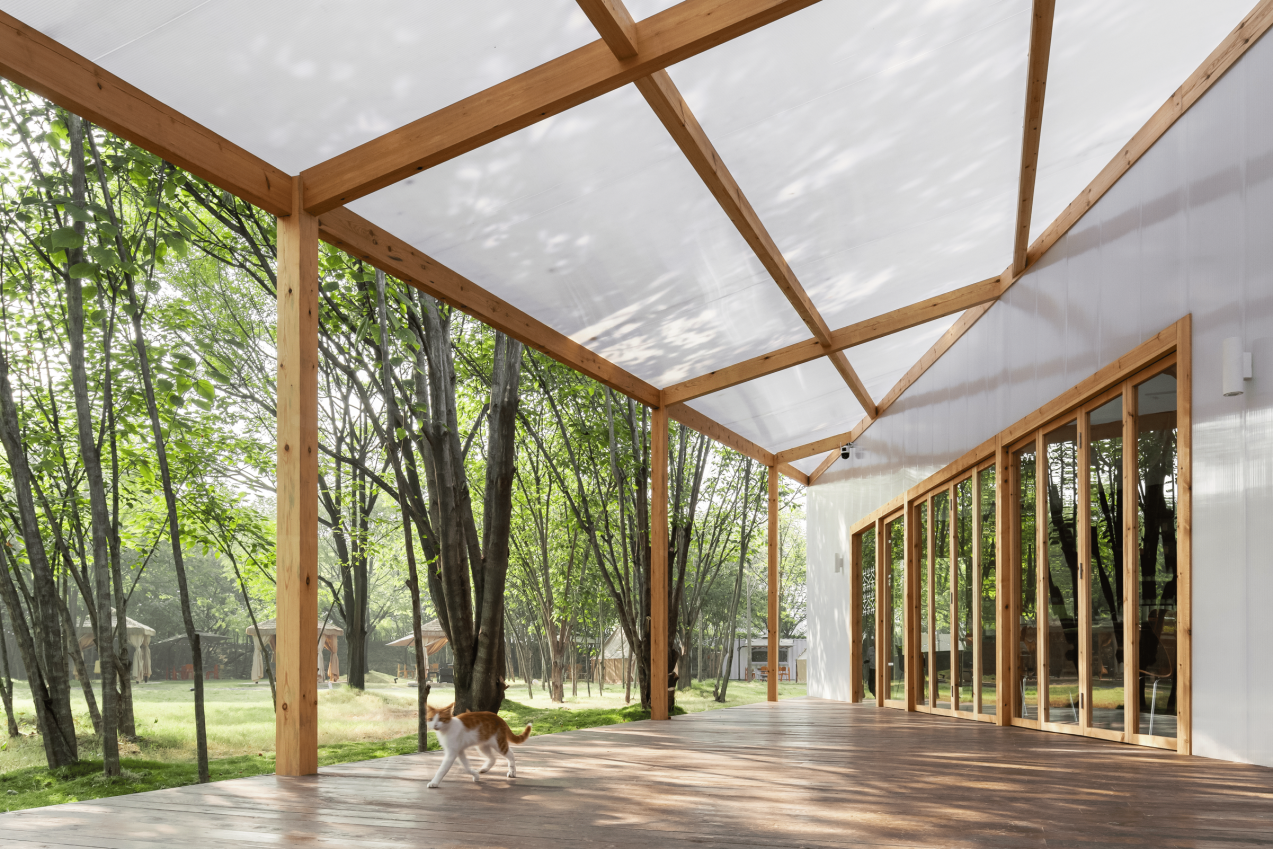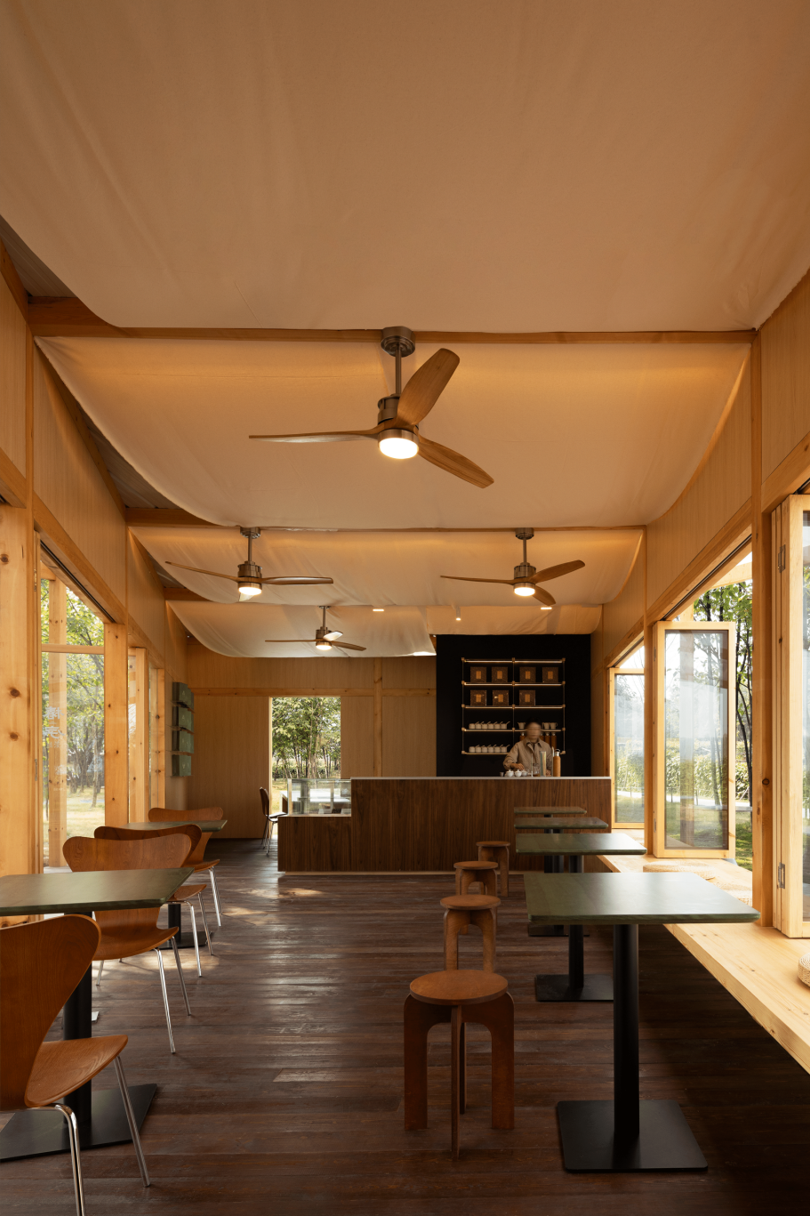 项目定位:场地原为农场内供游客露营的林地,有较强的原始感和松弛度,我们意图建造一座轻质的茶庭建筑,最大程度的保护原始林地,任由阳光与微风穿过,并以此安抚城市人群负重的心灵。