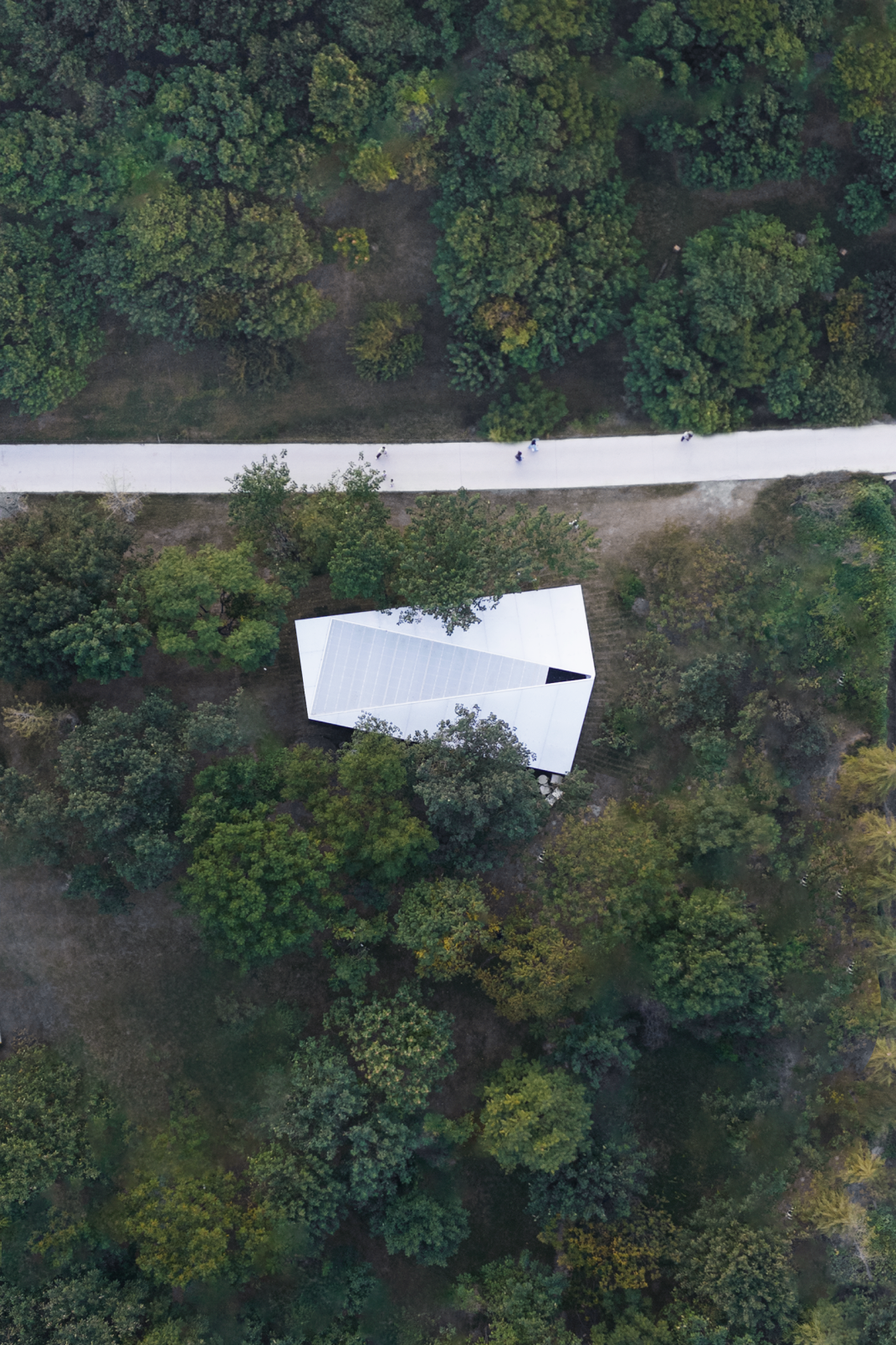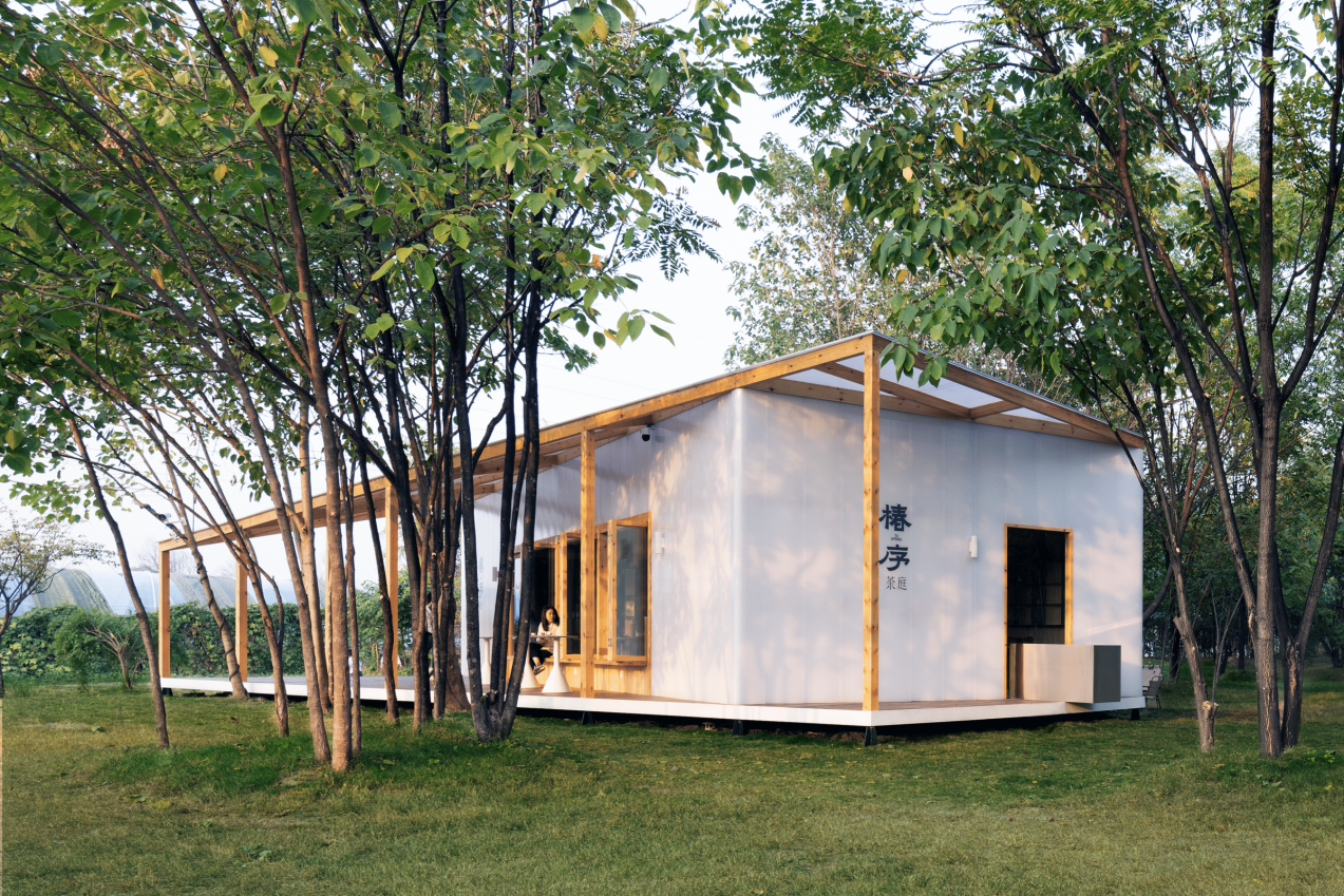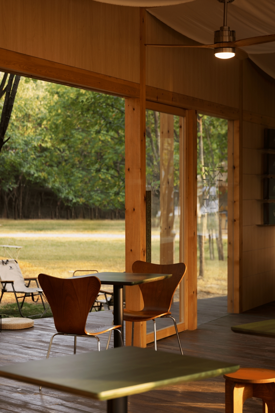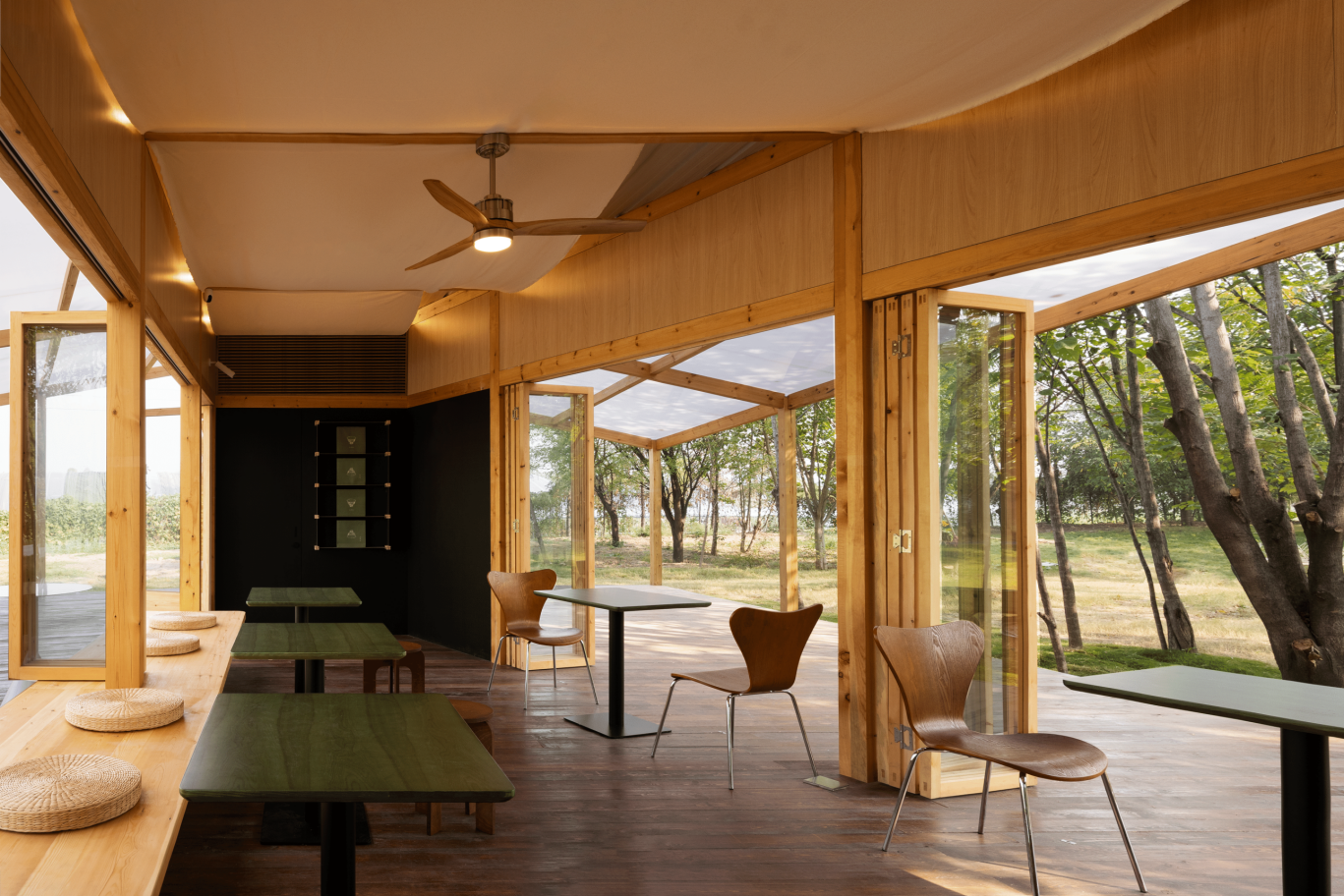 项目定位:场地原为农场内供游客露营的林地,有较强的原始感和松弛度,我们意图建造一座轻质的茶庭建筑,最大程度的保护原始林地,任由阳光与微风穿过,并以此安抚城市人群负重的心灵。