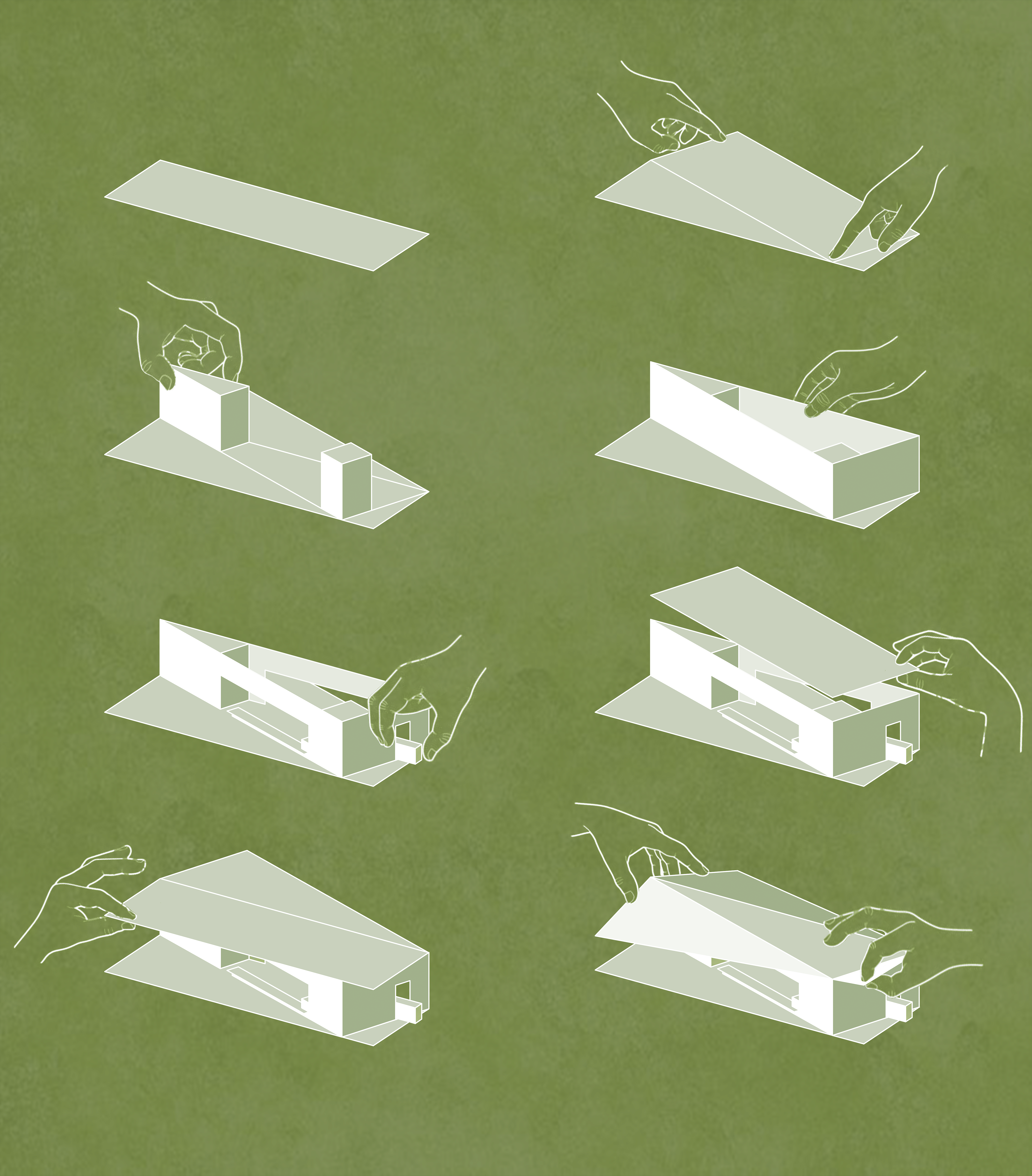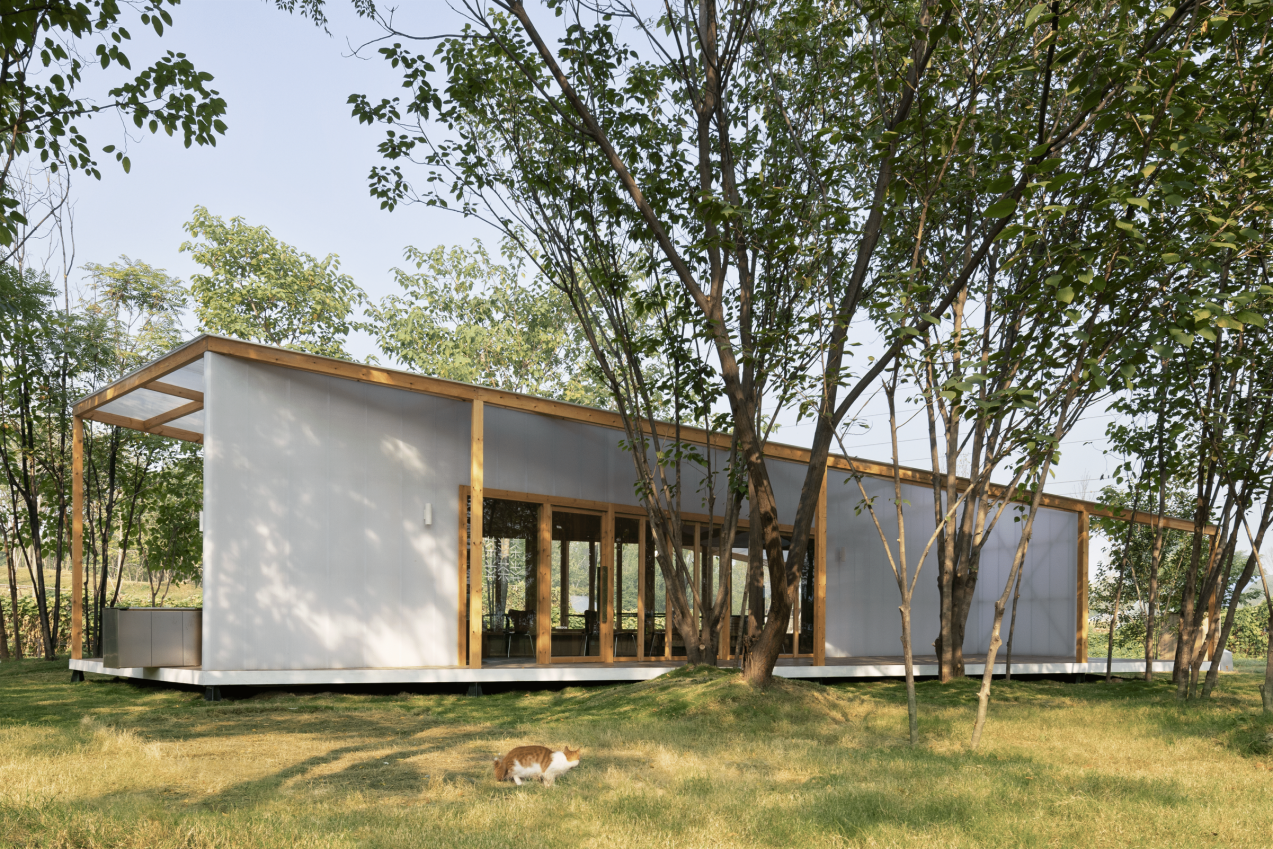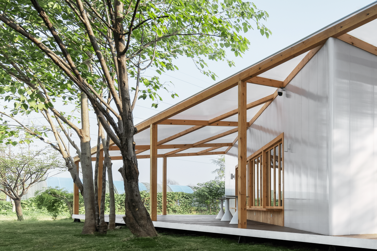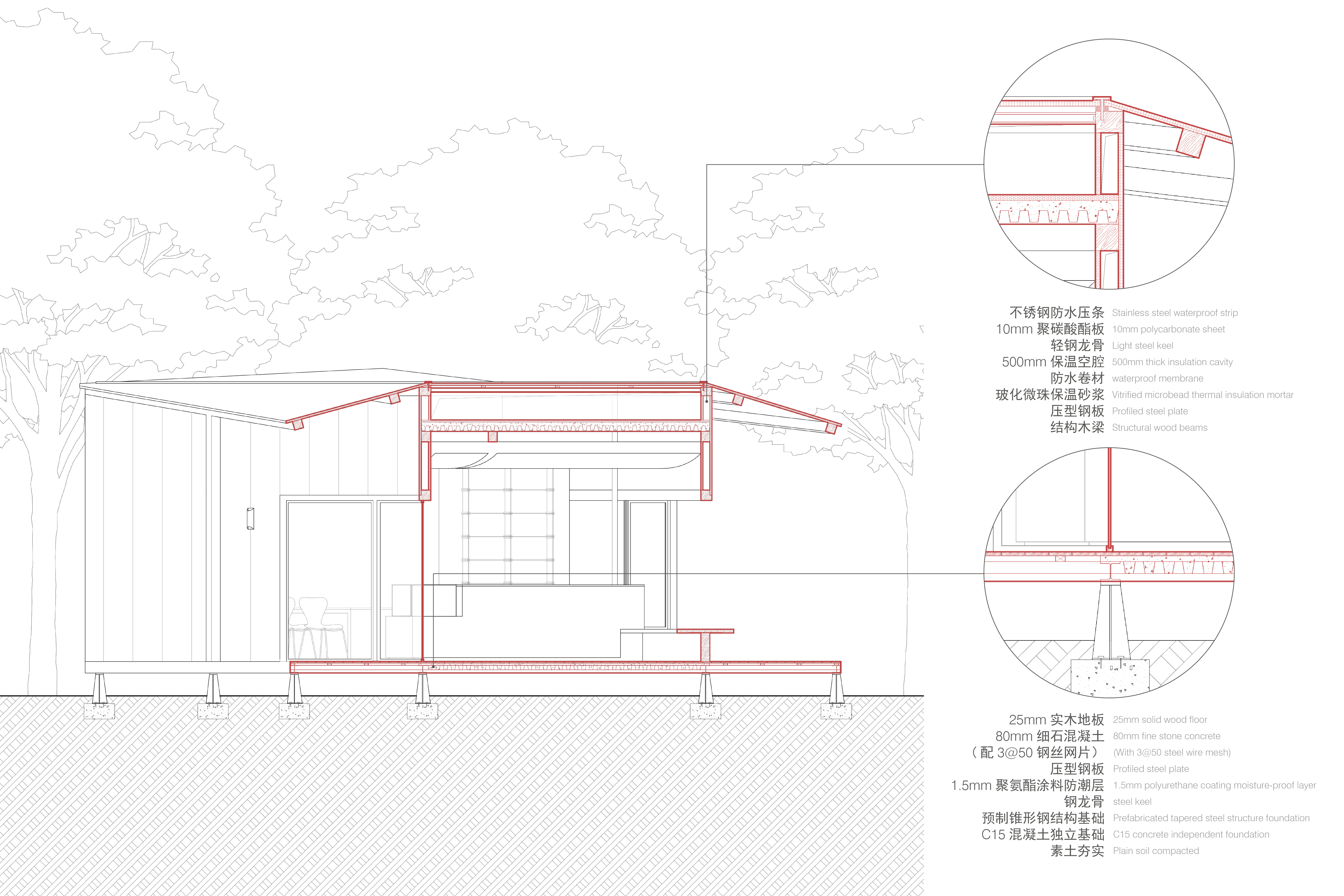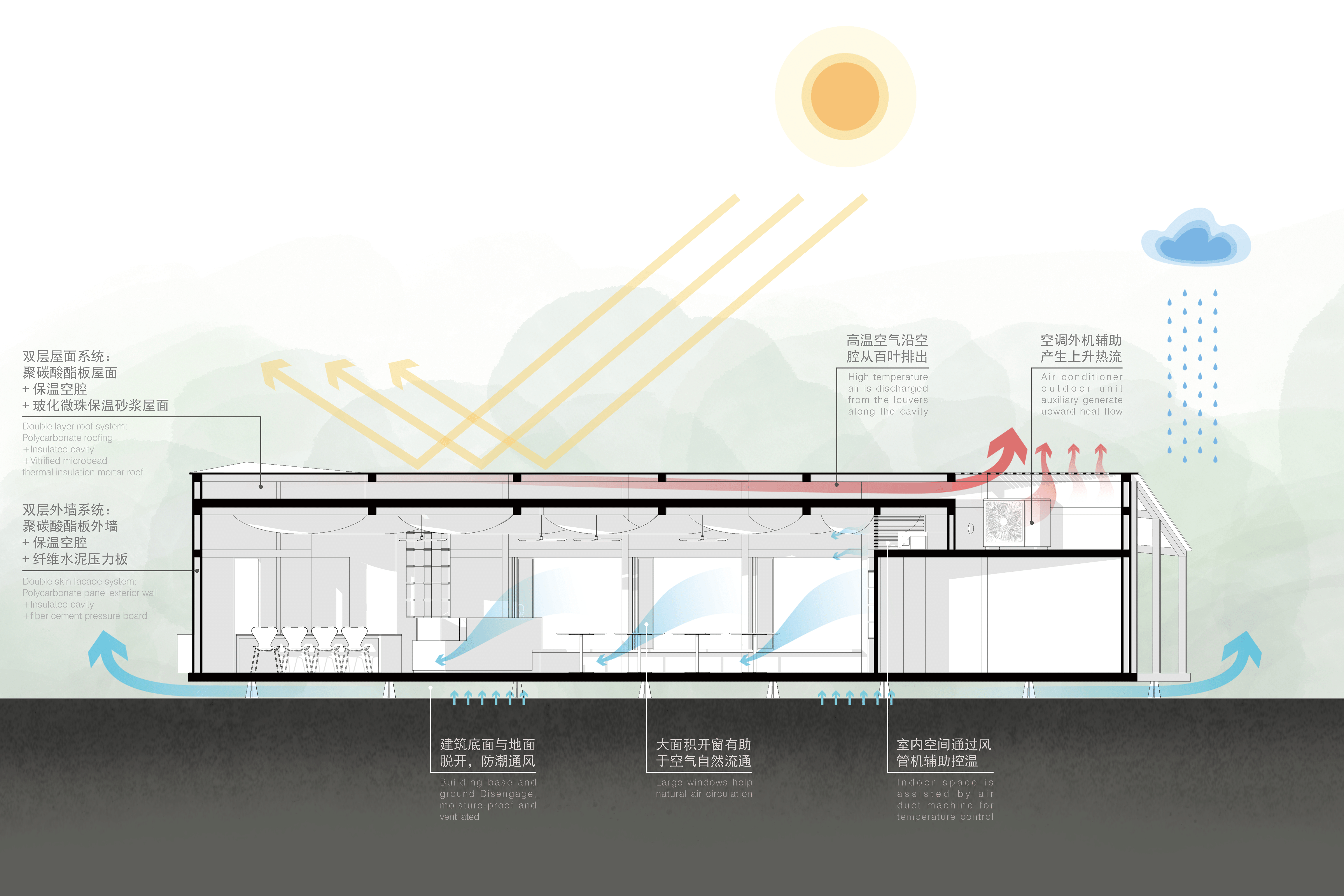 设计选材:1.低能耗建造:设计采用了松木框架主体与轻质的聚碳酸酯板围护,减少了现场施工的湿作业内容并有效缩短了工期。
