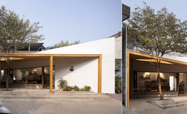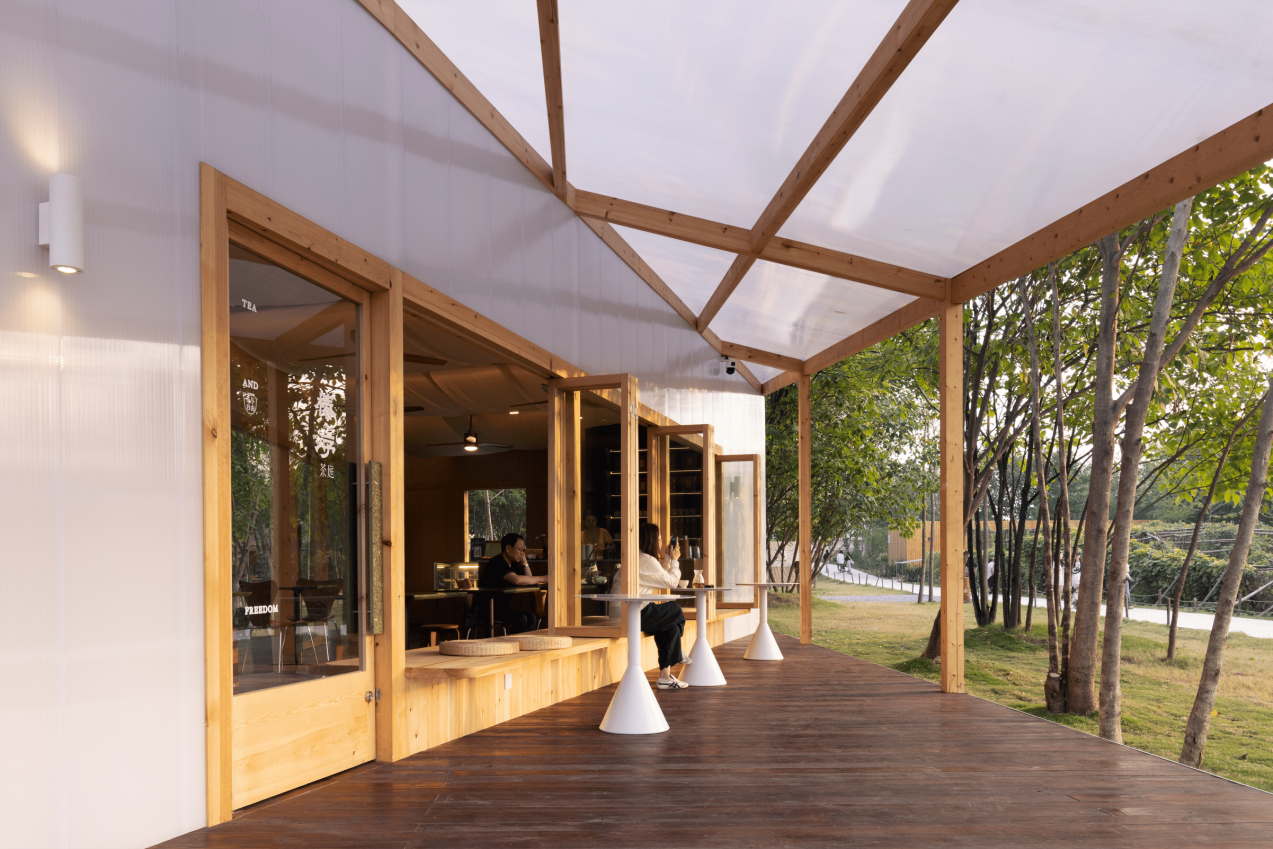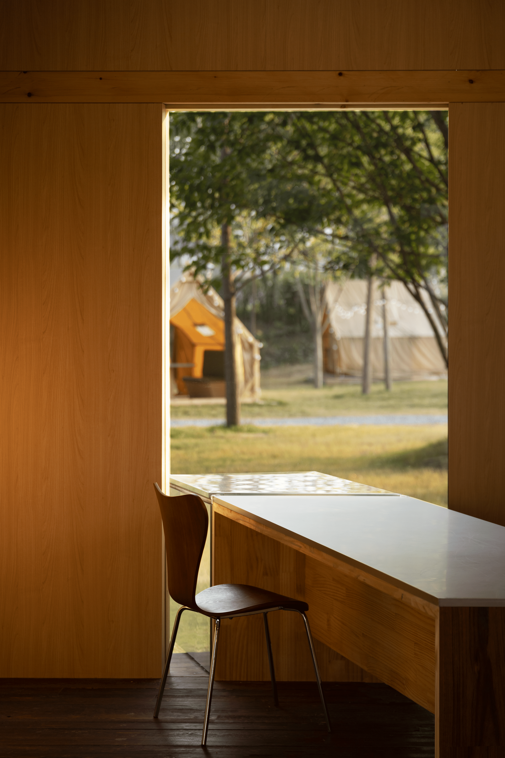 2.室内空间场景:意图营造柔软细腻的“内胆”和漫无目的的宁静氛围,设计保留了暖色的木质梁柱,利用木饰面板进行脱缝填充,并以实木地板通铺室内外,形成了原始质朴的空间氛围。
