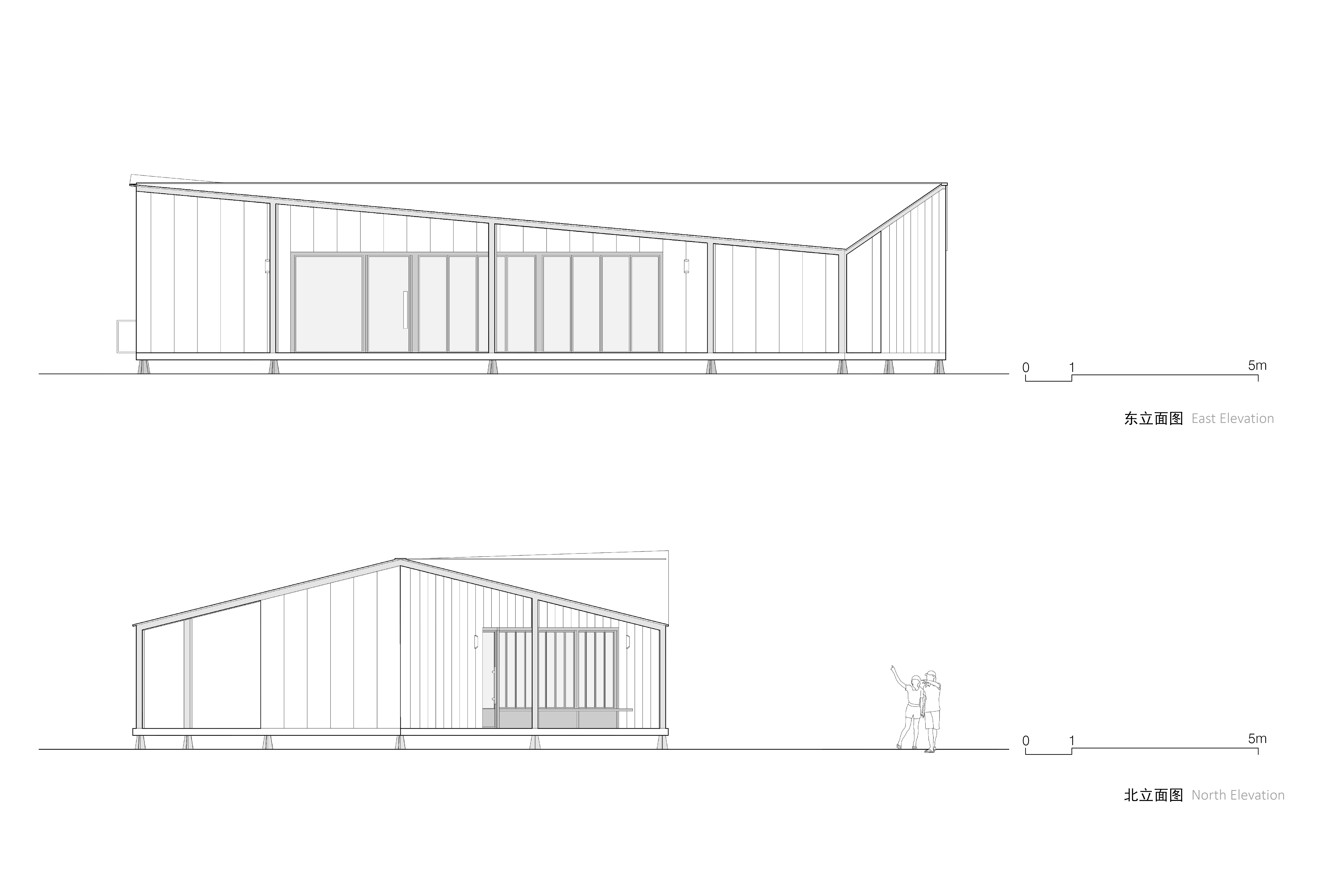 2.被动式节能:选建筑采用点状基础,结合预制钢结构柱脚,将地面整体抬起,与草地形成空腔,防止湿气对建筑的侵扰,亦能最大程度的保护原始草地。屋顶采用双层中空屋面,在确保防水的基础上,更利用保温空腔实现了良好的节能效果。