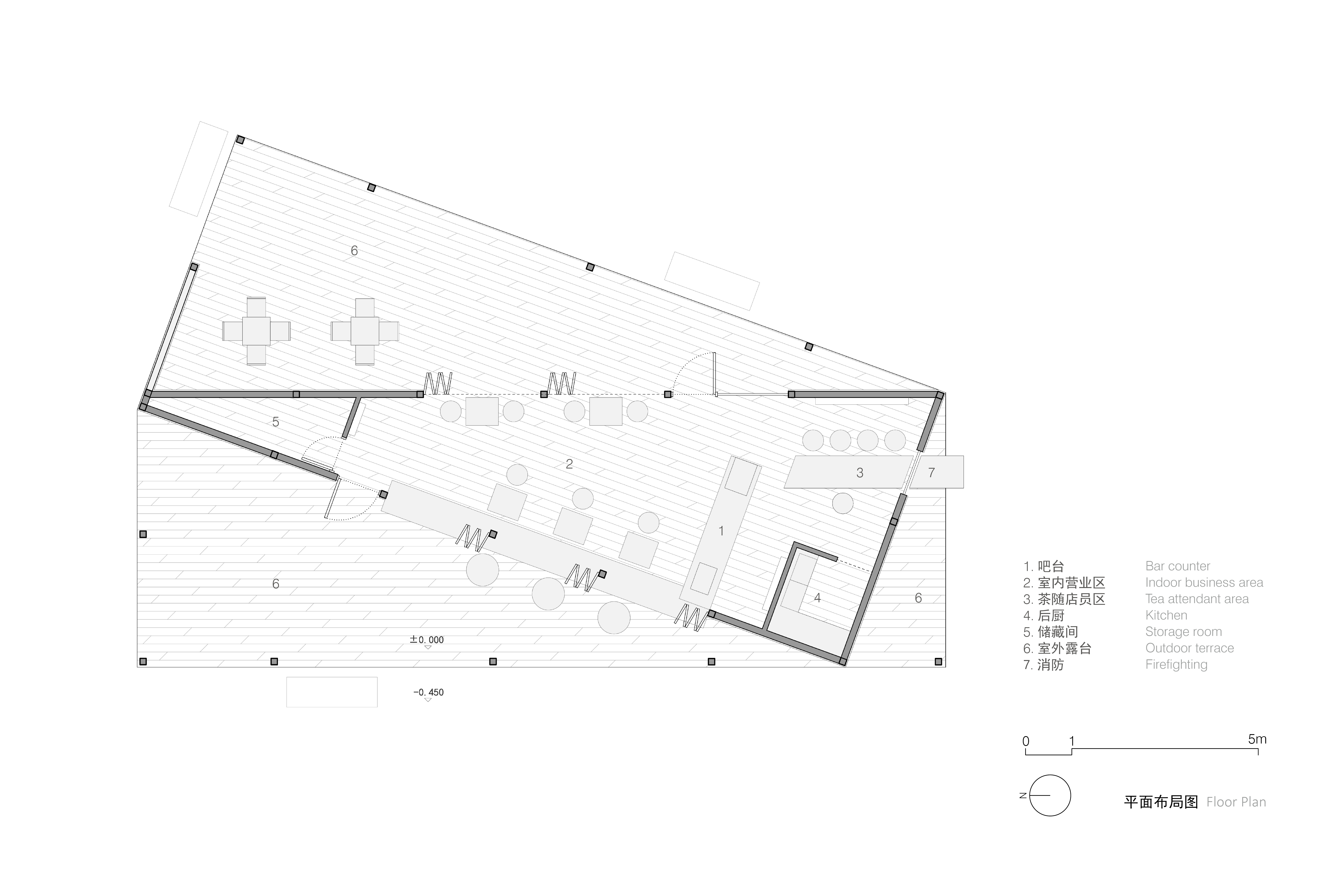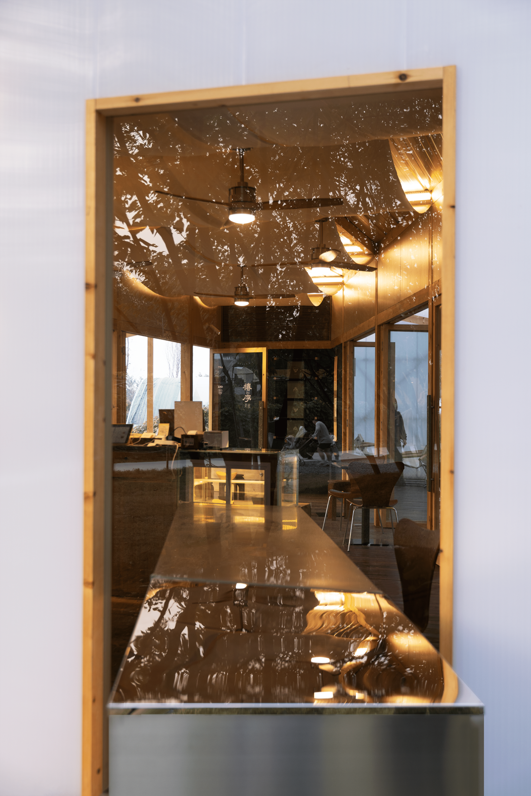 3.吧台侧面的“茶随店员”区域,长向的桌面从室内穿透落地玻璃延伸至室外,室外部分则通过镜面材质将树影与天空反射进室内,传递出“自然无界”的理念。