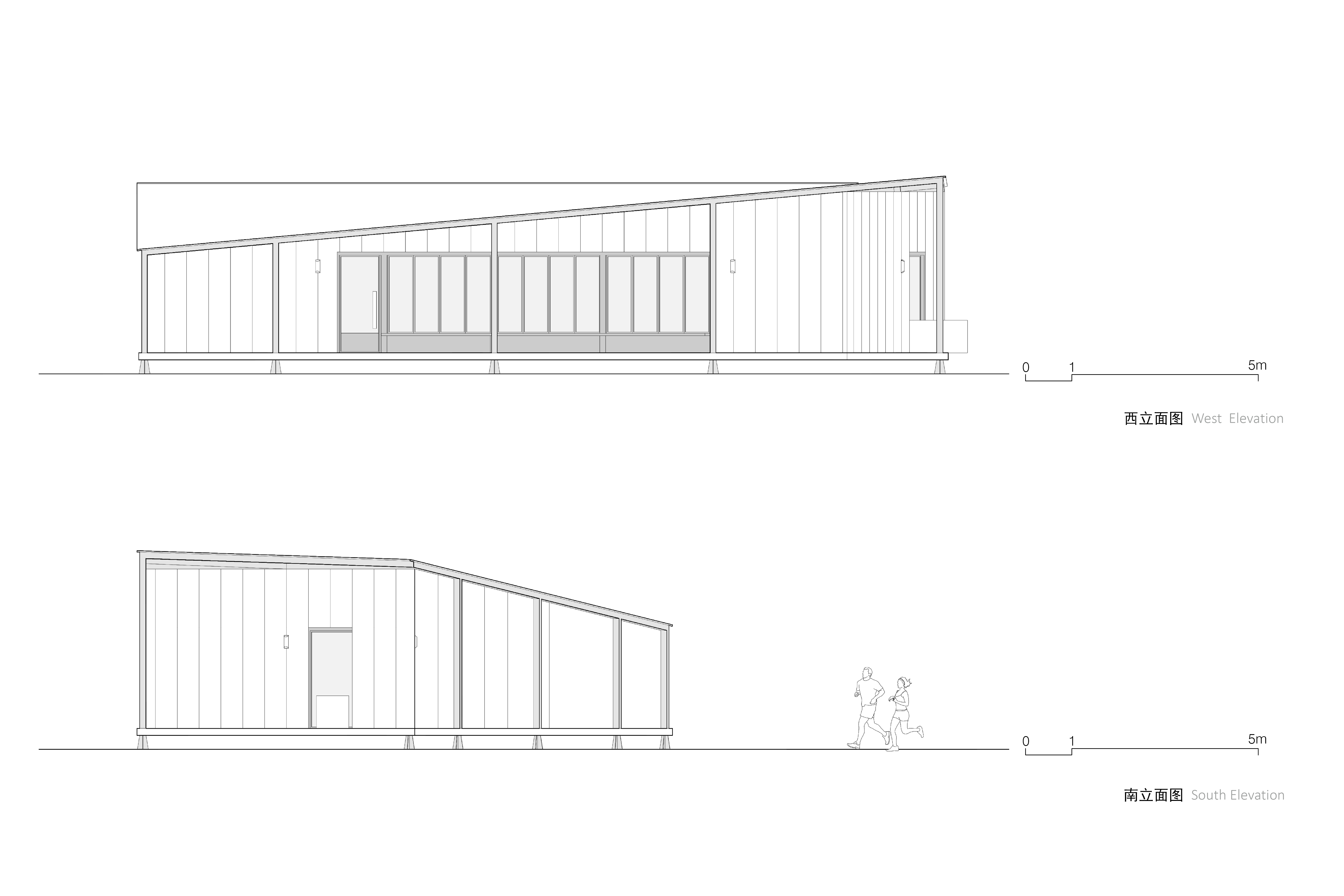 3.建筑形式:特殊的造型逻辑使得建筑物面对不同方向呈现出各不相同的观感,北向呈现类似双坡屋顶的形式,东西向呈现水平长向的简洁造型,南向呈现具有穿插感的体量组合,屋顶更是呈现出形如纸鸢的几何构图。 -