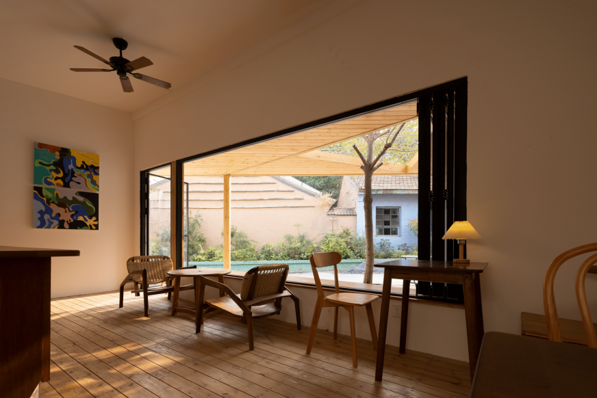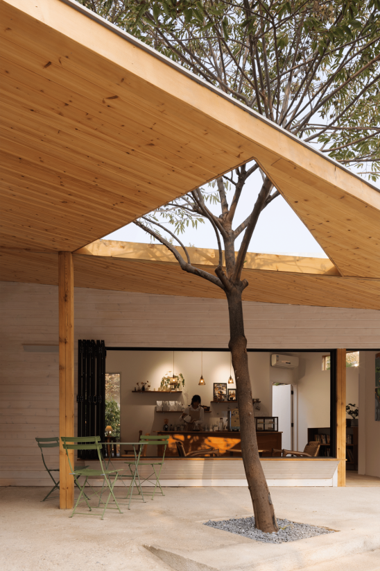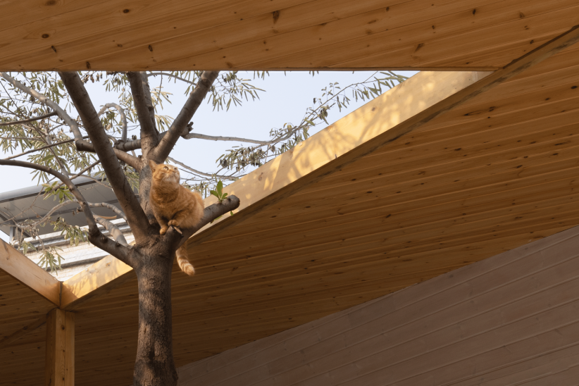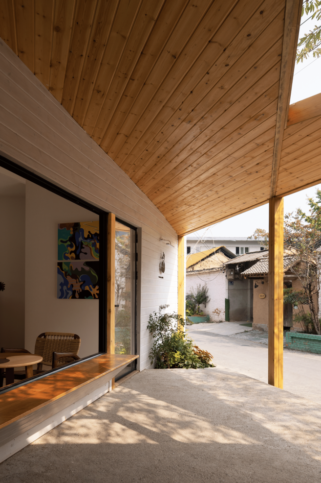 2.店内的门窗洞口高低错落,指向各不相同的景致,随着行走或落座,周围的绿意被吸引进室内。屋檐的树洞更是成为了村里小动物的游乐场。 -
