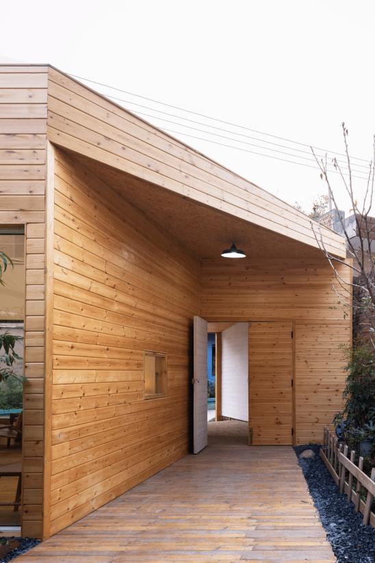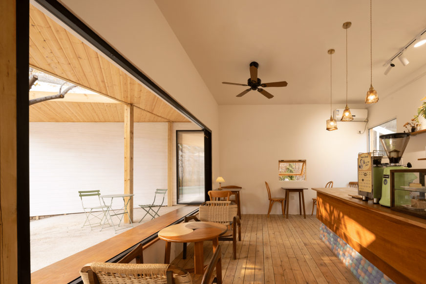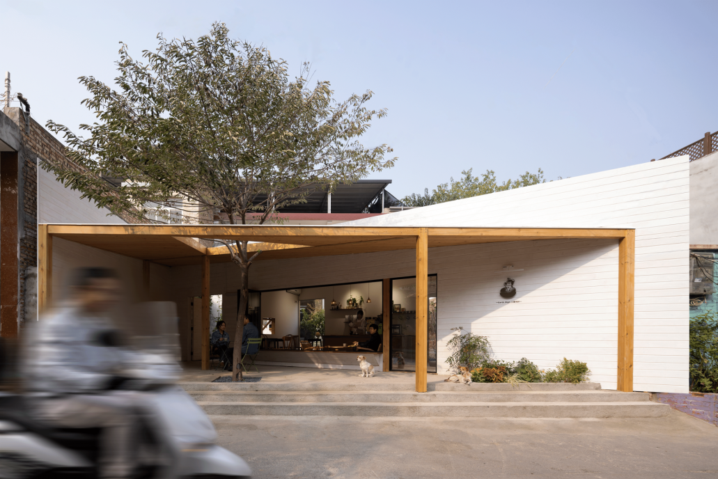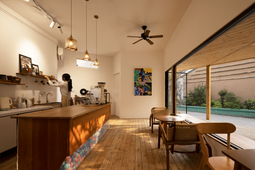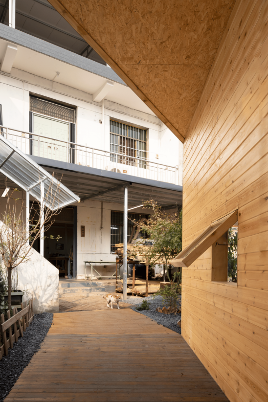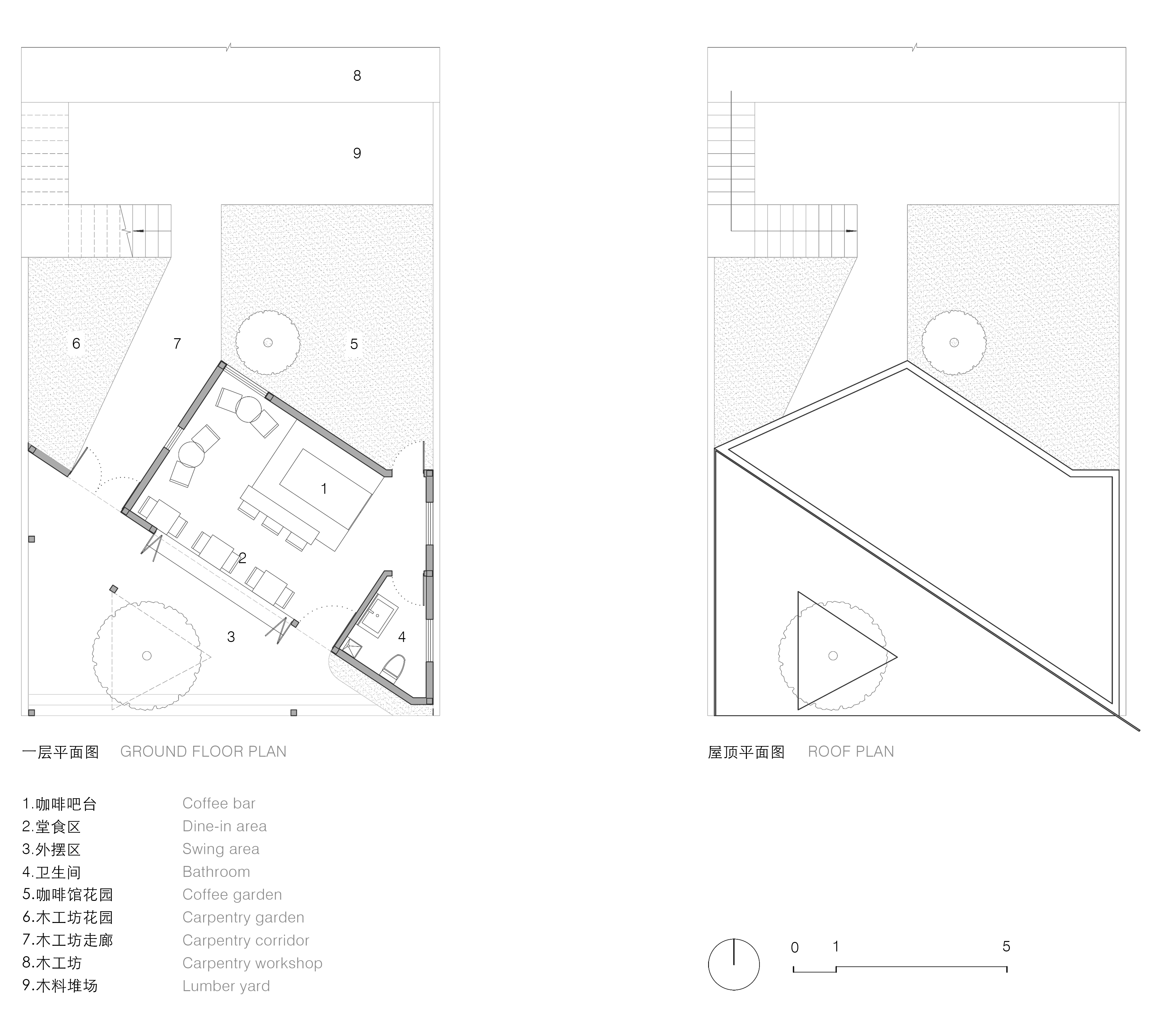 3.内部形成富有层次感的空间,狭窄的夹角布置卫生间,中间是方正的咖啡厅空间,后院的入口布置在外摆区远端,供自家人出入,避免了穿过咖啡厅才能进入后院的尴尬,穿过花园之间的小径,通往南山木工的工坊,并连接起通往二楼的楼梯,这种递进的布局模式,使得院落空间被充分利用,并形成互不干扰的动线。 -
