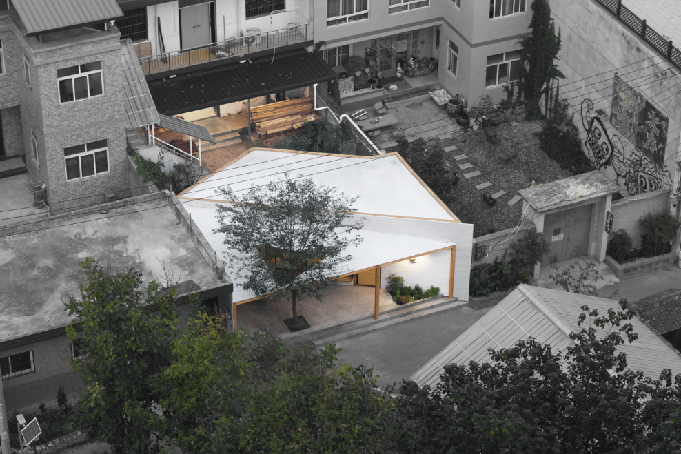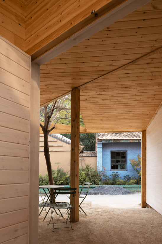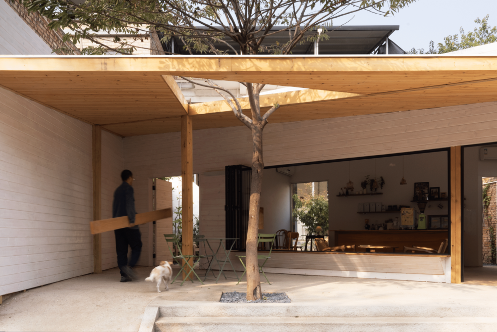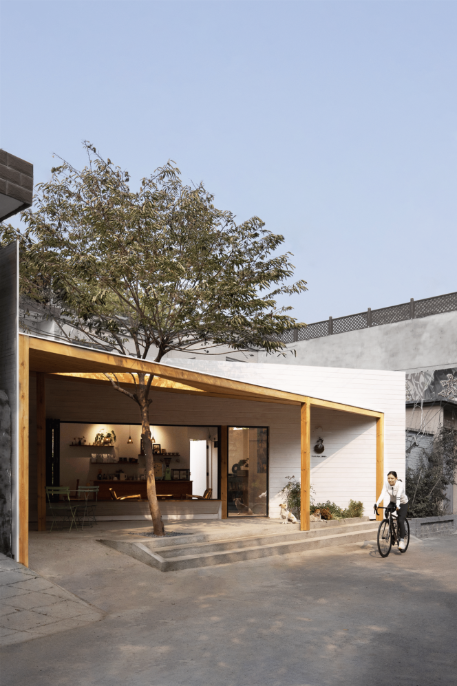 空间布局:1.场地是一个前院后屋的民居院落,后院的二层建筑将作为南山木工的工坊,所以,前院的新建建筑不但要满足咖啡馆的使用需求,还要作为南山木工的入口,有效连接起后院空间并将庭院重新分配给两个业态,形成一种类似“后工作室”的模式。