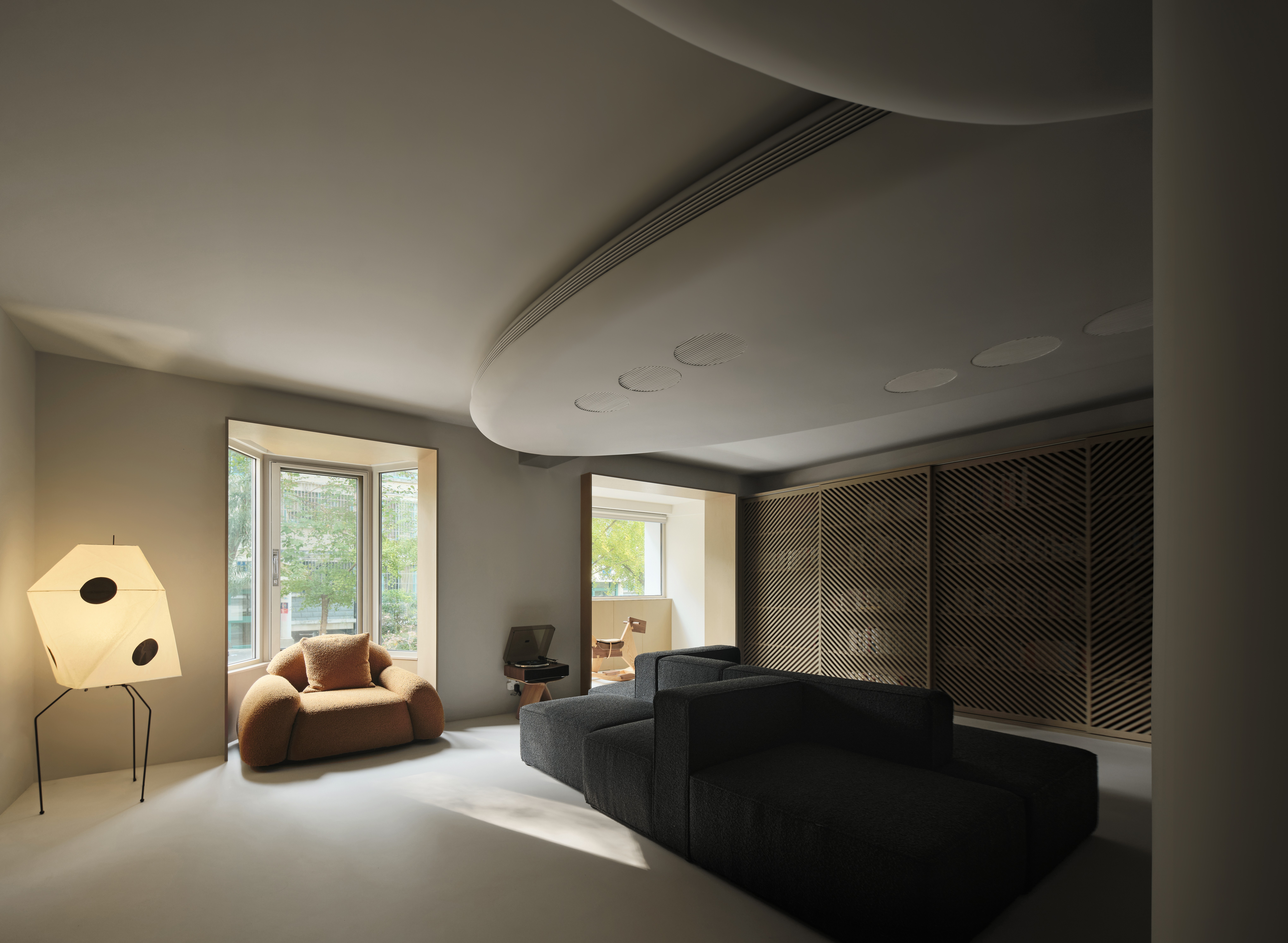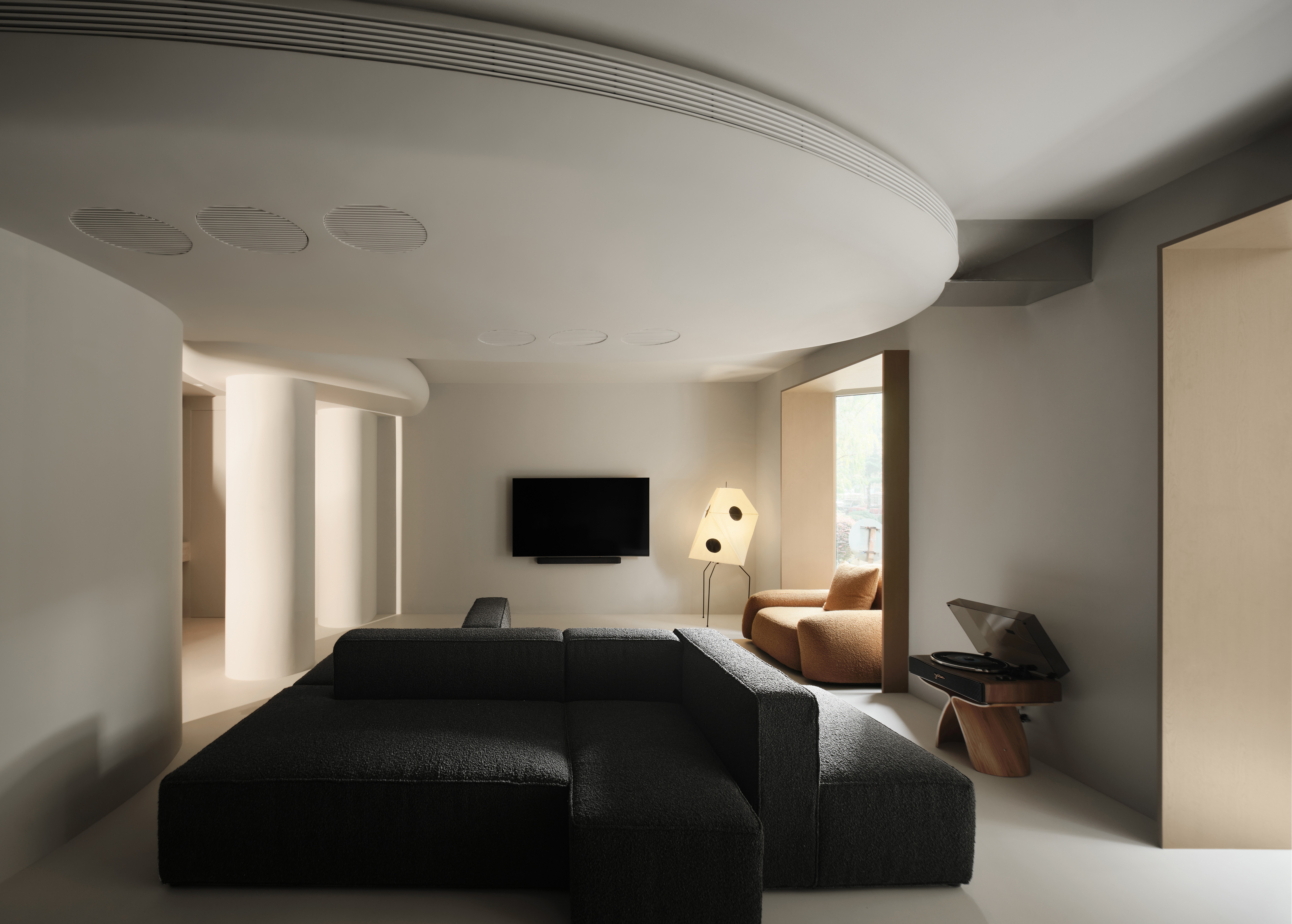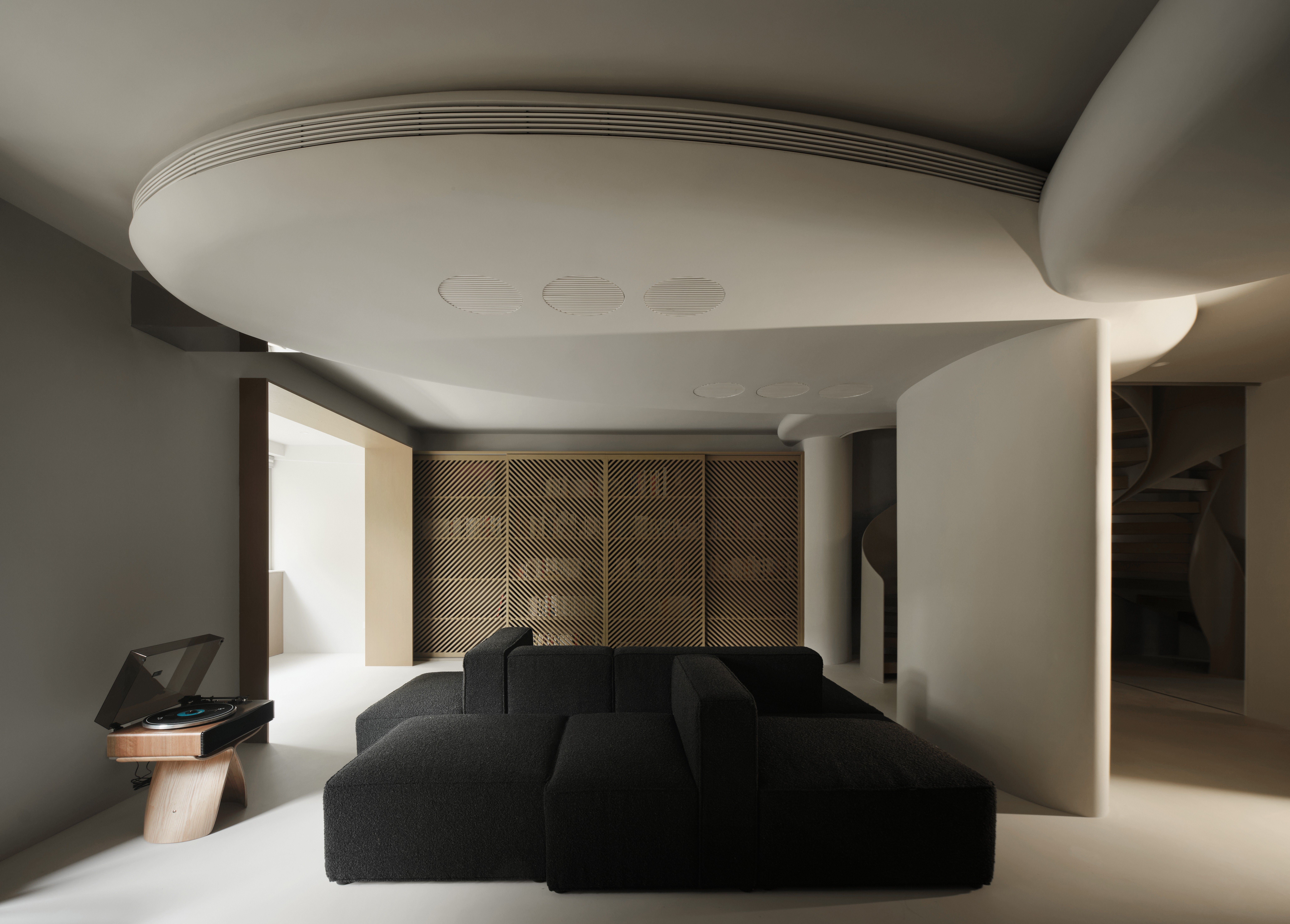 最后再把组合式沙发放在花瓣下方,沙发为吊顶划分了边界,尽管层高低,坐在沙发上也感受不到顶面带来的压抑感,一旦起身行走,又离开了顶面花瓣的范围。空间里其他的设备、管道、梁也都如法炮制,形成了整个空间的天花方案。 -