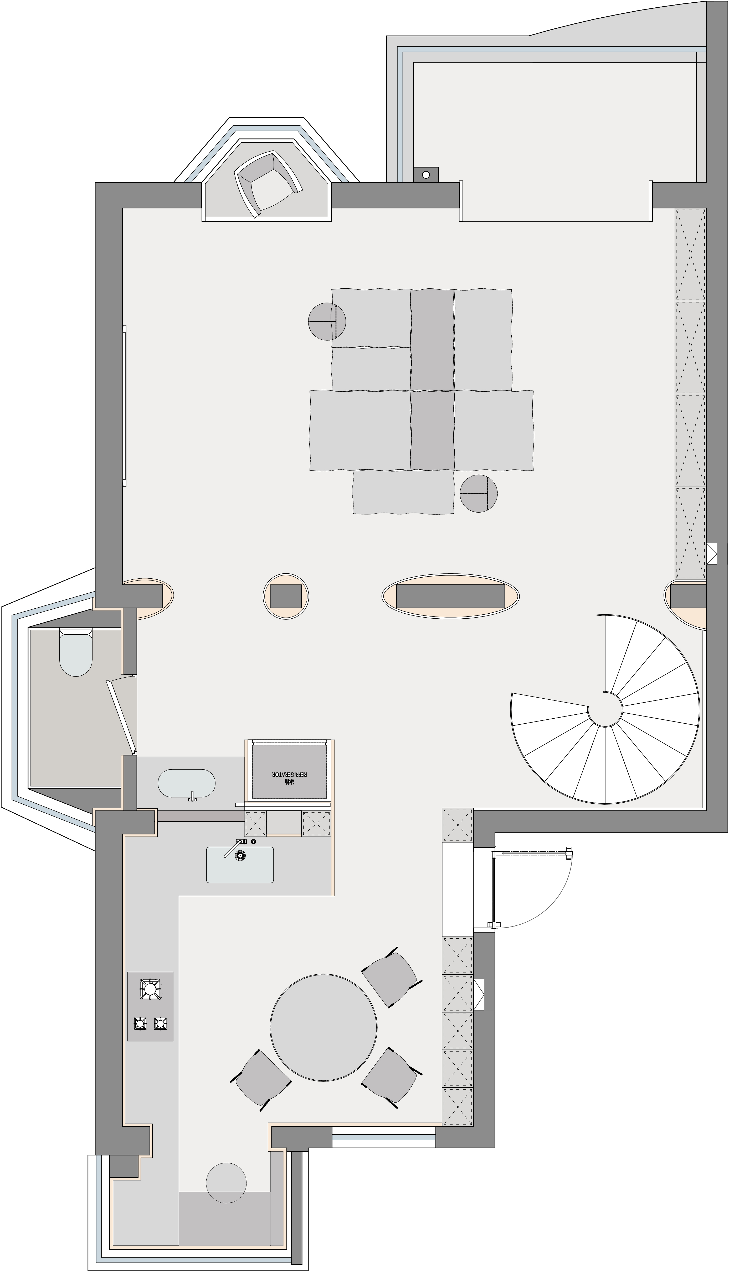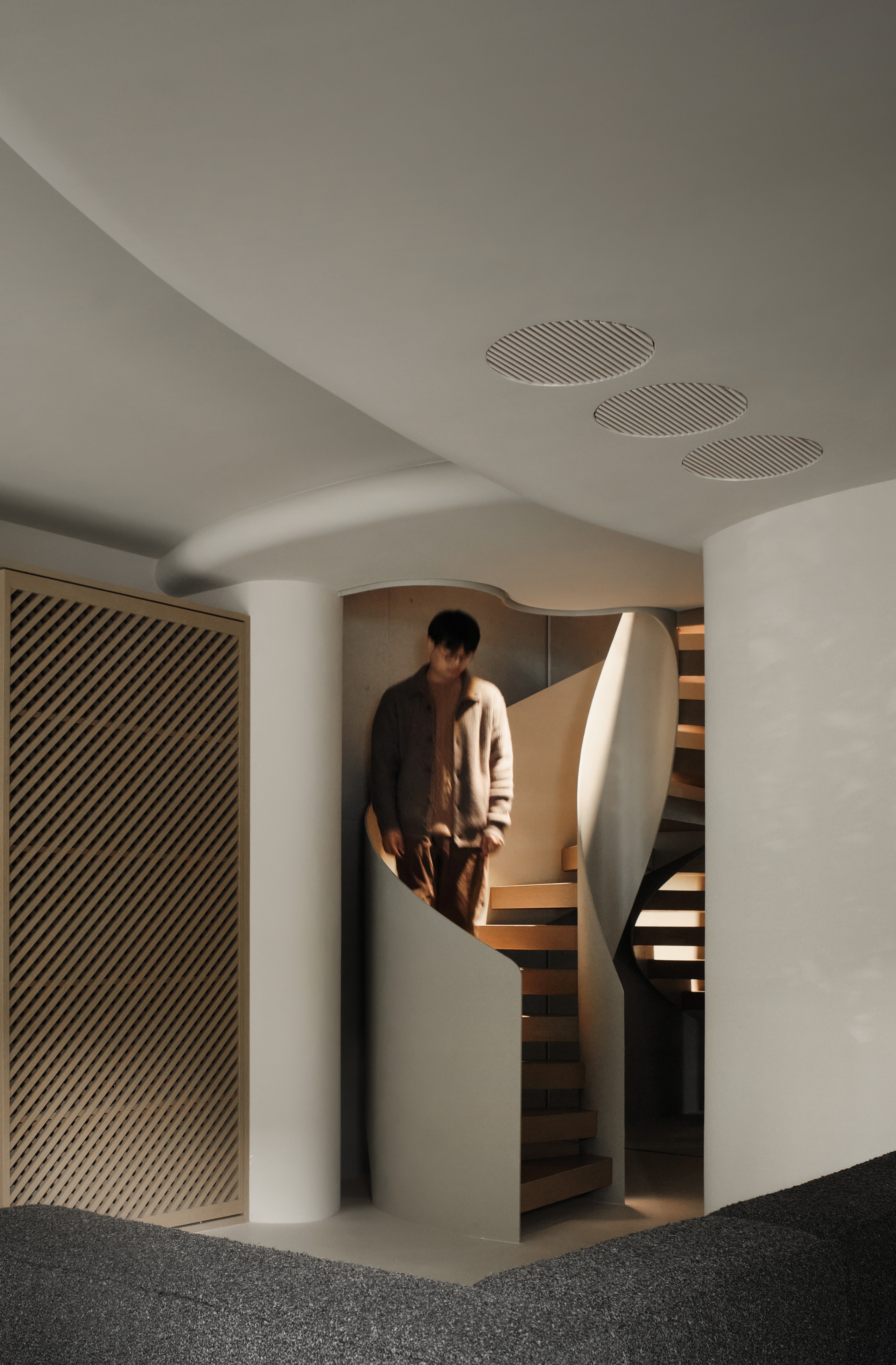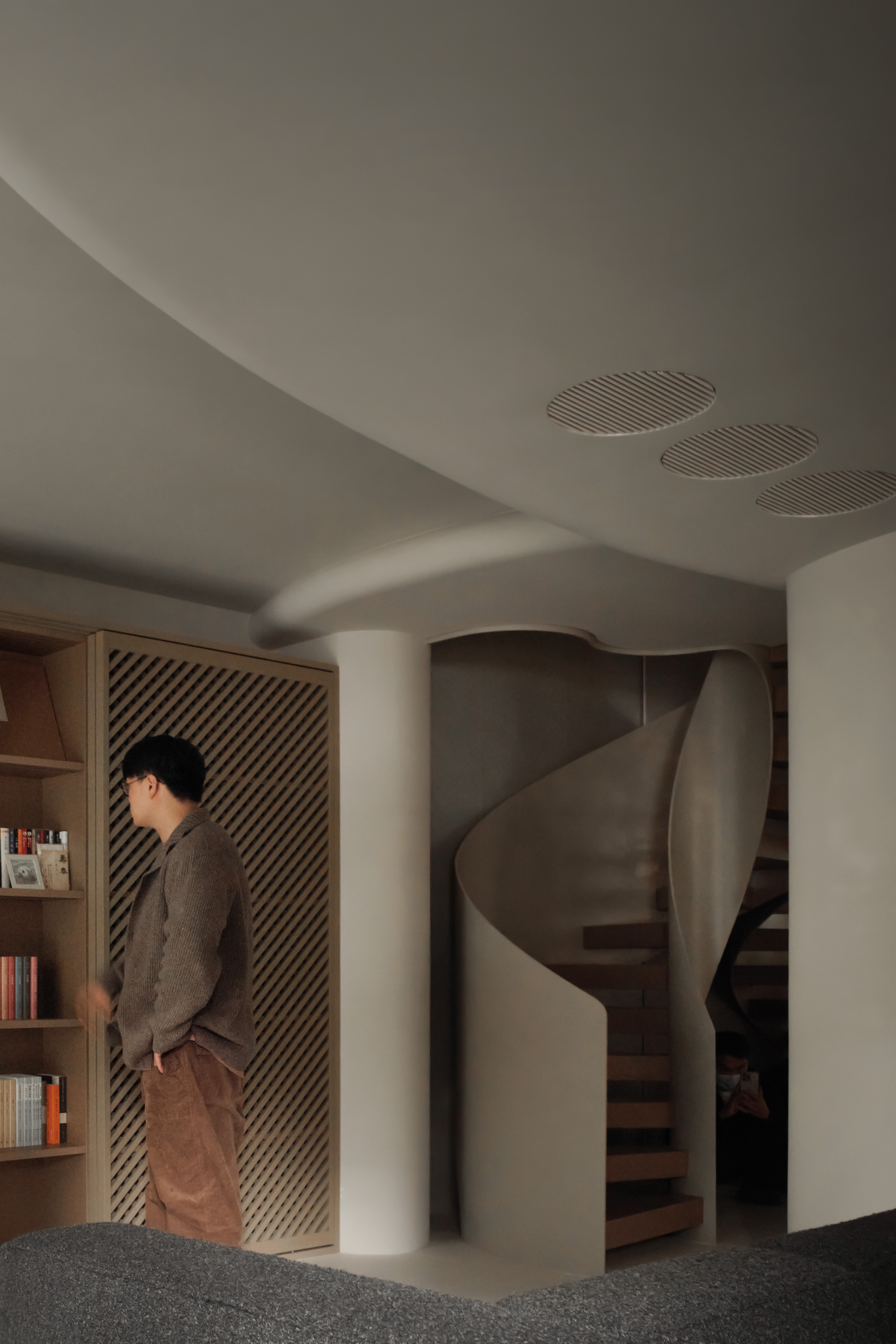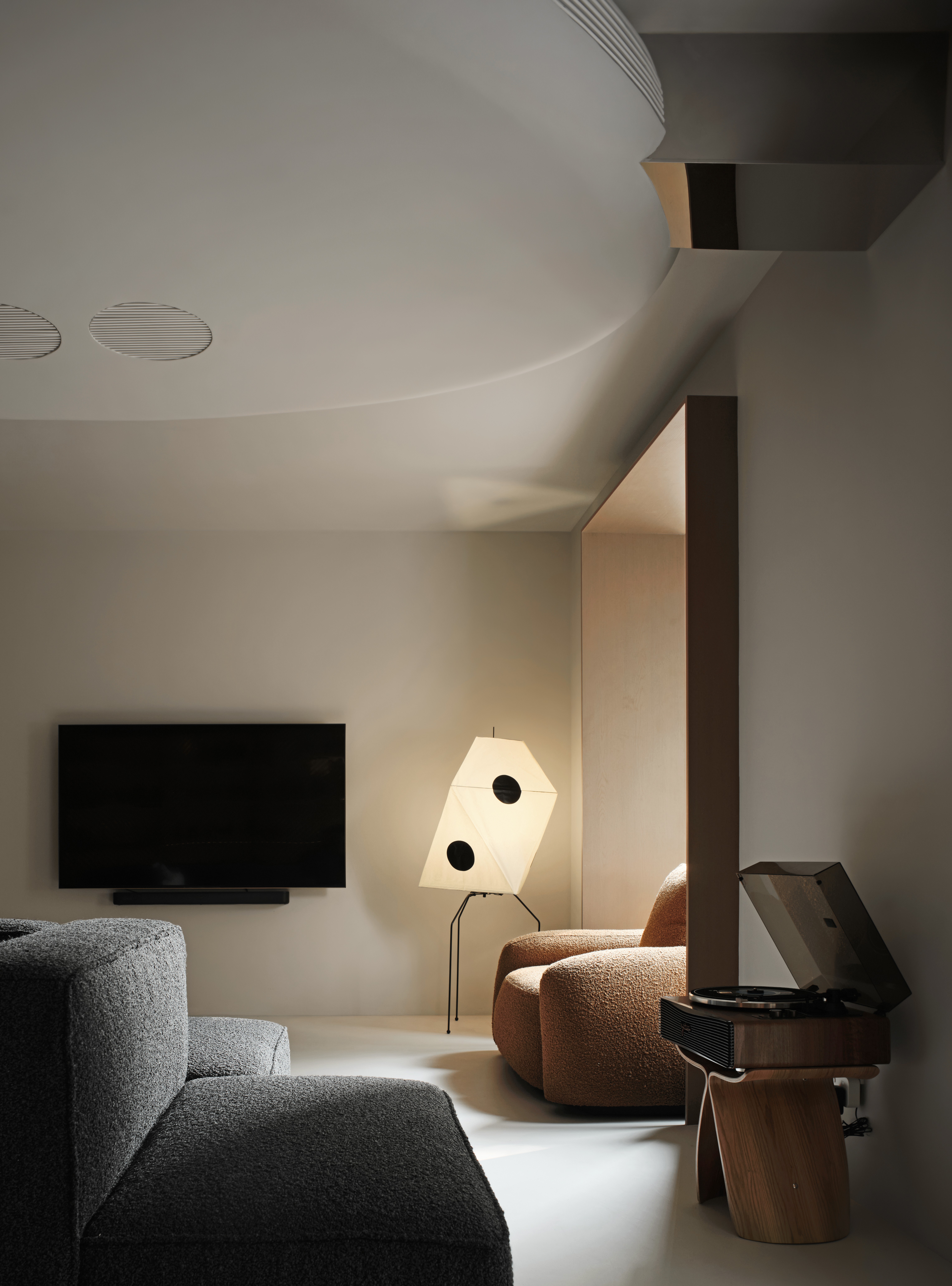 最后再把组合式沙发放在花瓣下方,沙发为吊顶划分了边界,尽管层高低,坐在沙发上也感受不到顶面带来的压抑感,一旦起身行走,又离开了顶面花瓣的范围。空间里其他的设备、管道、梁也都如法炮制,形成了整个空间的天花方案。 -