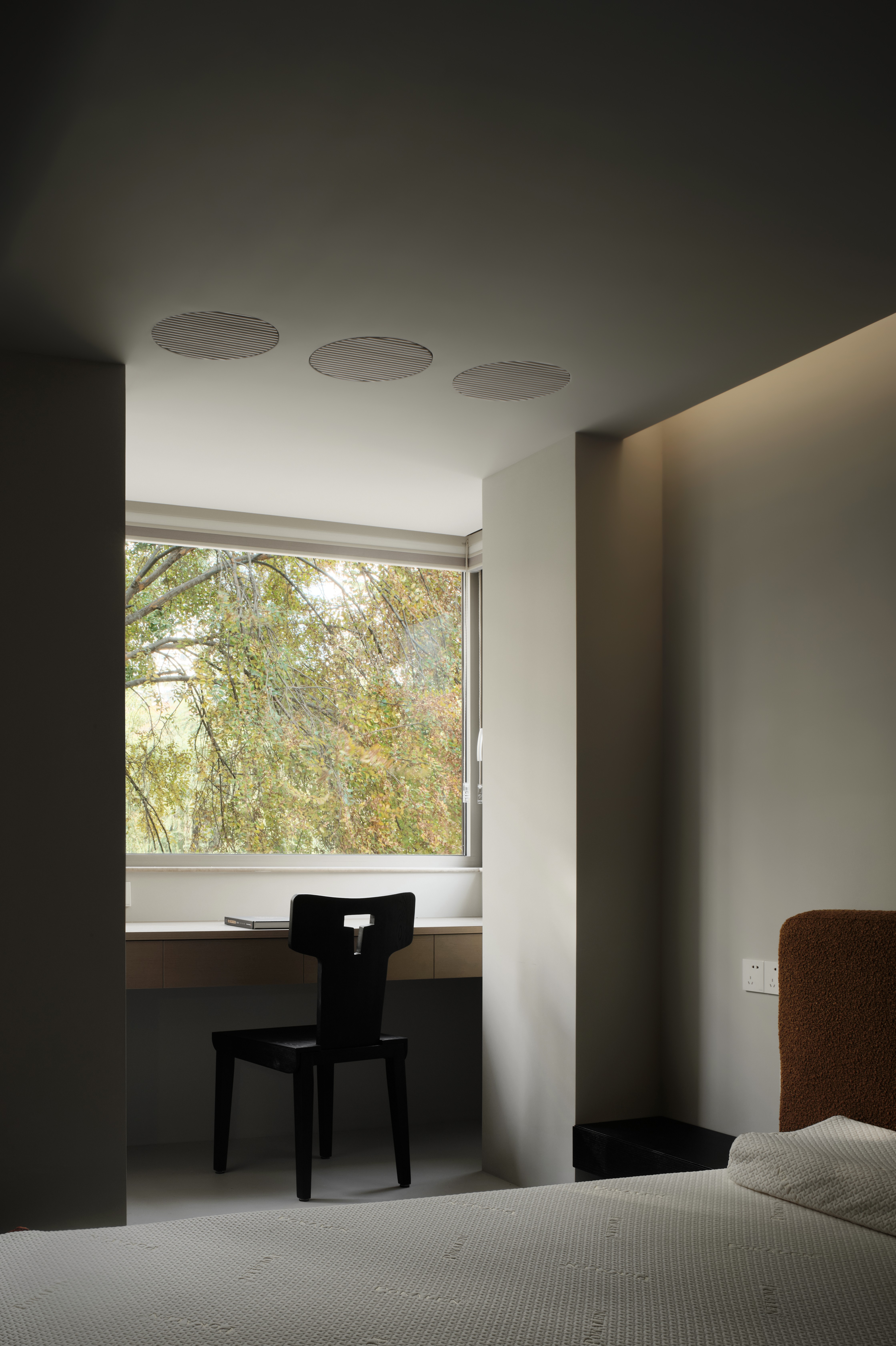 我们结合客厅中间的梁,把两台空调内机放置在靠着梁的两侧,一边一个,空调管道顺着梁走绕到室外。这样梁、空调、管道都集中在了整个客厅的中间,然后再用一个花瓣样的椭圆造型把他们包裹起来,几个问题集中处理,这就是最少的动作解决最多的问题。