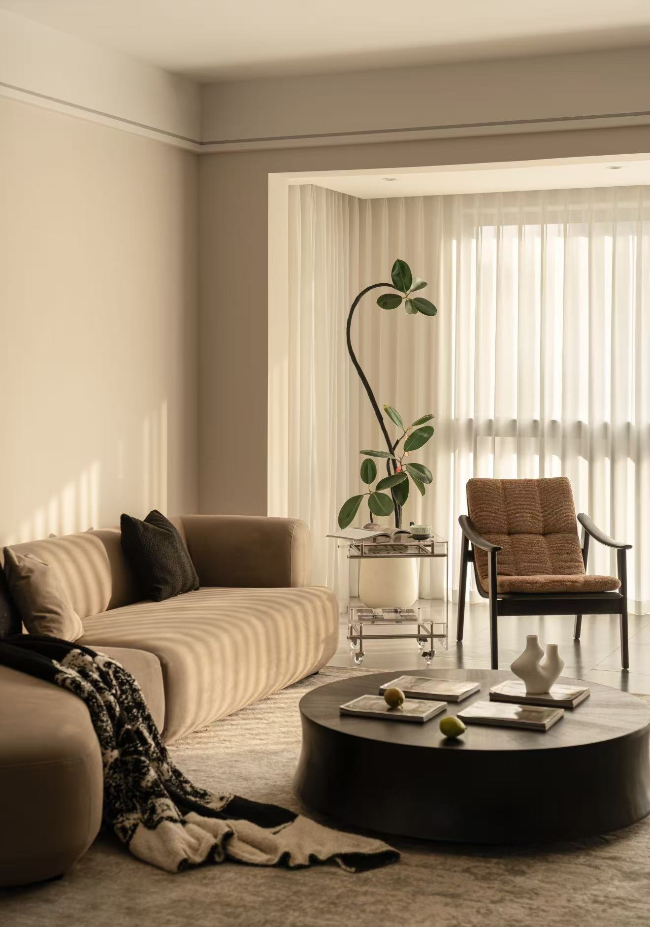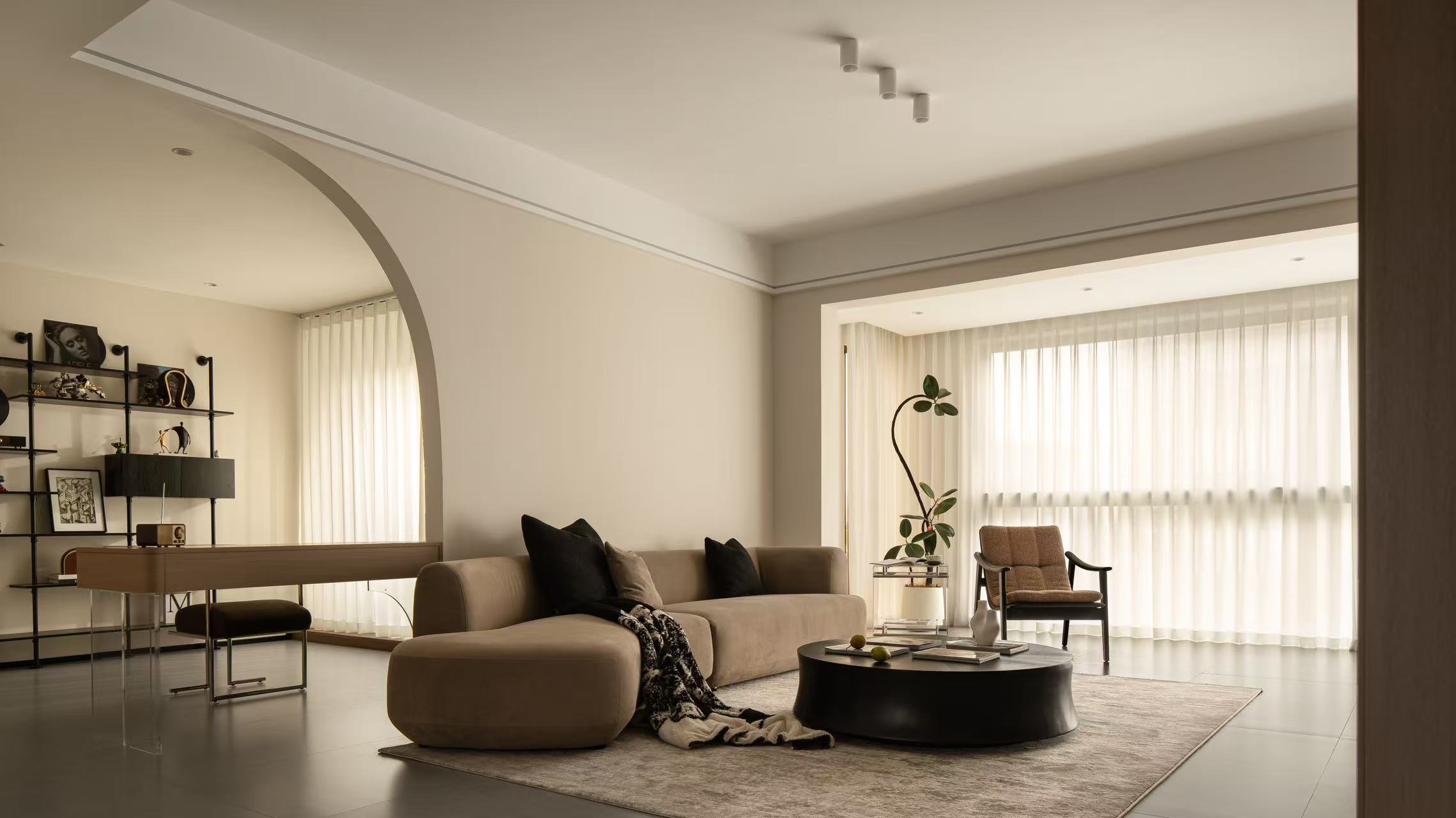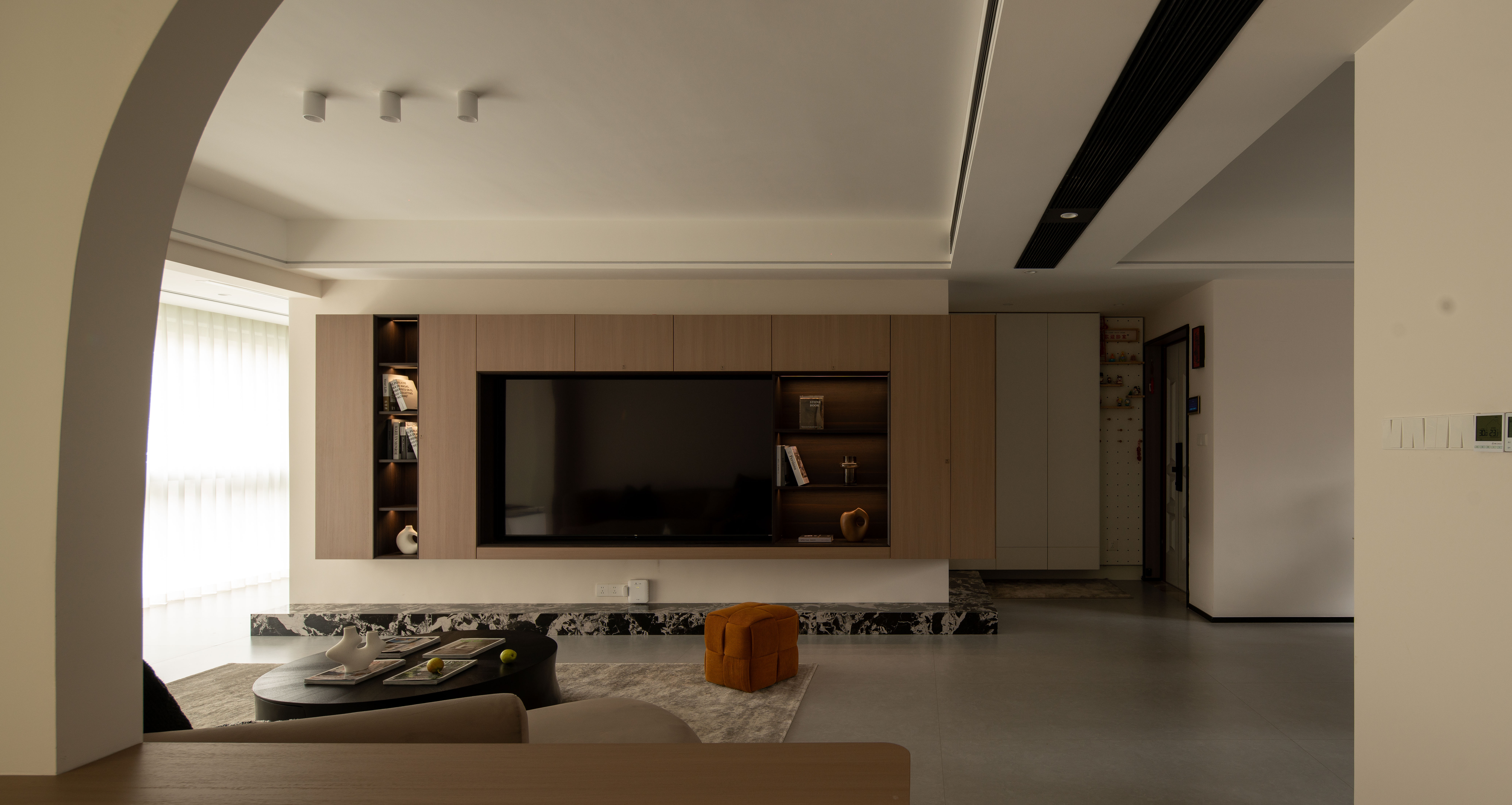 设计选材:因为预算问题,我们在选材上就使用的最平常的乳胶漆、岩板、木饰面。 运用简单的弧形设计,搭配原木色柜子和布艺沙发。局部用岩板营造亮点及收口。让整个空间自然的融入其中。回归家庭的温暖。
