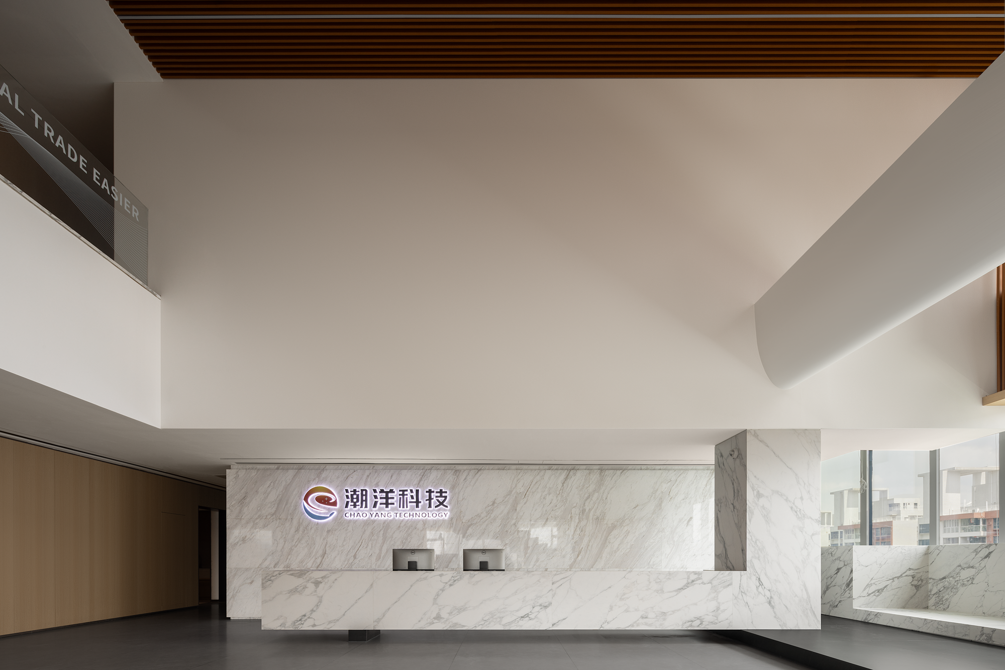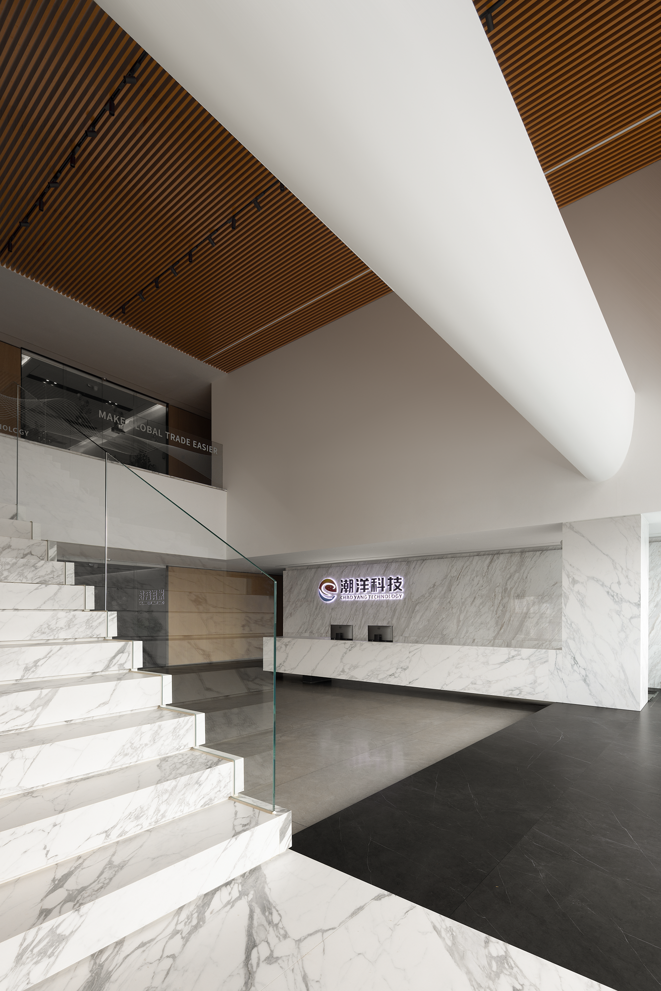 项目定位:潮洋科技主要板块业务是出海的跨境电商,结合公司性质,怎么体现作为亚马逊头部功能性服饰内衣品牌的实力和出海的特性,原本是独立两层写字楼,设计师对空间做了一个大动作的调整切部门楼板,前台和柱子的咬合如海上前行的轮船和向着巨浪光明的跌梯中空油然而生,让原有独立的两层有一个很好的使用和交付衔接,将空间的维度做了一个上下两层的递进延伸,塑造出一个松弛、开放又独立的秩序空间。