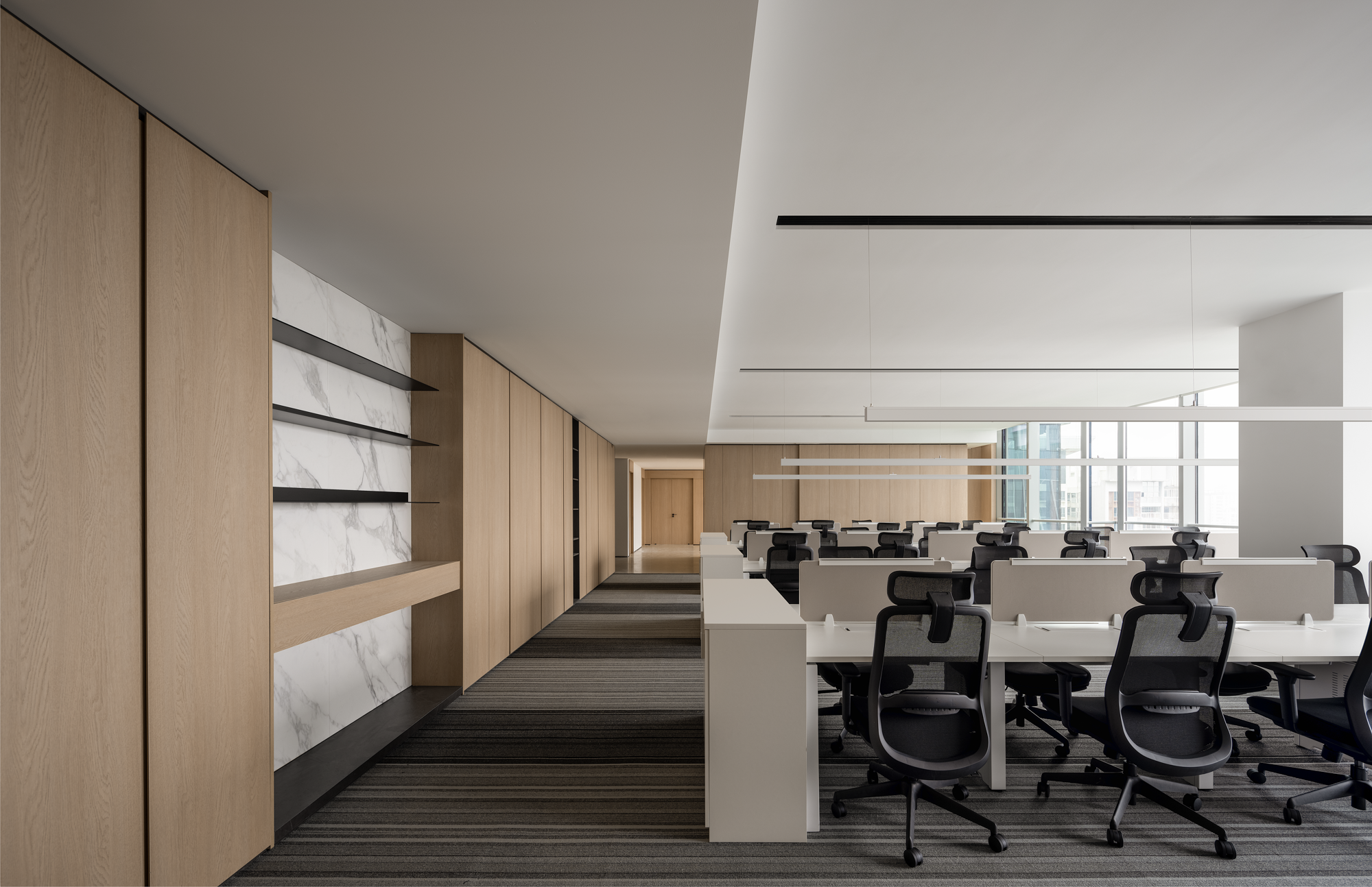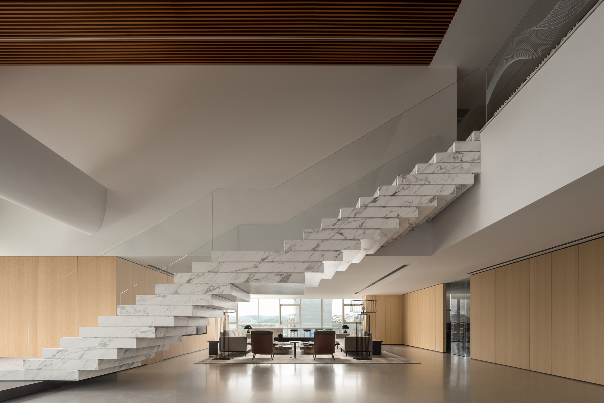 设计选材:作为公司内部连通11楼和12楼的效率通道,白色岩板楼梯被视为空间中的巨型雕塑,象征着"出海’稳健前进的信念、无穷的力量与灵感,鼓励着两个独立部分之间的互动,木饰面和条纹地毯大面积贯穿,把原本分区的部门形成一个协同合作拉力。利用统一的设计语言整合立面与天花之间的关系,简化外在结构的同时也为空间带来近乎方正的形式感。同时结合办公家具的组合,让整体空间关系获得统一与平衡。情景交融、趣味性、艺术性的种种可能,营造出人性化的未来办公模式。