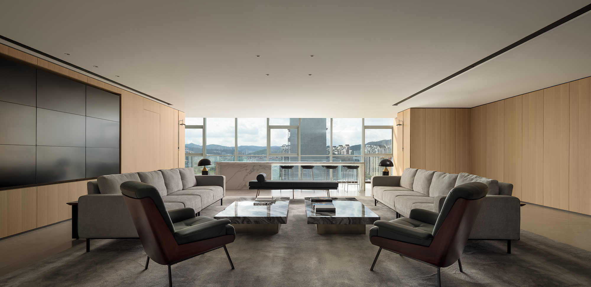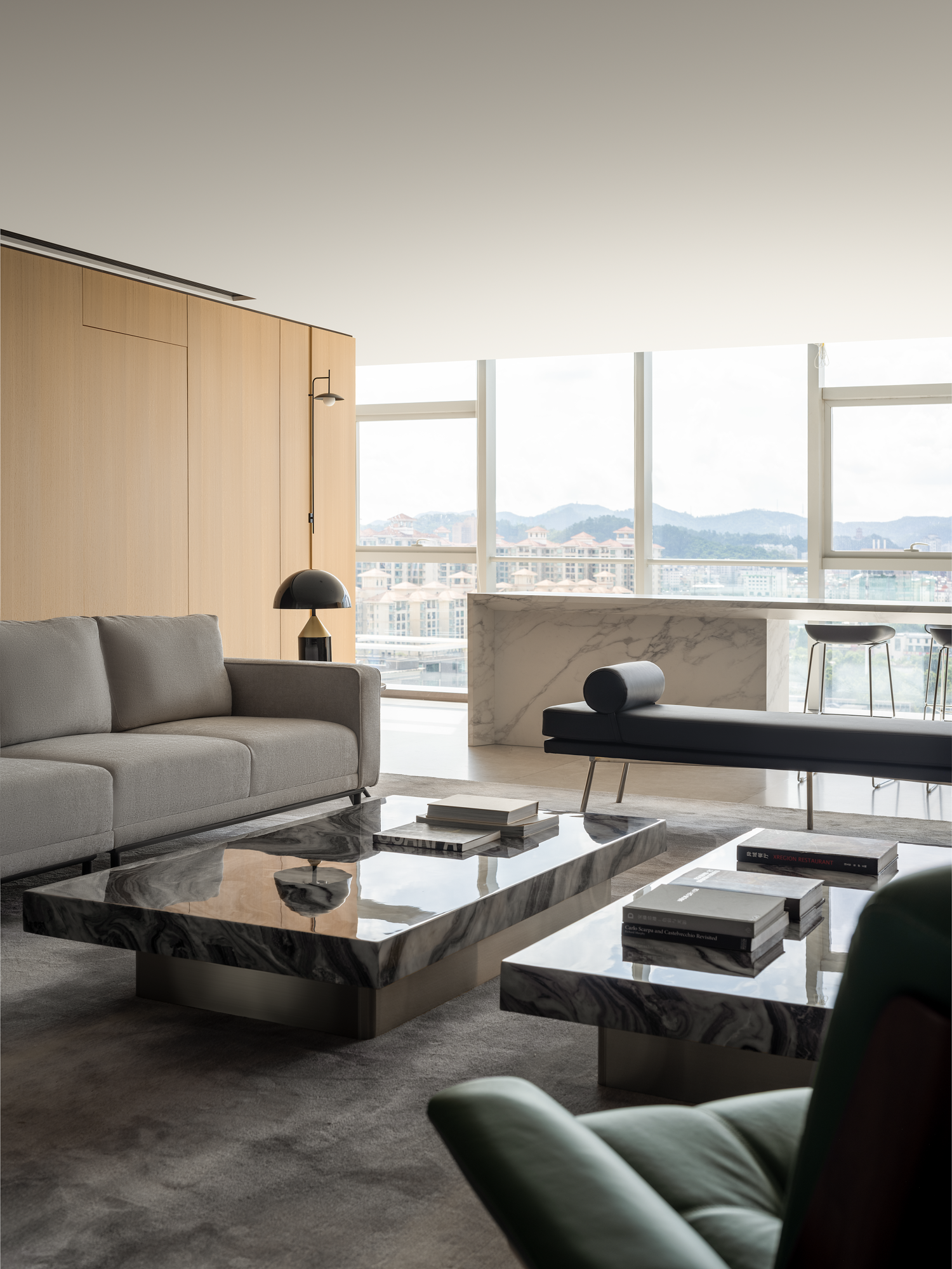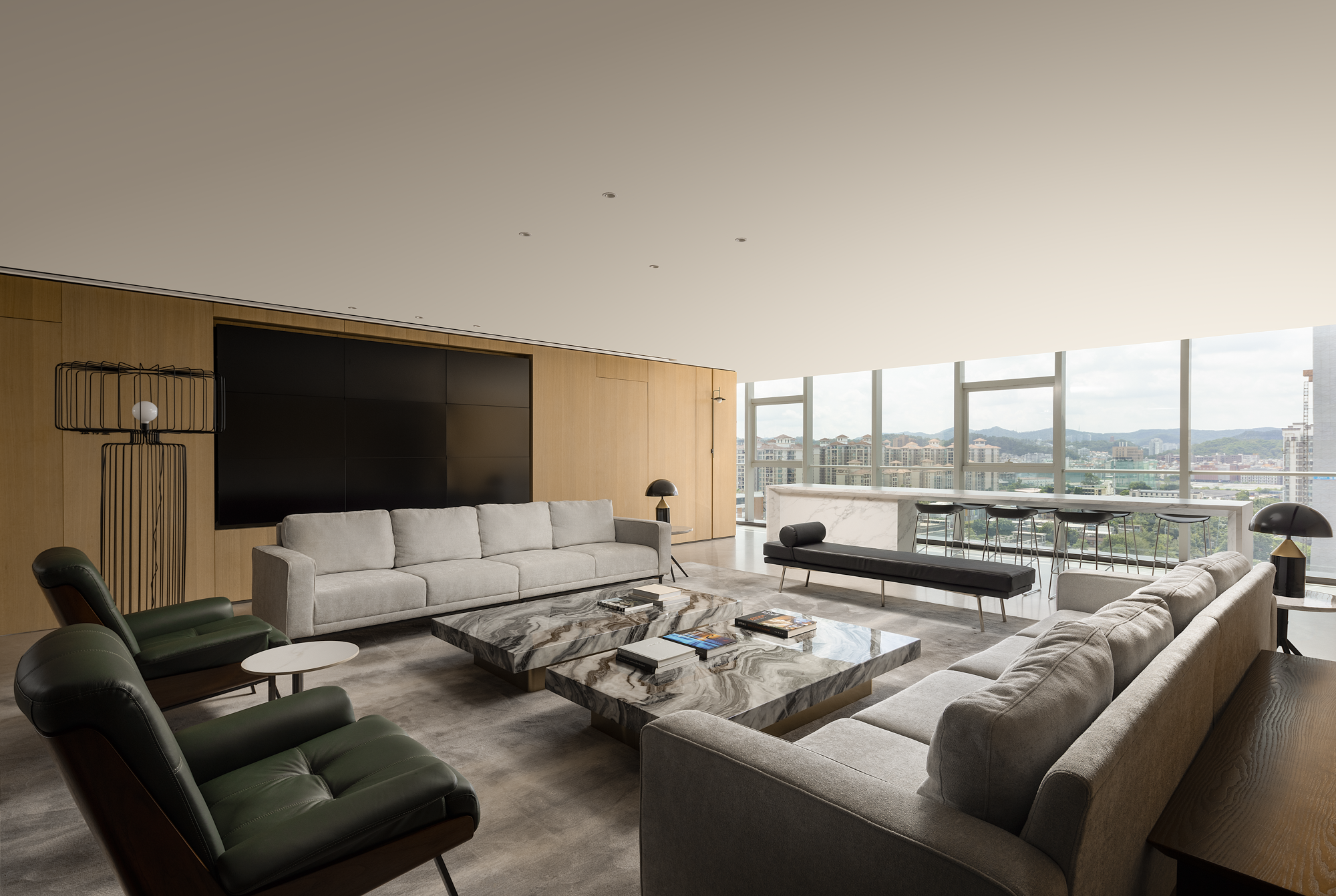 对称的体块符号,对坐的小型接待室也能欣赏到远处的山景,严谨又放松。