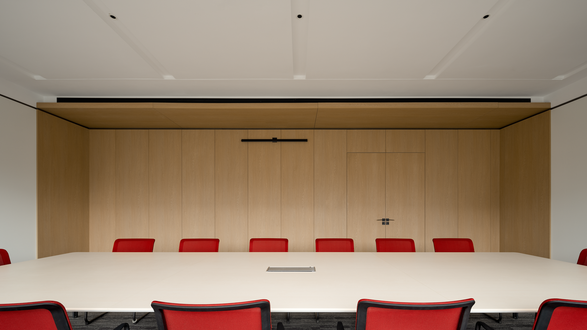 方正的小会议室,表达了一个严密、高效的办公场景。那一抹红跳跃如空间之上,与底色形成较大的对话关系,让空间更有活跃灵动性。