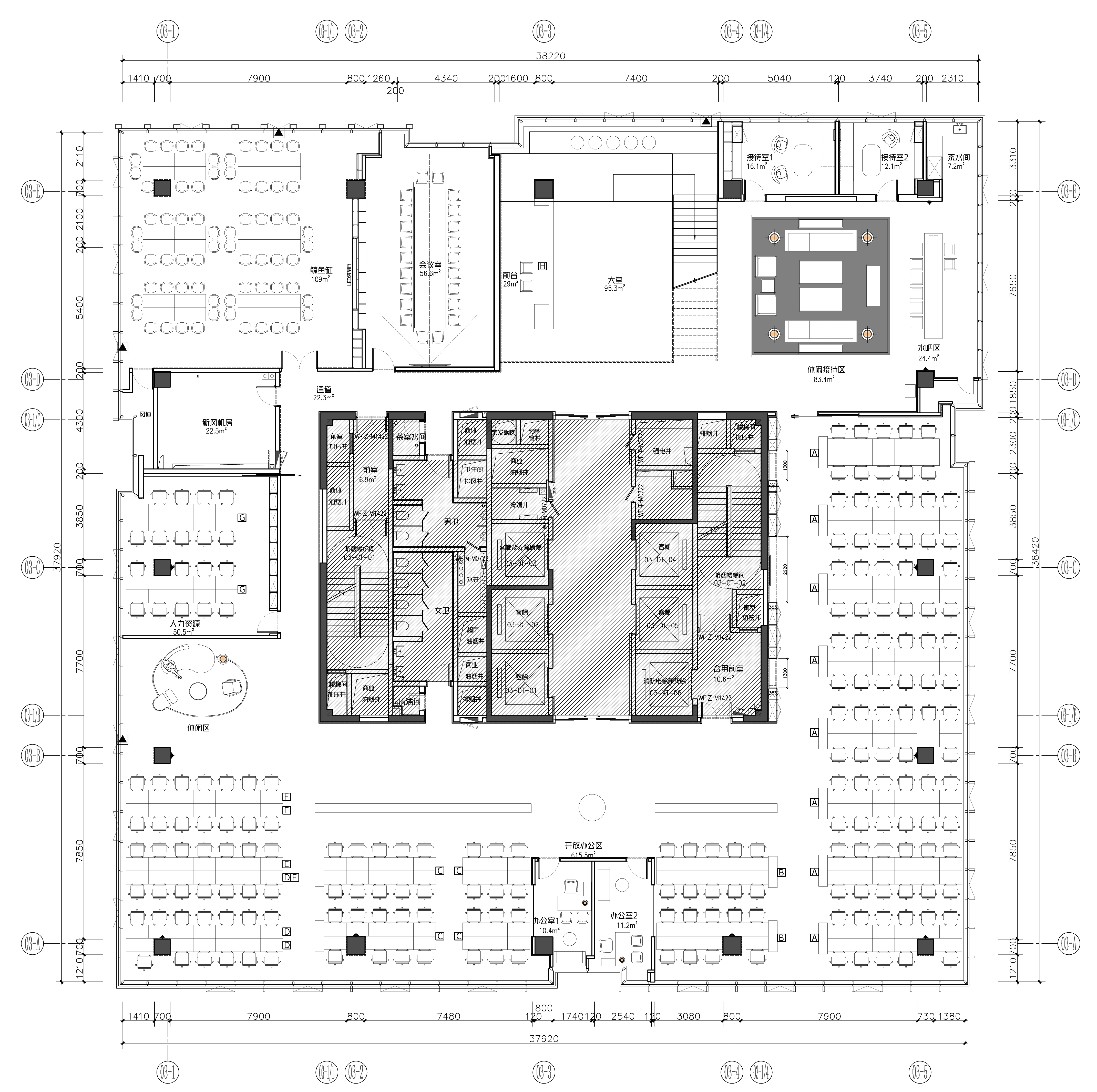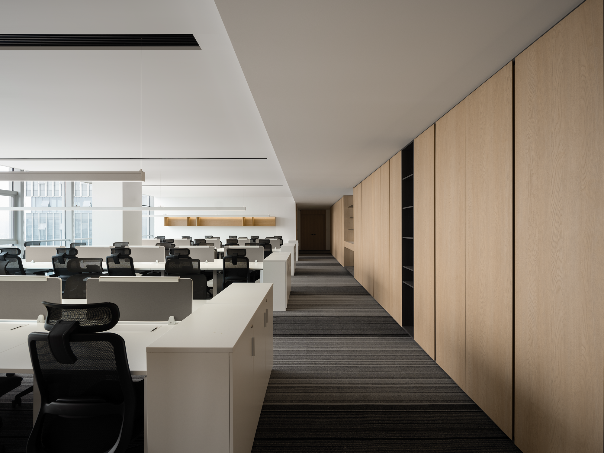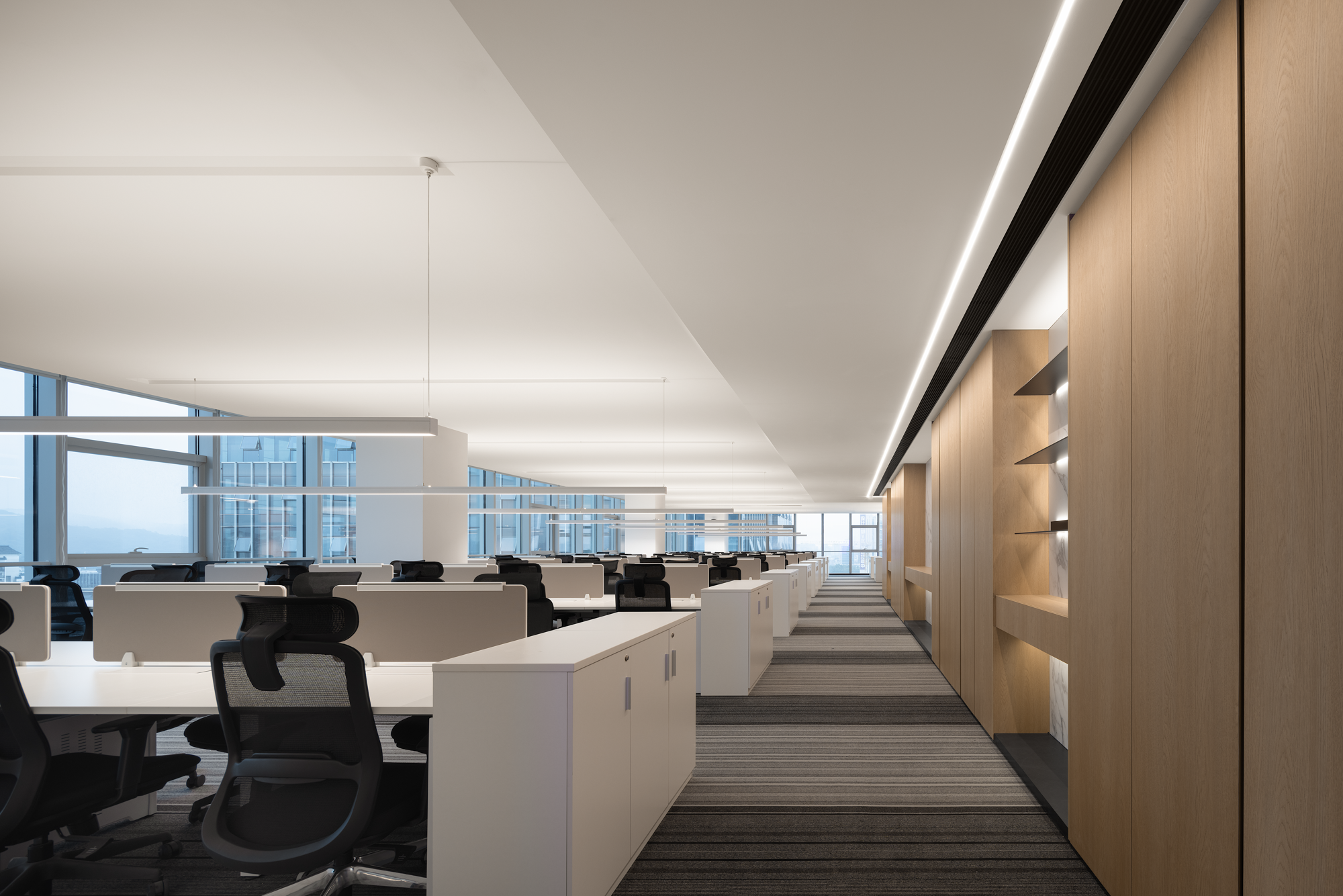 开敞式的办公通过天花结构进行功能分区,大面积条纹地毯的通铺让空间独立又整体。