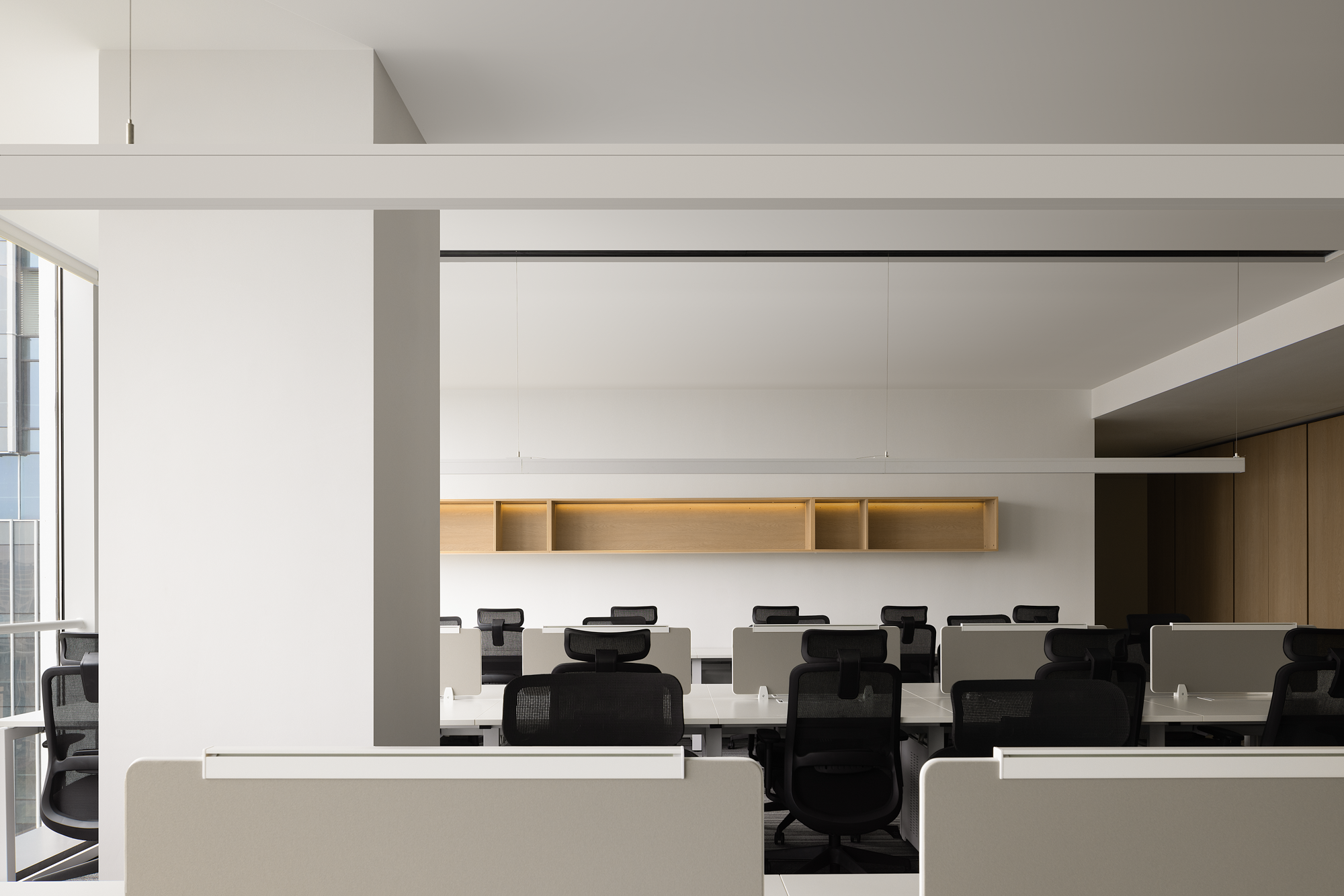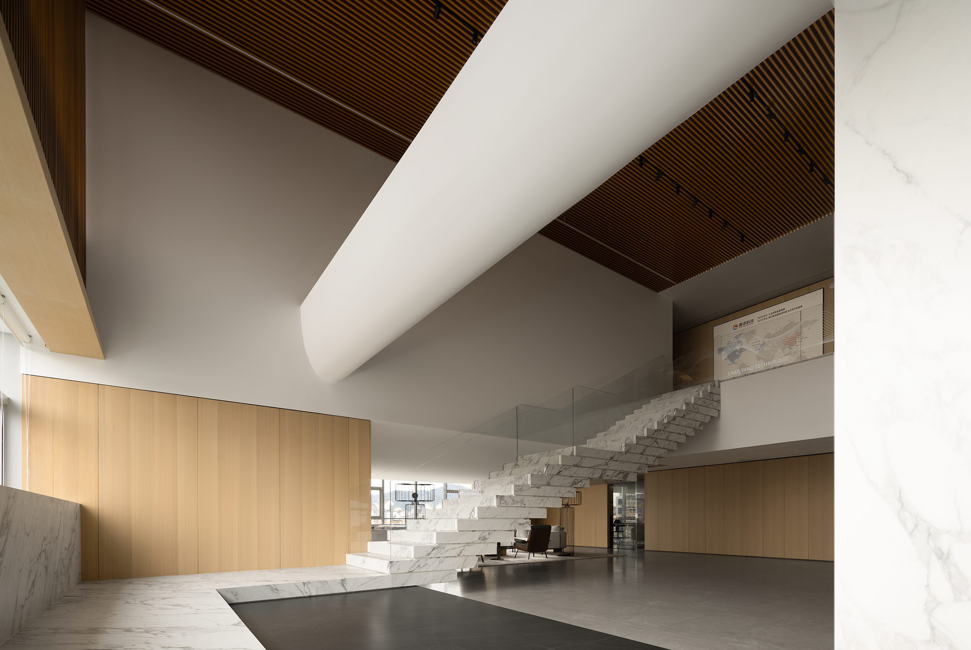 空间意境:本设计强调以“体块盒子链接”为核心,展现企业的使命、愿景和价值观。室内打破传统封闭式的功能分区规则,将整个空间划分成三个主体区域—前厅接待区、会议展示区、办公区。每个区域在保有自己特定功能属性的同时,又与其他区域产生功能场域的交互。一楼接待大厅同时拥有空间的体块感与建筑结构感,从空间整体出发,设计强调几何体块的相互咬合与精致的选材,以释放空间上下尺度和左右张力,催生“L”型转折线条、体块和光影之间的巧妙结合,两个L形体塑造出横向“光明窗口”的视觉指引,引导并梳理着行人轨迹。在某种意义上,我们希望从生活里提取一种公共情感、秩序和理性,它不是所谓的“压榨式的办公环境”,它应该有情感、有思想、有停留、有娱乐、有休闲,进入空间时就传递给每一个人,把最好远山景色的留给自己。