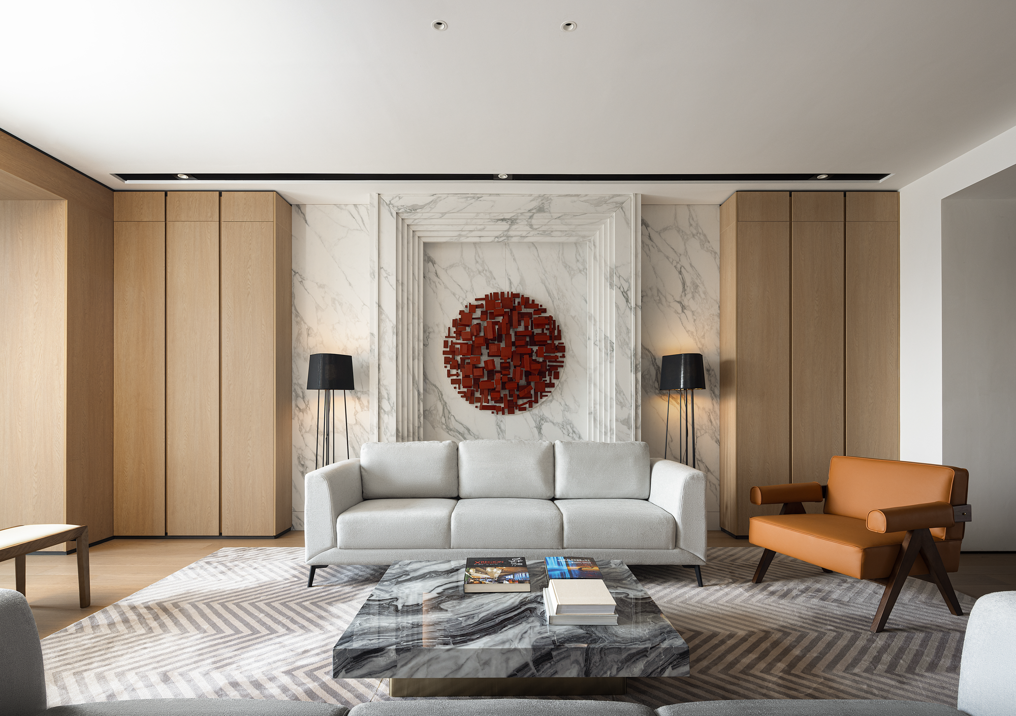 白色大理石盒子体块的转折,上下灯带的强化让它更有立体感和视觉指引。