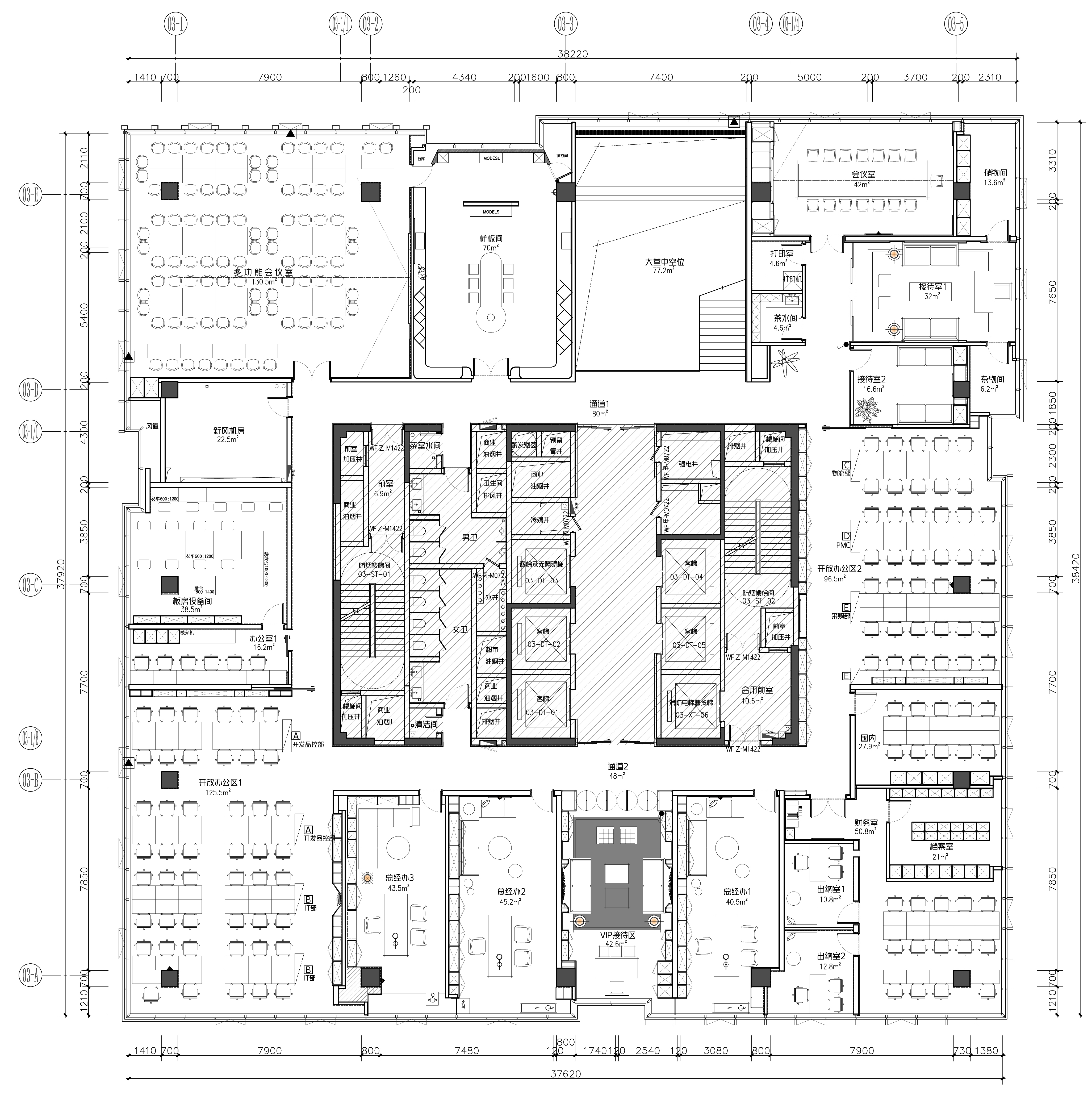 二层主要为总经办、私密办公区及配套的展厅和接待会议室。