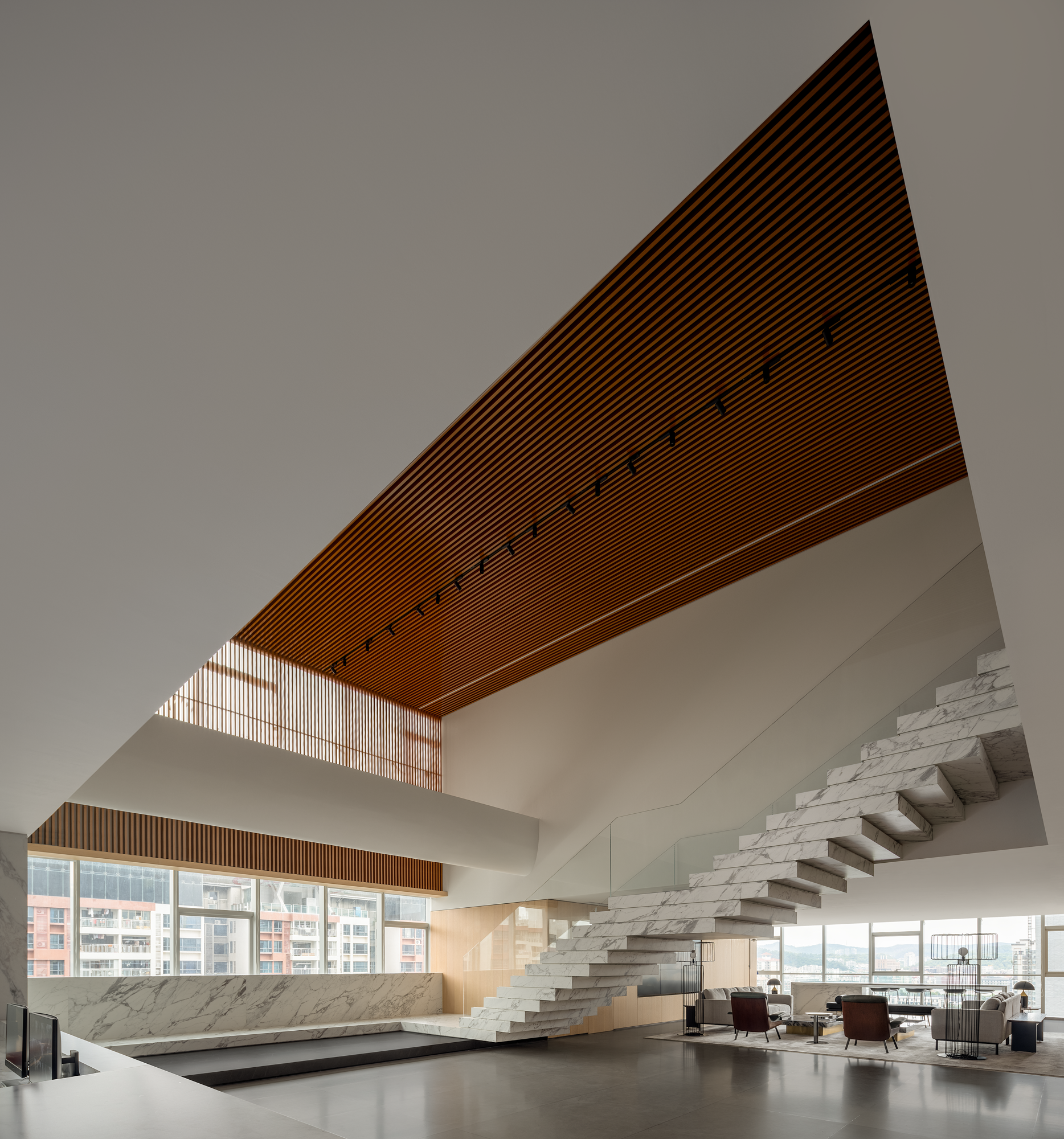 抽槽的大理石背景映衬着咬合式航海前台,天地两个“L"型形体转折,把视觉动线引导式的走向叠梯,放大上下尺度和左右延伸,让空间充满的探索性和视觉性。