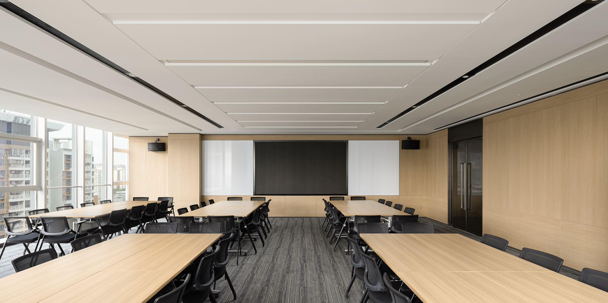 多功能组合变化式会议室,培训 会议都可进行,横竖向木纹墙板让整个空间链接形成一个整体。