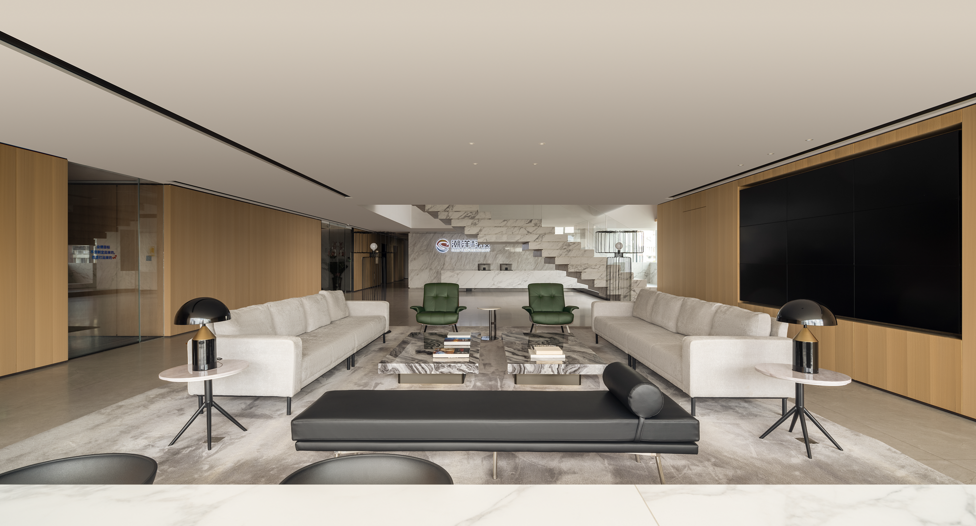 前台大理石背景材质延续到接待性会议室,纹理动线式引导,内外结合互不干扰。