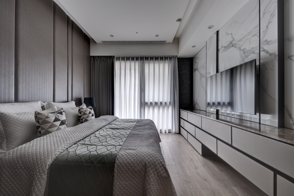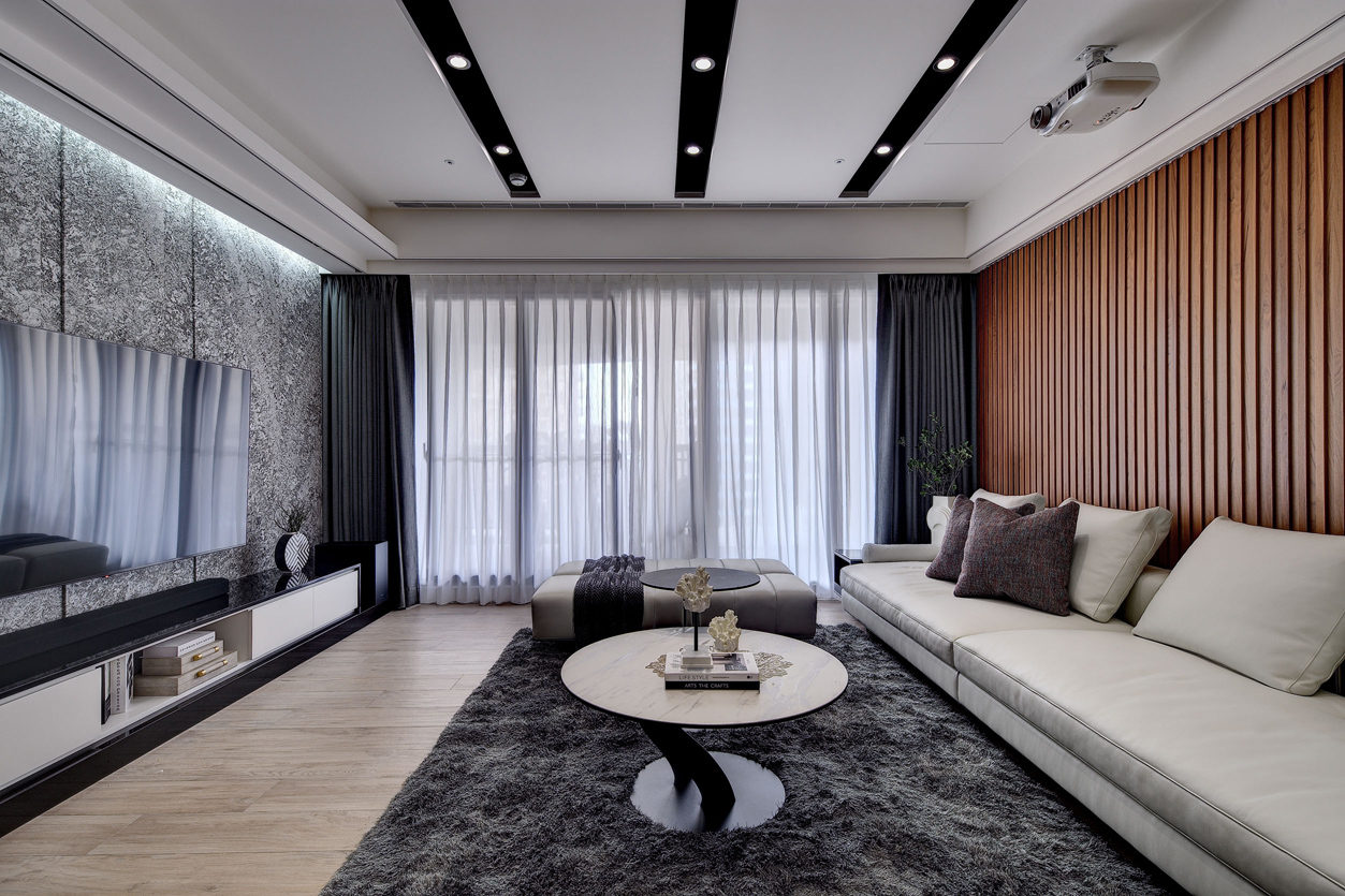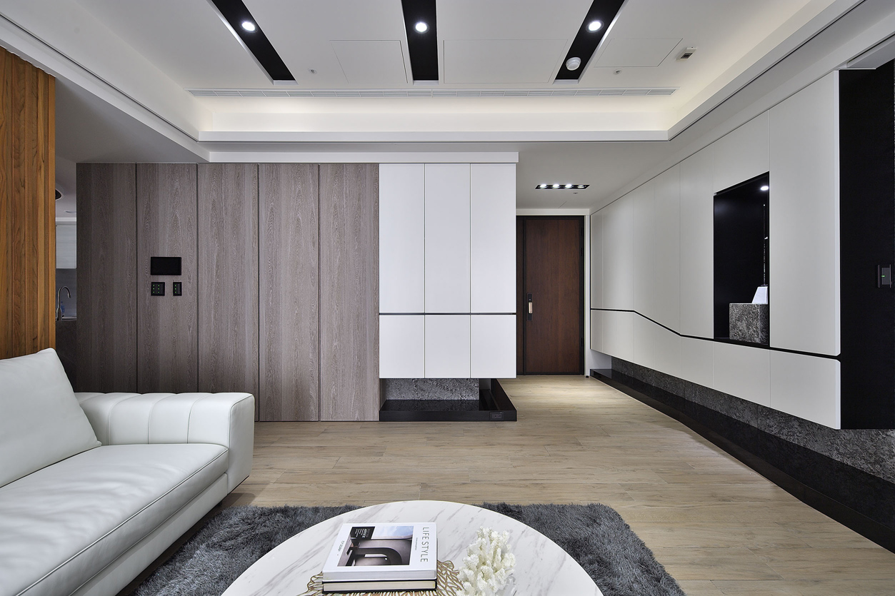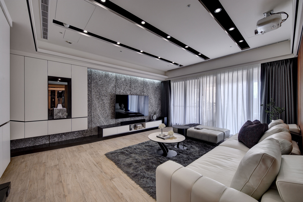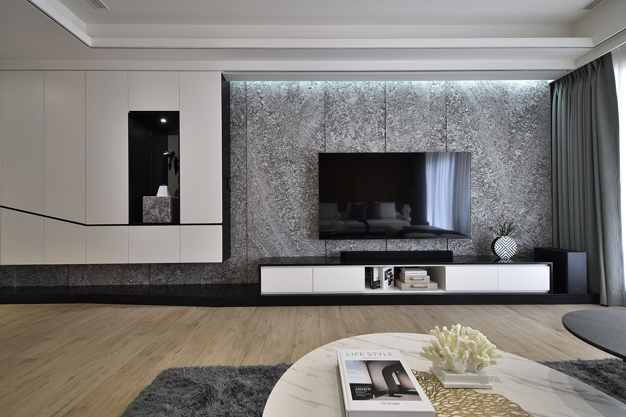 项目定位:全室以中性色調為主,如白色、灰色和黑色,營造出乾淨俐落的視覺效果。天花板、牆面及櫃體主要使用純白色,與灰色的電視牆面形成對比,展現簡約且高級的感覺,電視牆使用了大面積的灰色紋理石材,帶有自然肌理,增加空間的層次感和視覺焦點,地板採用淺木紋地板,增添溫暖且自然的元素,平衡現代設計的冷硬感。