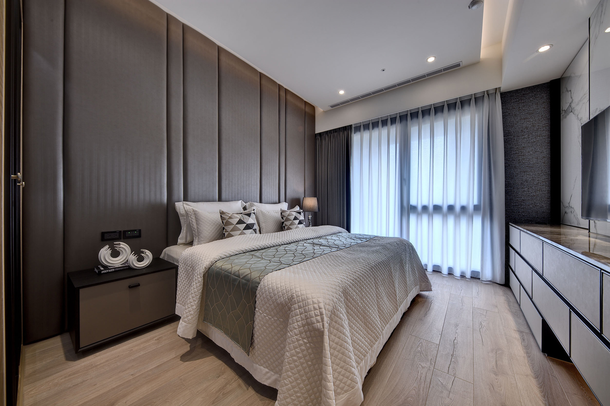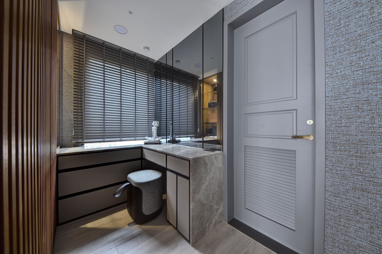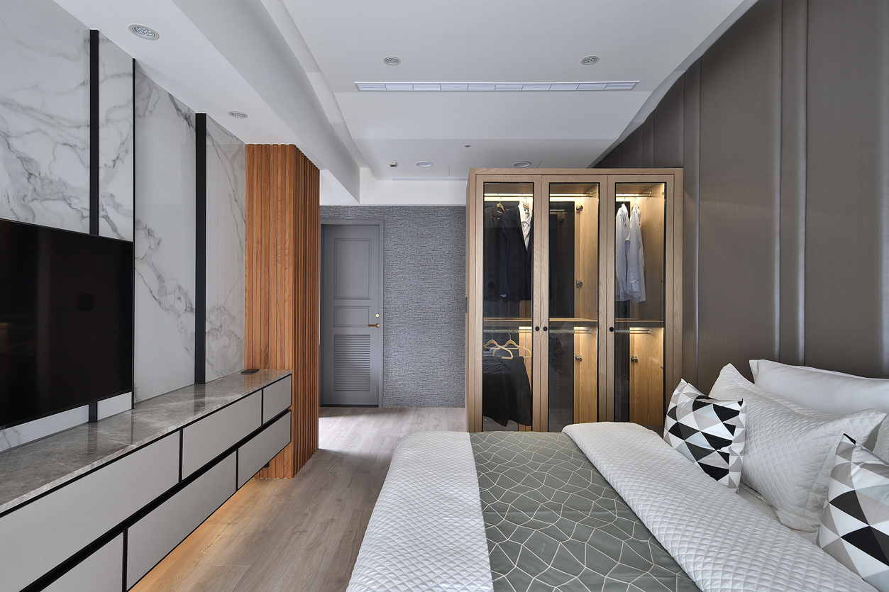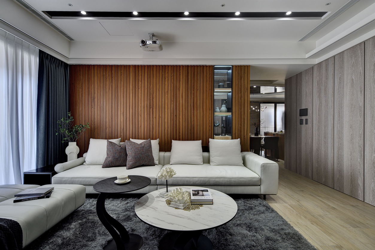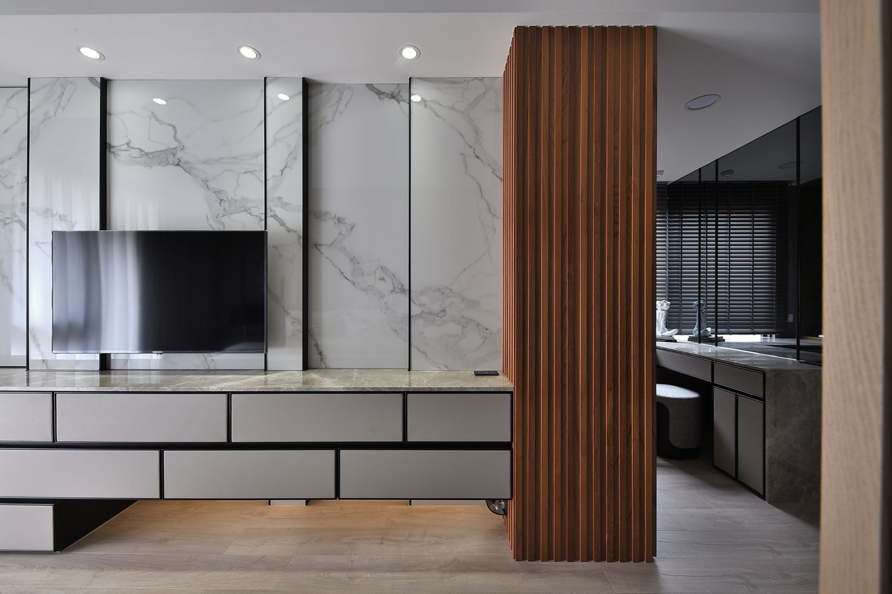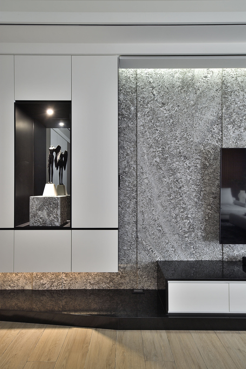 项目定位:全室以中性色調為主,如白色、灰色和黑色,營造出乾淨俐落的視覺效果。天花板、牆面及櫃體主要使用純白色,與灰色的電視牆面形成對比,展現簡約且高級的感覺,電視牆使用了大面積的灰色紋理石材,帶有自然肌理,增加空間的層次感和視覺焦點,地板採用淺木紋地板,增添溫暖且自然的元素,平衡現代設計的冷硬感。